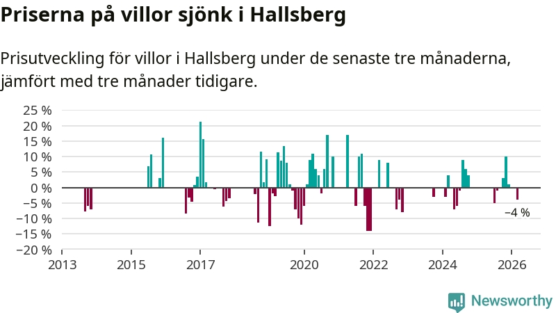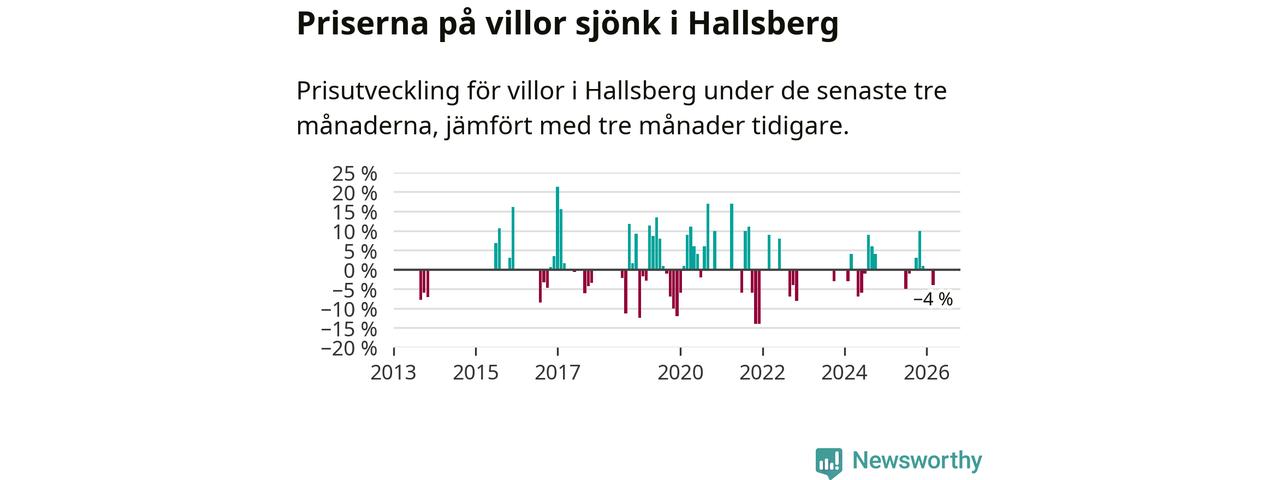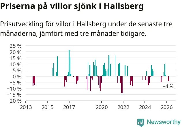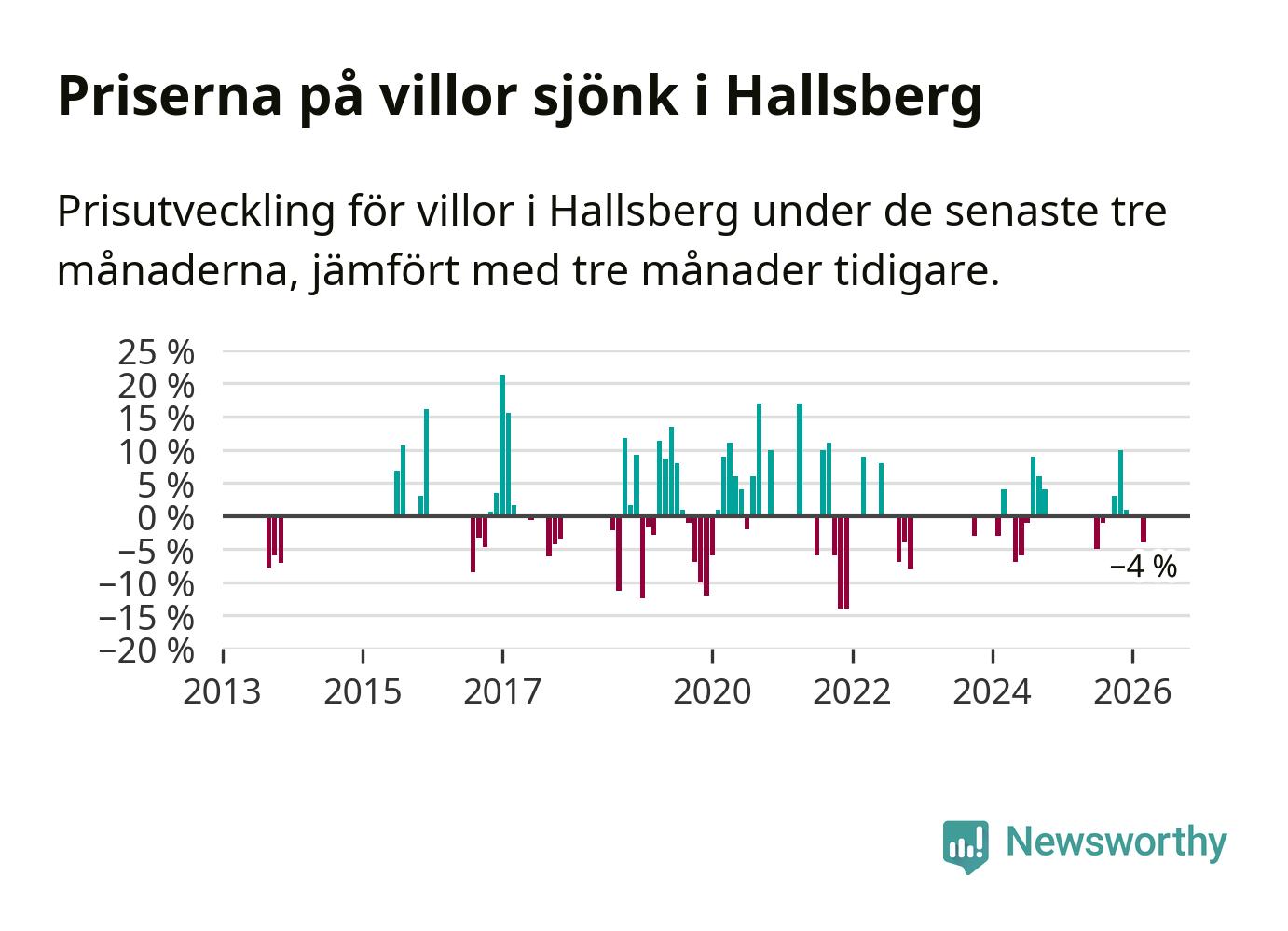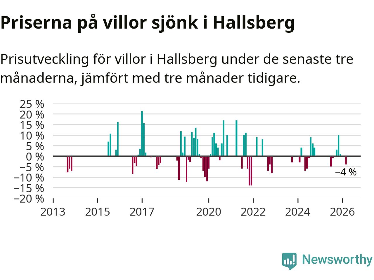 Statistiken visar även på en kännbar prisnedgång i Hallsbergs kommun. Medelpriset på försäljningarna av villor i kommunen var 4 procent lägre än för tre månader sedan. I hela Örebro däremot ökar villapriserna. I hela länet noterades en prisuppgång på 1 procent.
