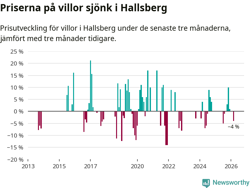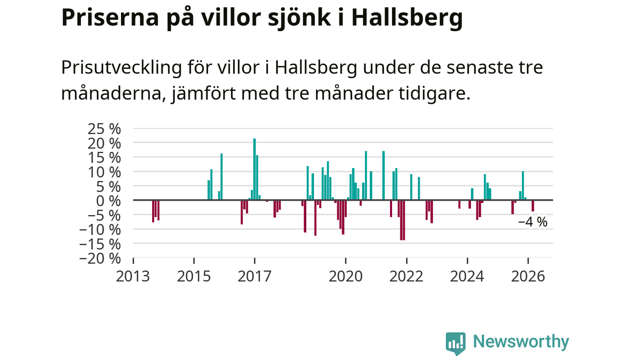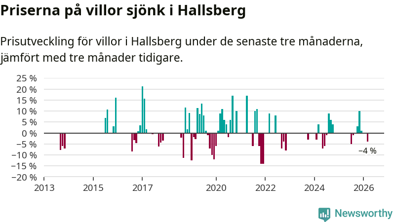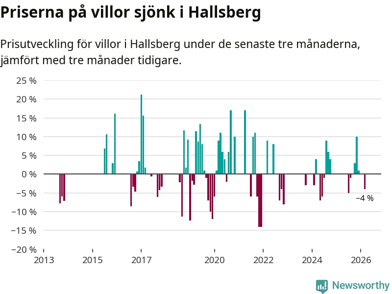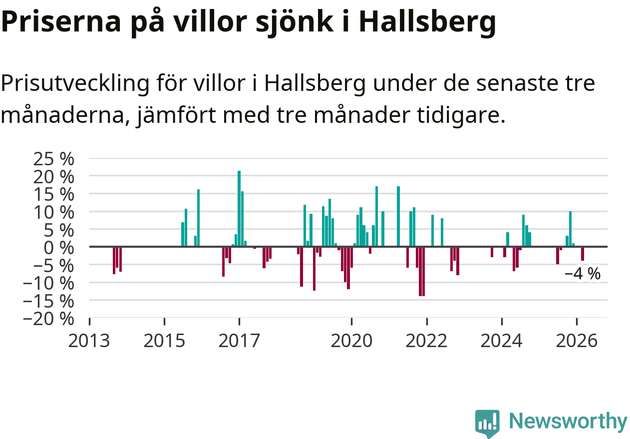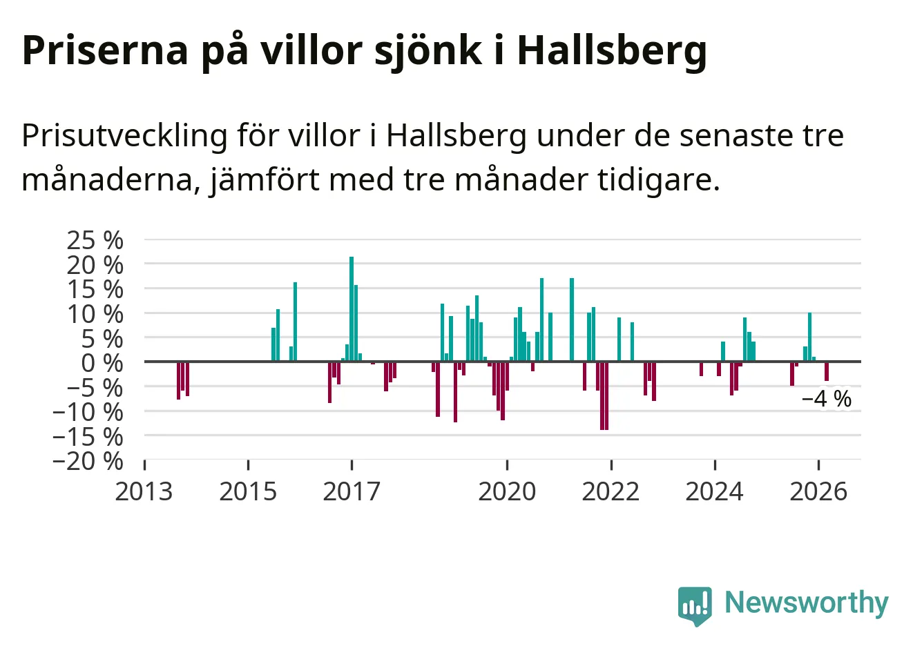 Statistiken visar även på en kännbar prisnedgång i Hallsbergs kommun. Medelpriset på försäljningarna av villor i kommunen var 4 procent lägre än för tre månader sedan. I hela Örebro däremot ökar villapriserna. I hela länet noterades en prisuppgång på 1 procent.