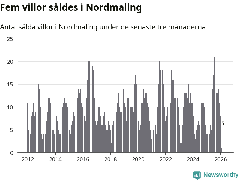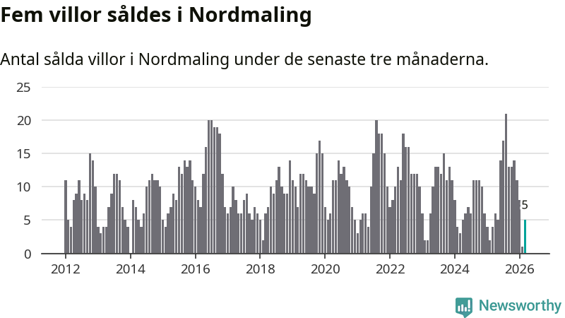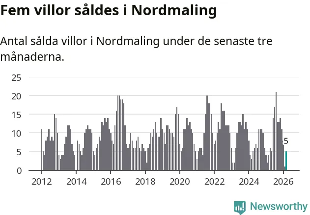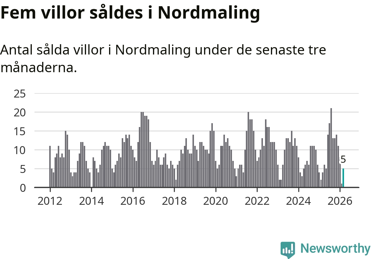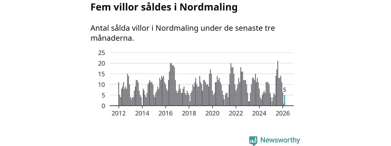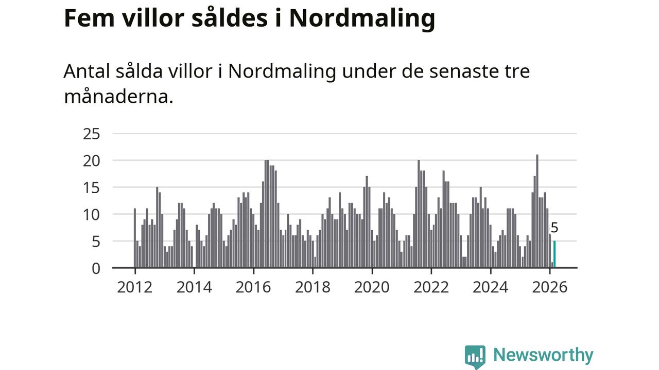 Mellan januari och mars gjordes sammanlagt fem affärer med villor i Nordmalings kommun. Det kan jämföras med fyra vid motsvarande tid i fjol.
