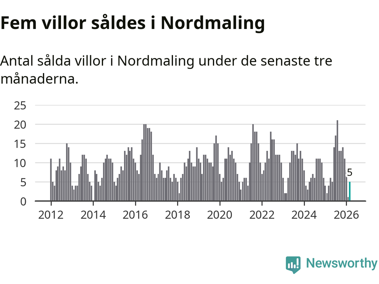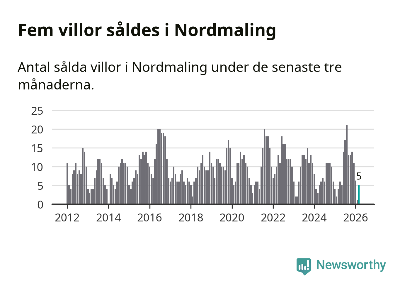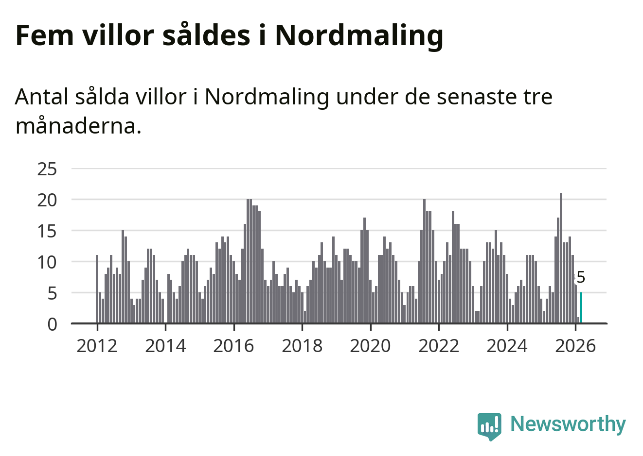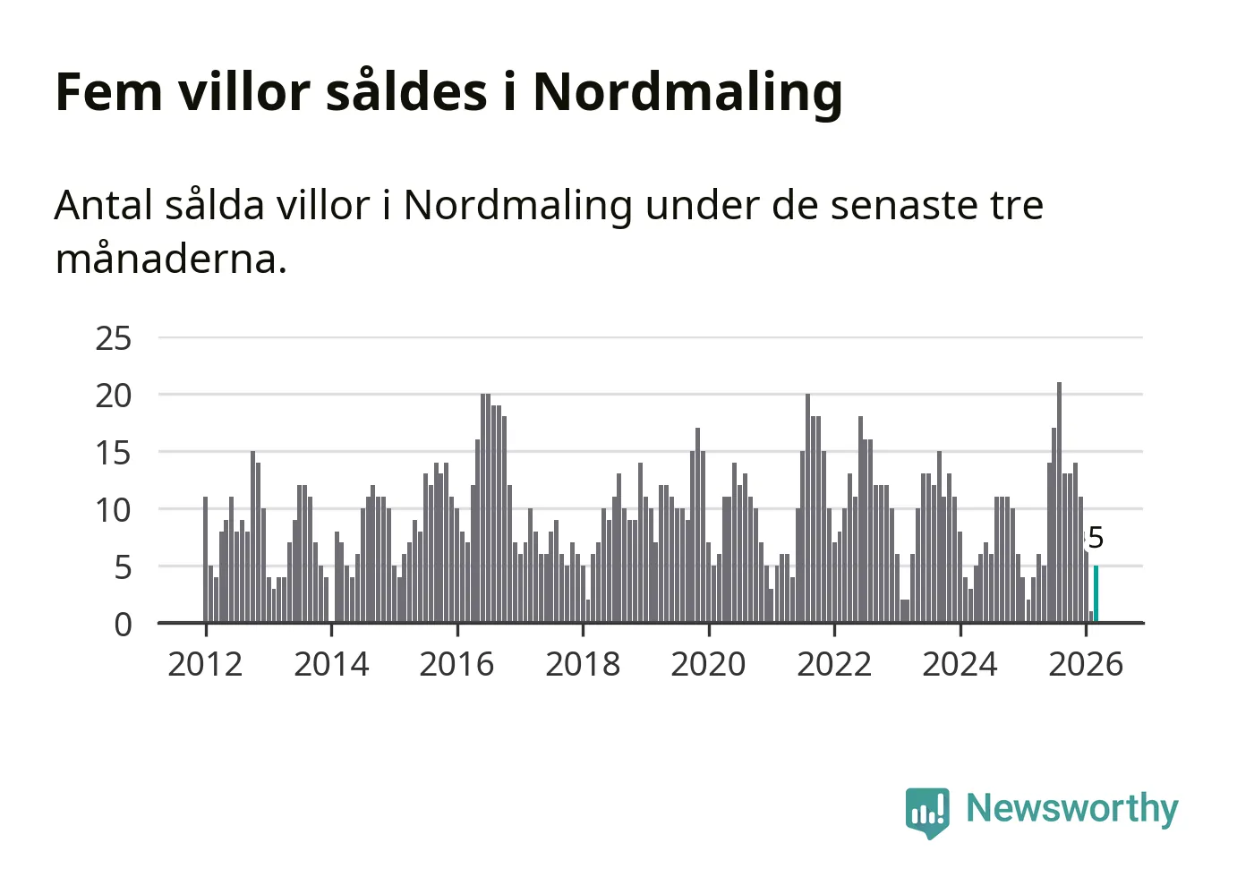 Mellan januari och mars gjordes sammanlagt fem affärer med villor i Nordmalings kommun. Det kan jämföras med fyra vid motsvarande tid i fjol.