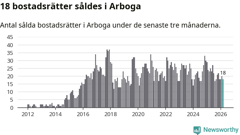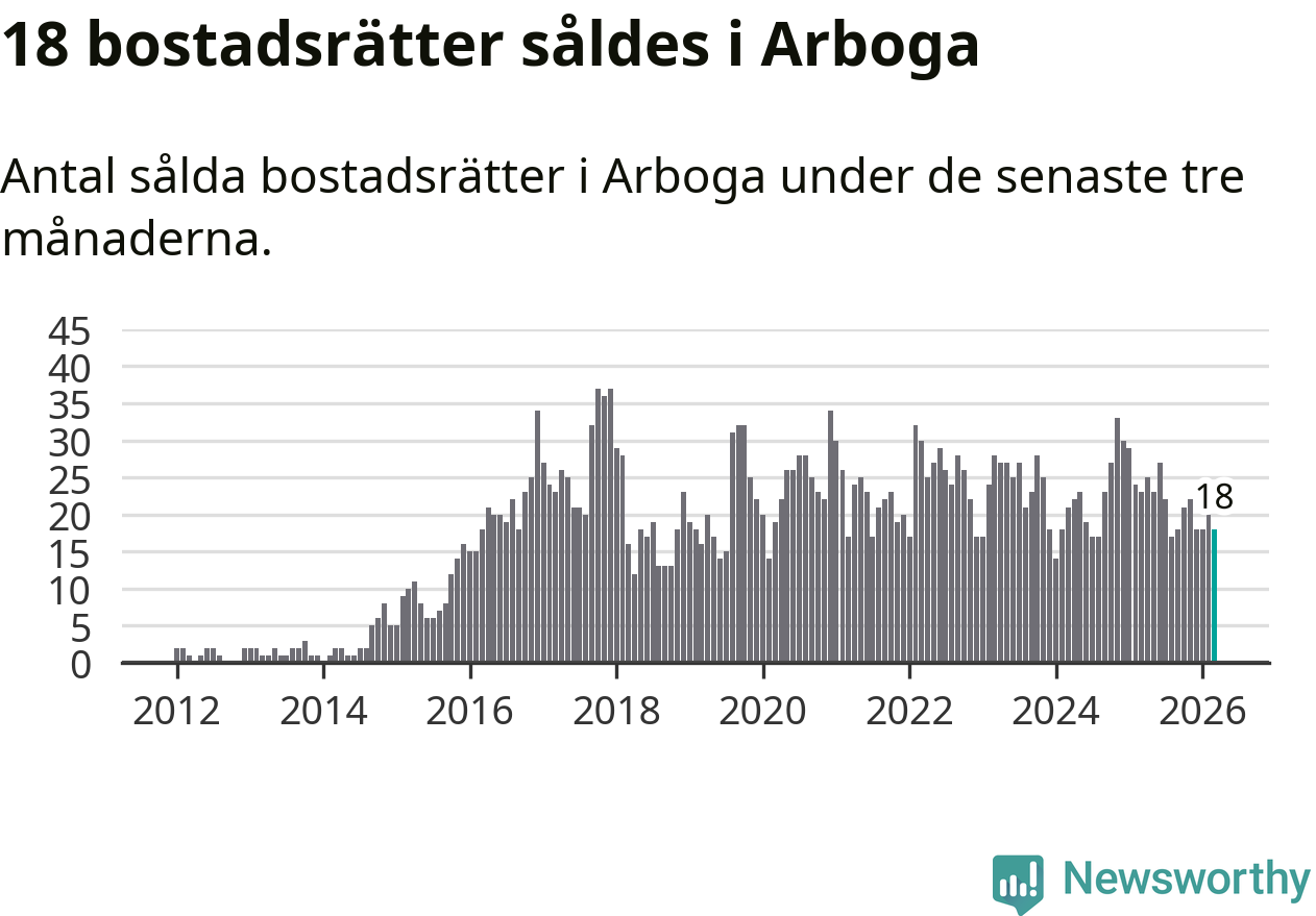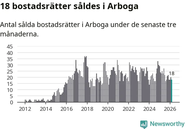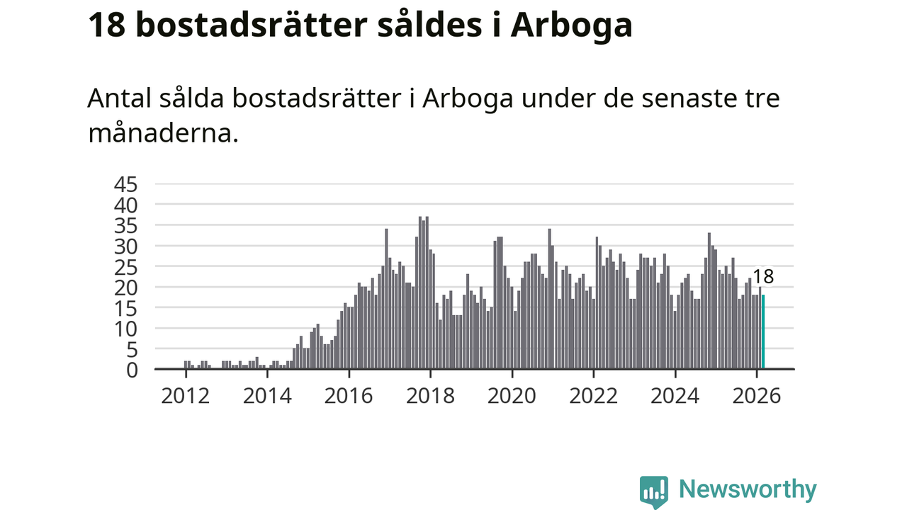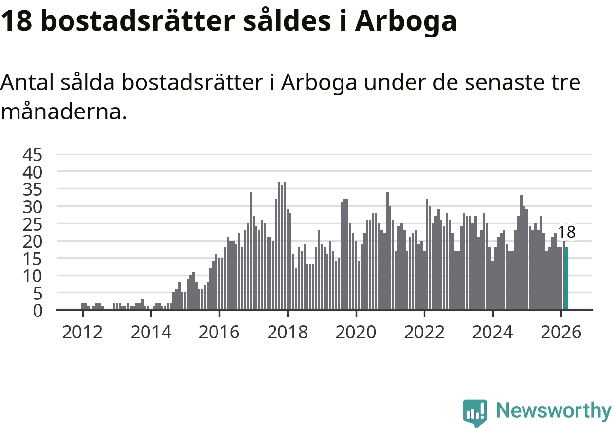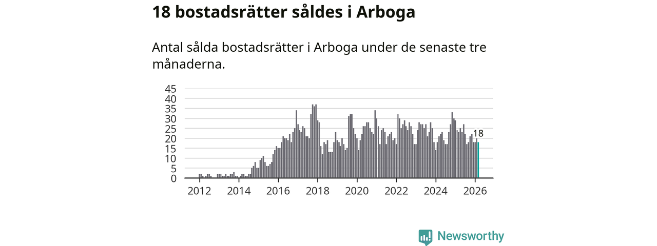 Mellan januari och mars gjordes sammanlagt 18 affärer med bostadsrätter i Arboga kommun. Det kan jämföras med 23 vid motsvarande tid i fjol.