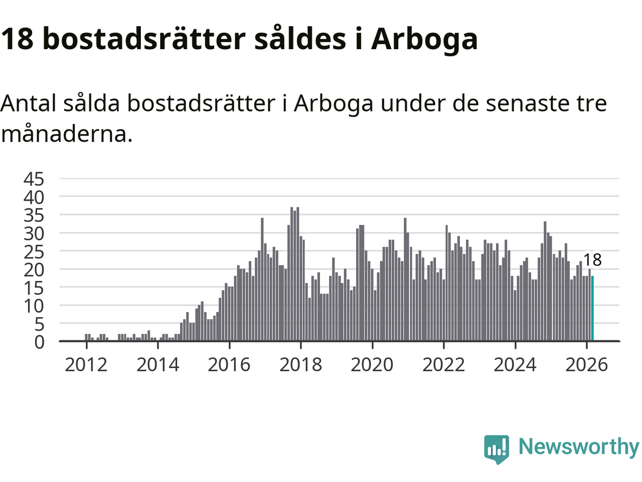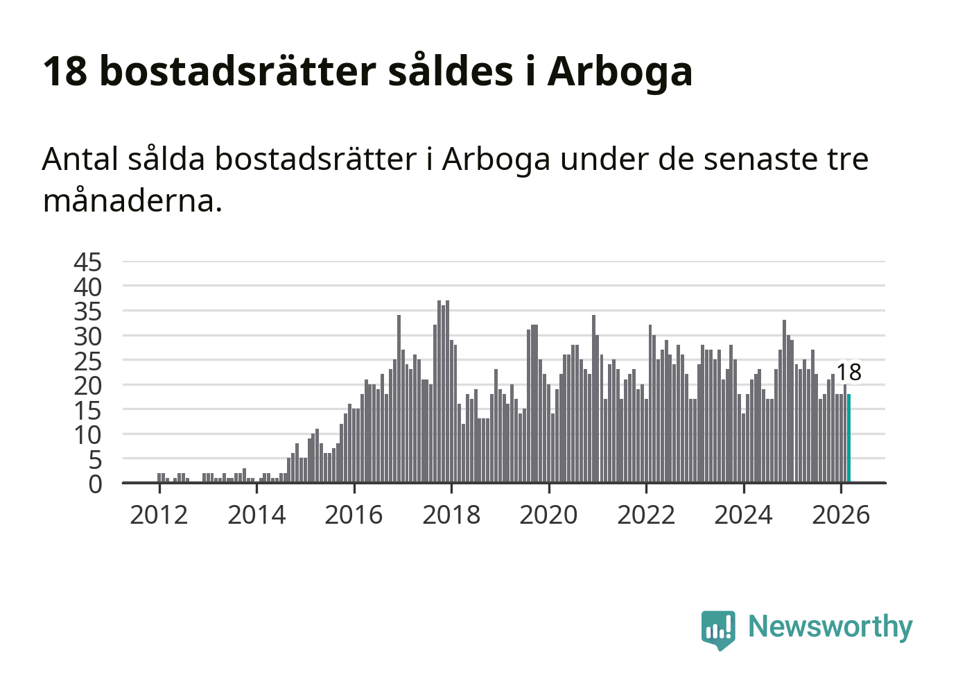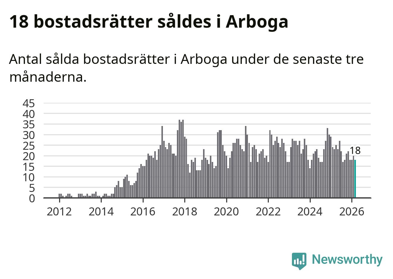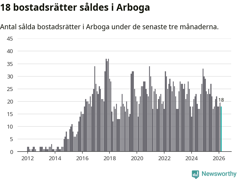 Mellan januari och mars gjordes sammanlagt 18 affärer med bostadsrätter i Arboga kommun. Det kan jämföras med 23 vid motsvarande tid i fjol.