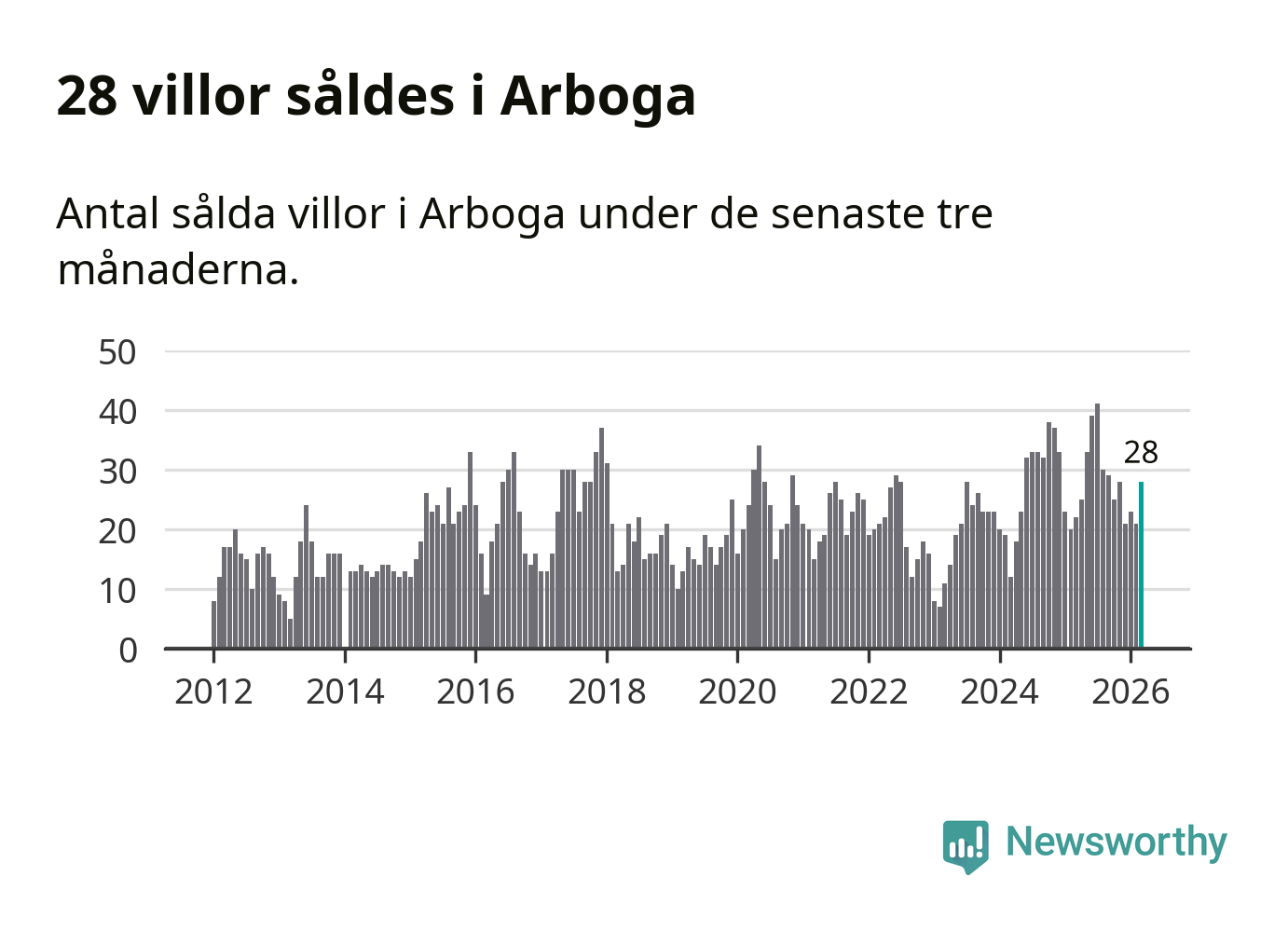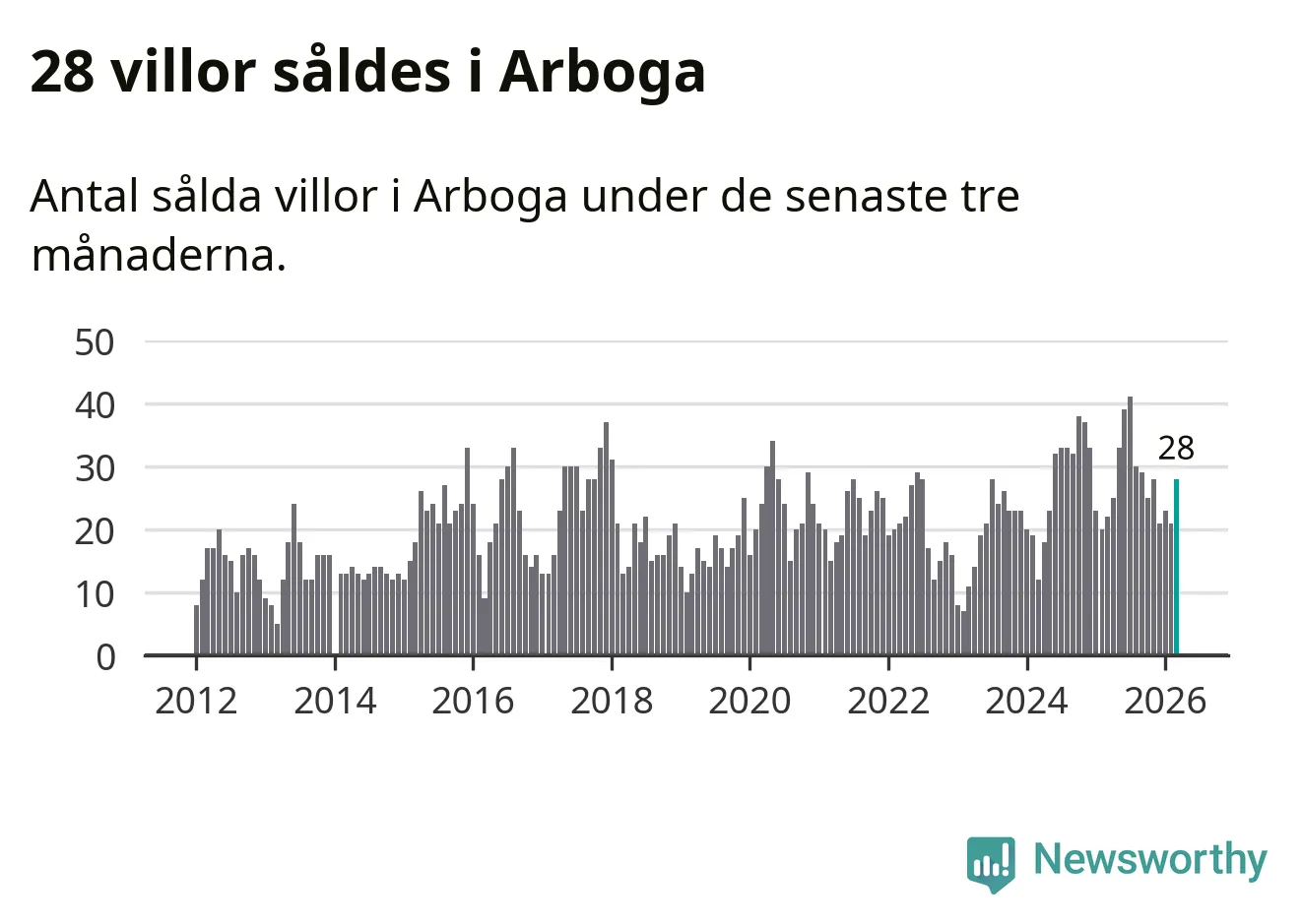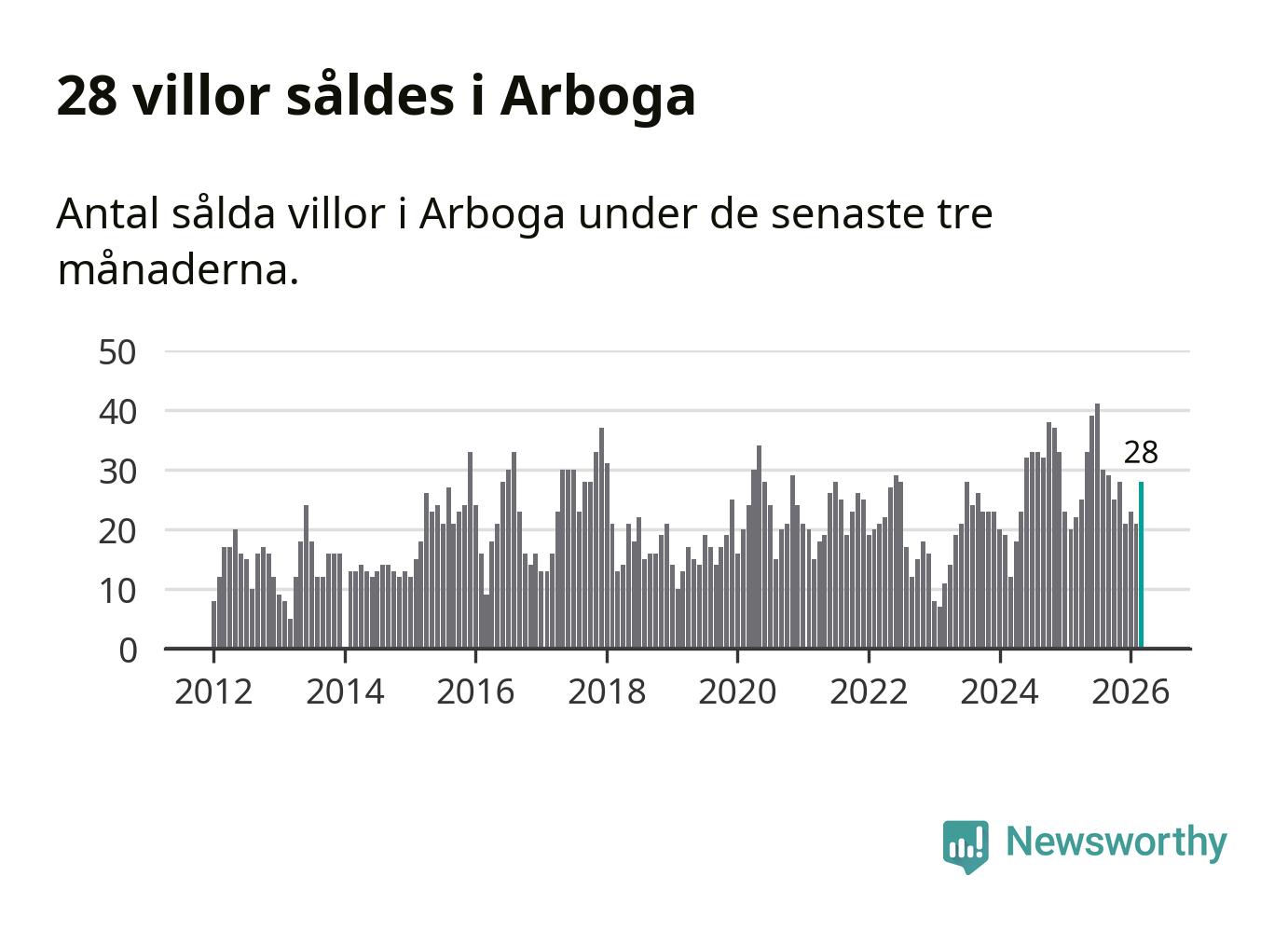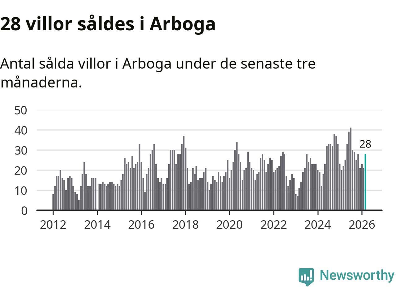Mellan januari och mars gjordes sammanlagt 28 affärer med villor i Arboga kommun. Det kan jämföras med 22 vid motsvarande tid i fjol.