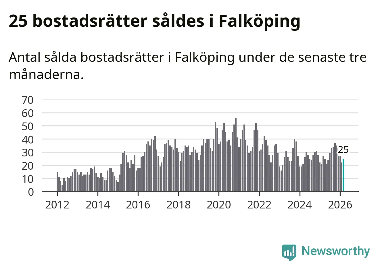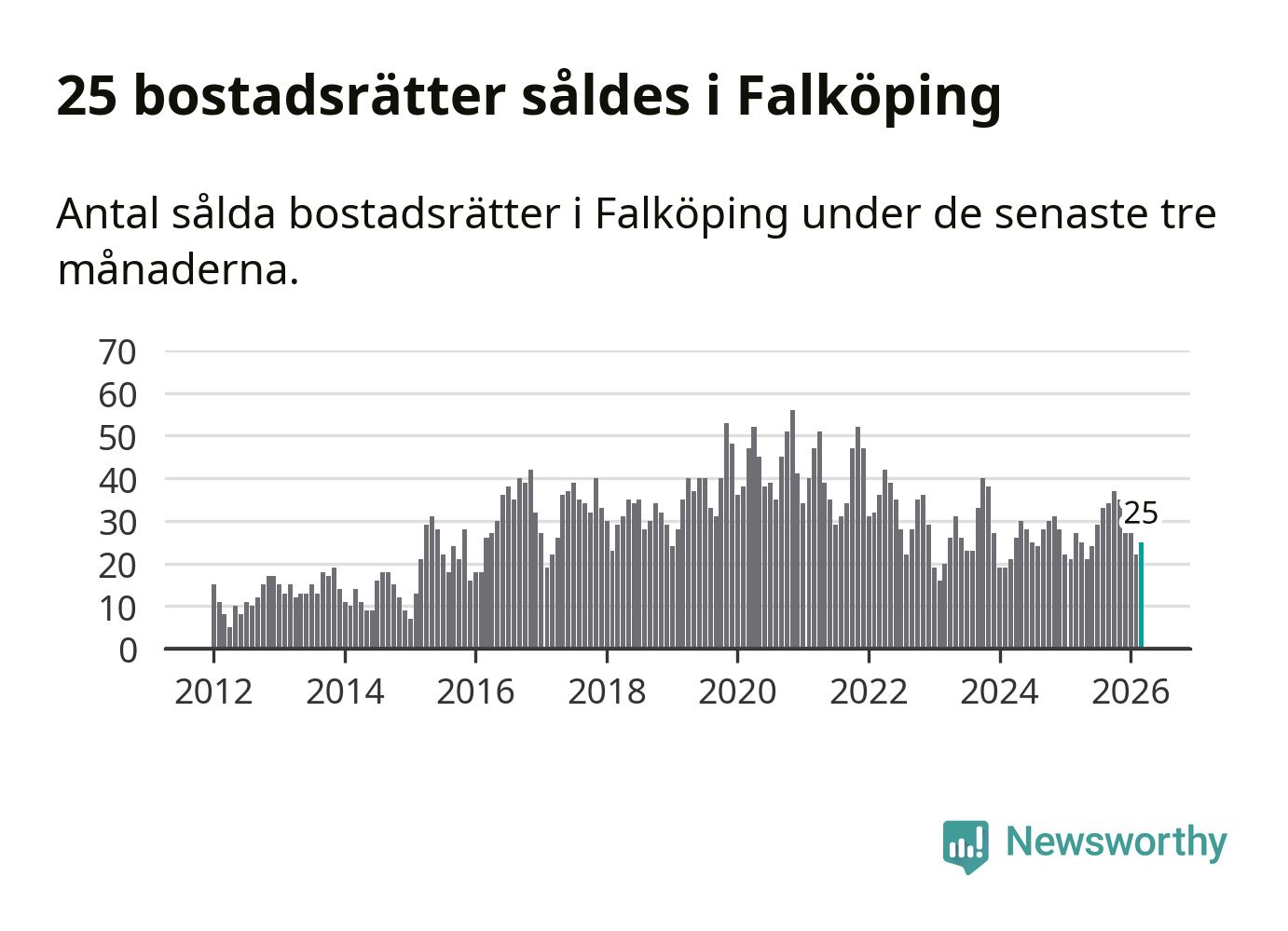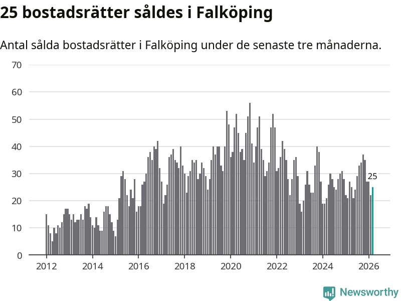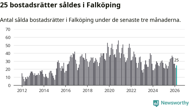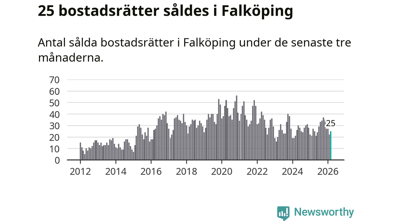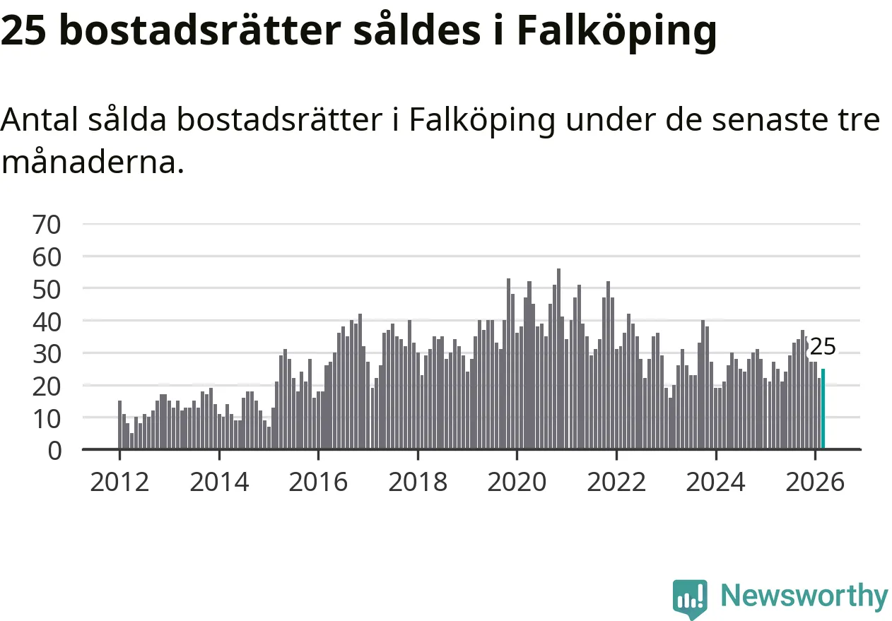 Mellan januari och mars gjordes sammanlagt 25 affärer med bostadsrätter i Falköpings kommun. Det kan jämföras med 27 vid motsvarande tid i fjol.