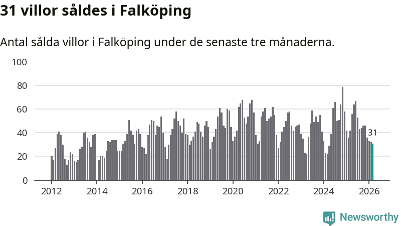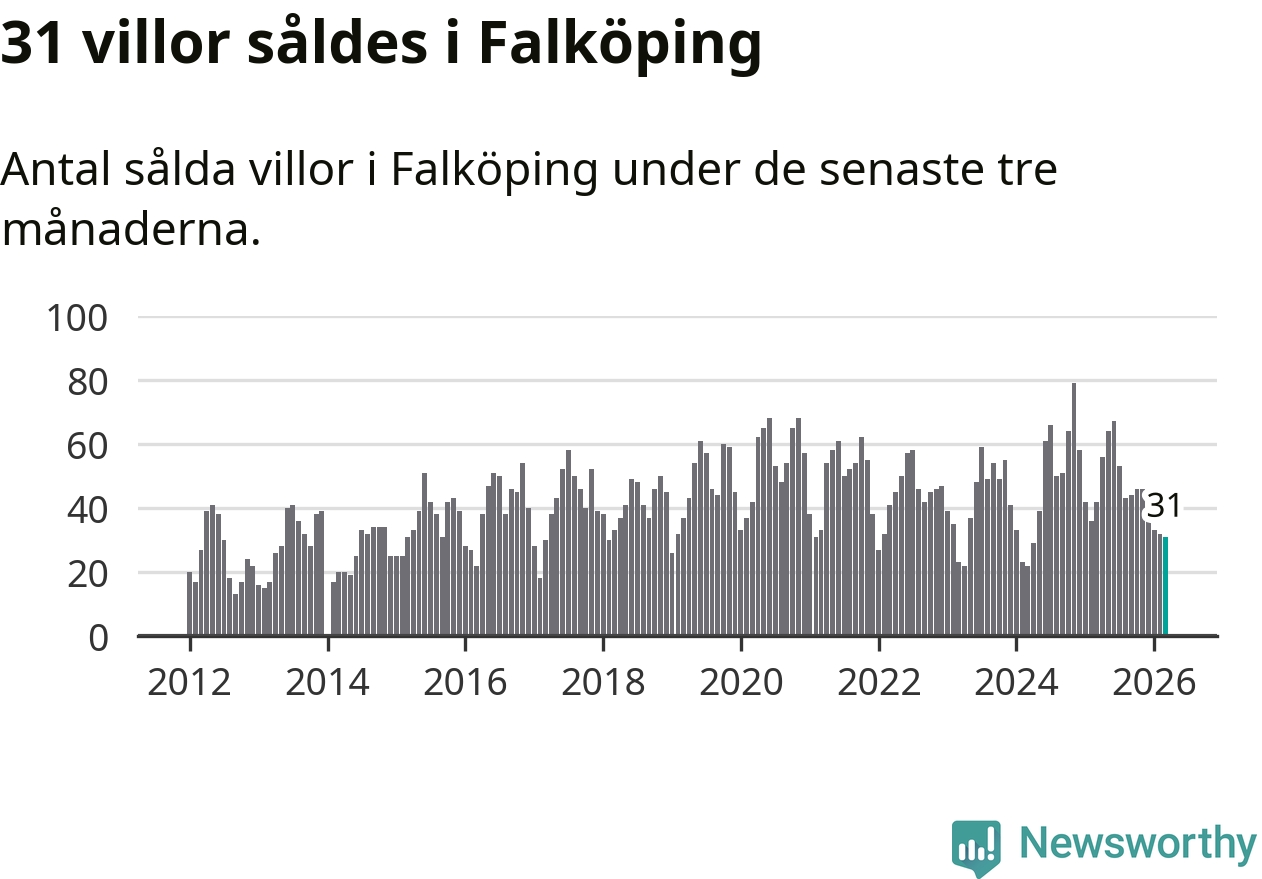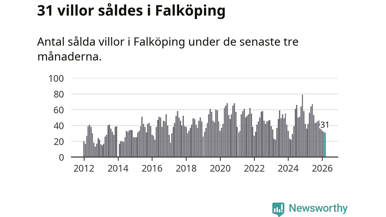 Sammanlagt såldes 31 villor i Falköpings kommun mellan januari och mars till ett genomsnittligt pris på 2,1 miljoner kronor. I fjol gjordes 42 affärer vid den här tiden på året.