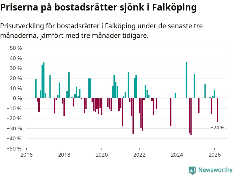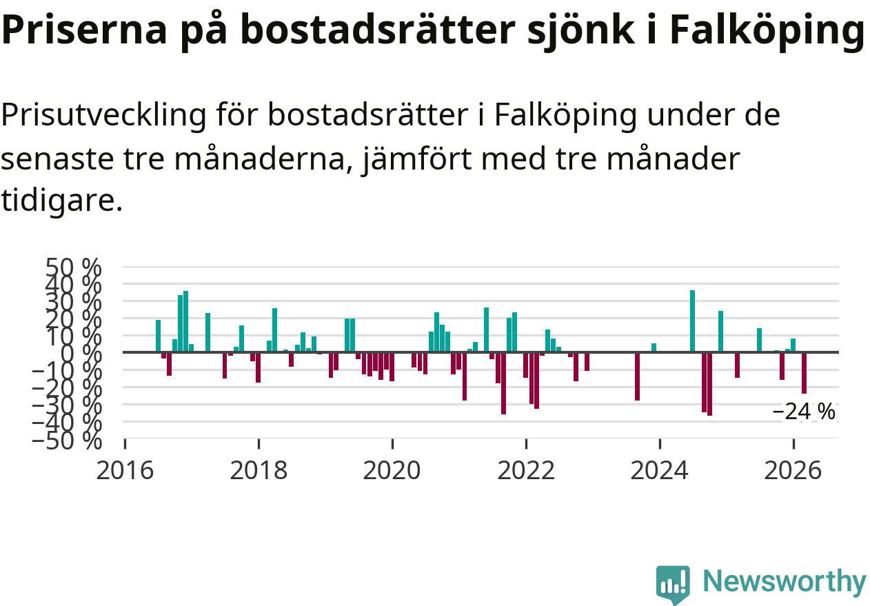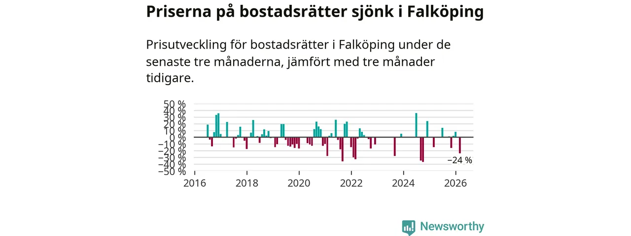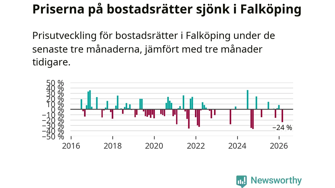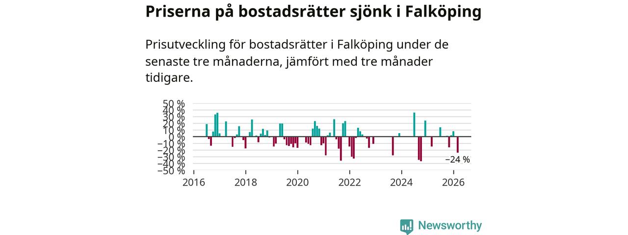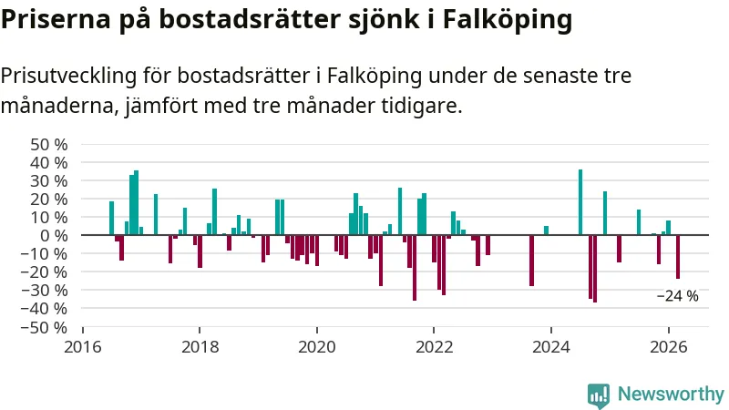 Statistiken visar även på en stor prisnedgång i Falköpings kommun. Medelpriset på försäljningarna av bostadsrätter i kommunen var 24 procent lägre än för tre månader sedan. I hela Västra Götaland däremot ökar priserna på bostadsrätter. I hela länet noterades en prisuppgång på 3 procent.