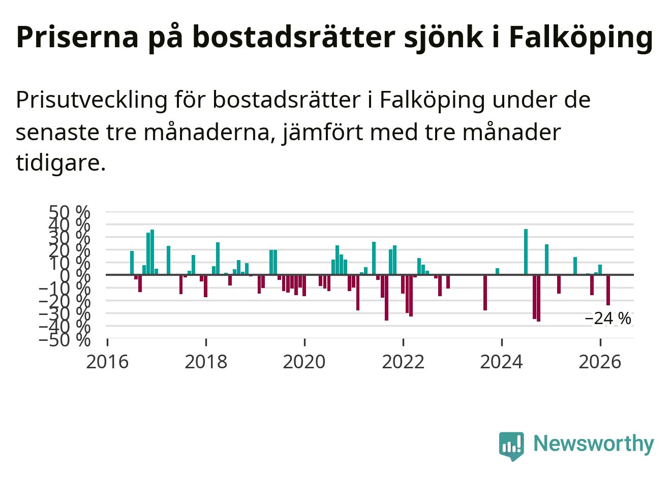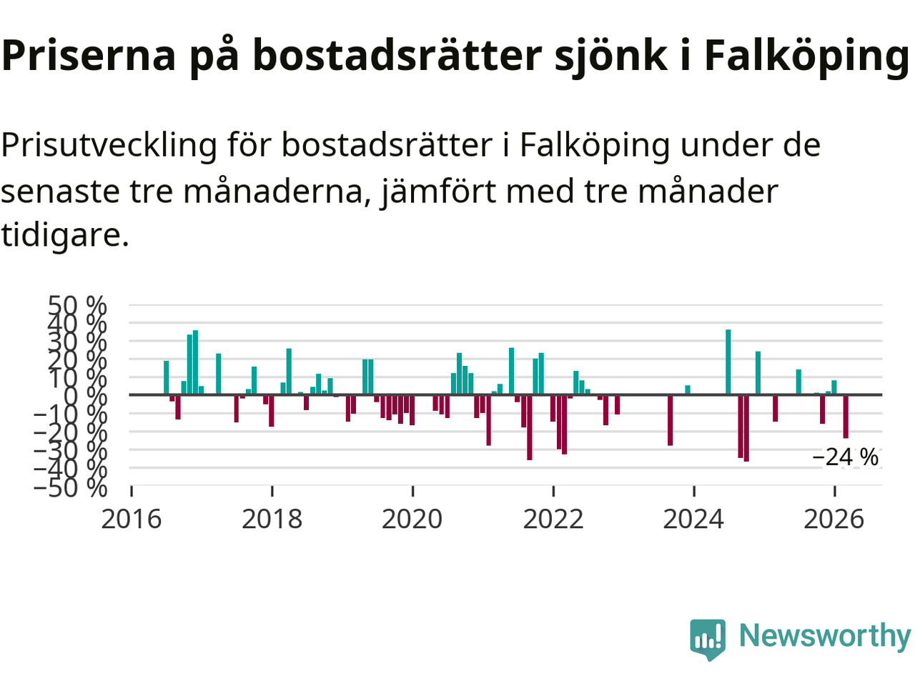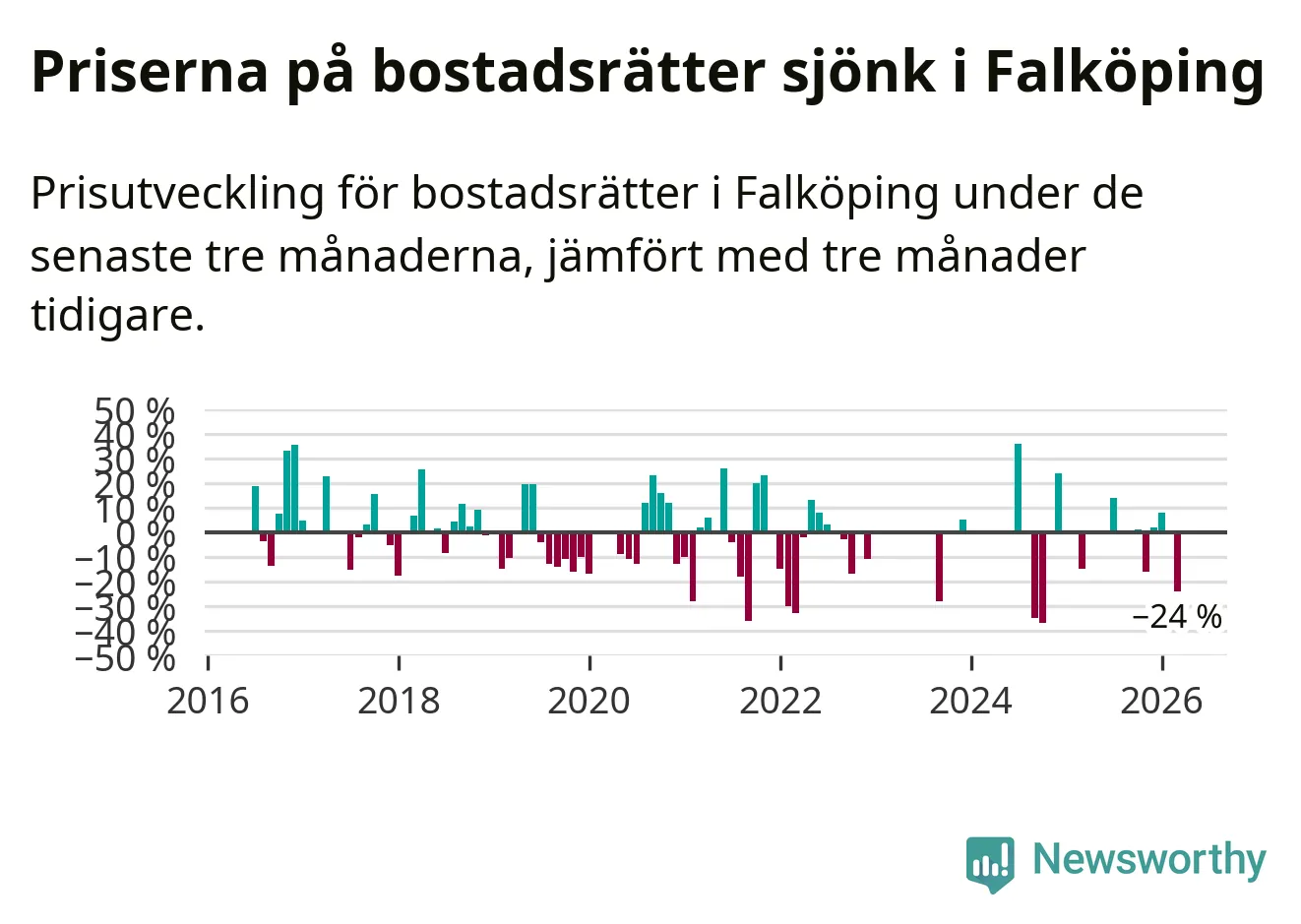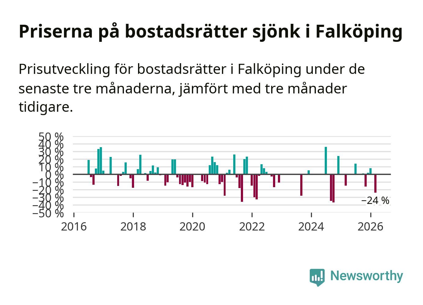 Statistiken visar även på en stor prisnedgång i Falköpings kommun. Medelpriset på försäljningarna av bostadsrätter i kommunen var 24 procent lägre än för tre månader sedan. I hela Västra Götaland däremot ökar priserna på bostadsrätter. I hela länet noterades en prisuppgång på 3 procent.