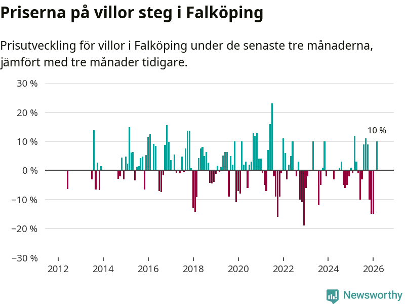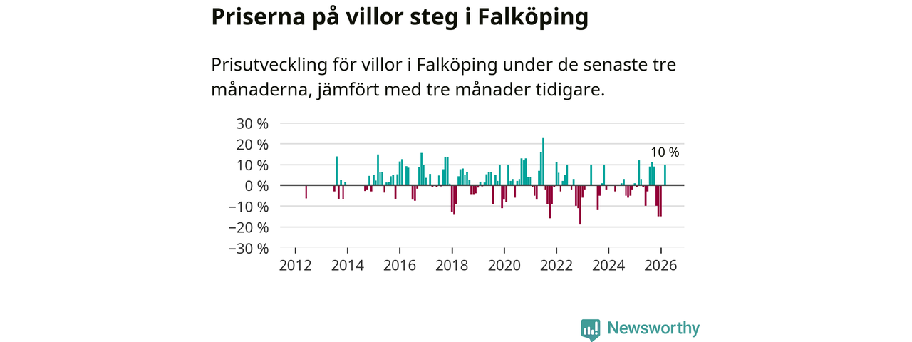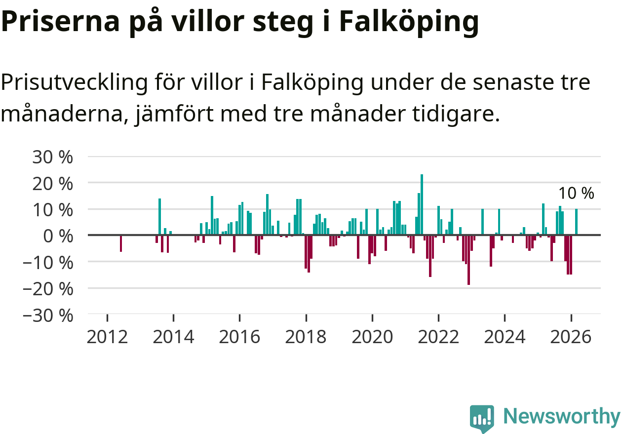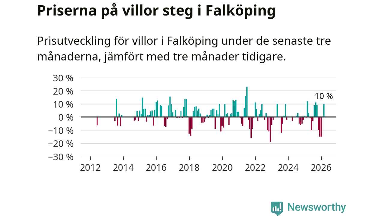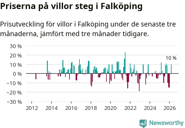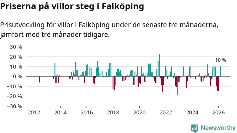 Villapriserna steg mellan januari och mars med 10 procent i Falköpings kommun. Det är en betydande uppgång jämfört med det gångna året då priserna i snitt sjunkit med 1 procent.