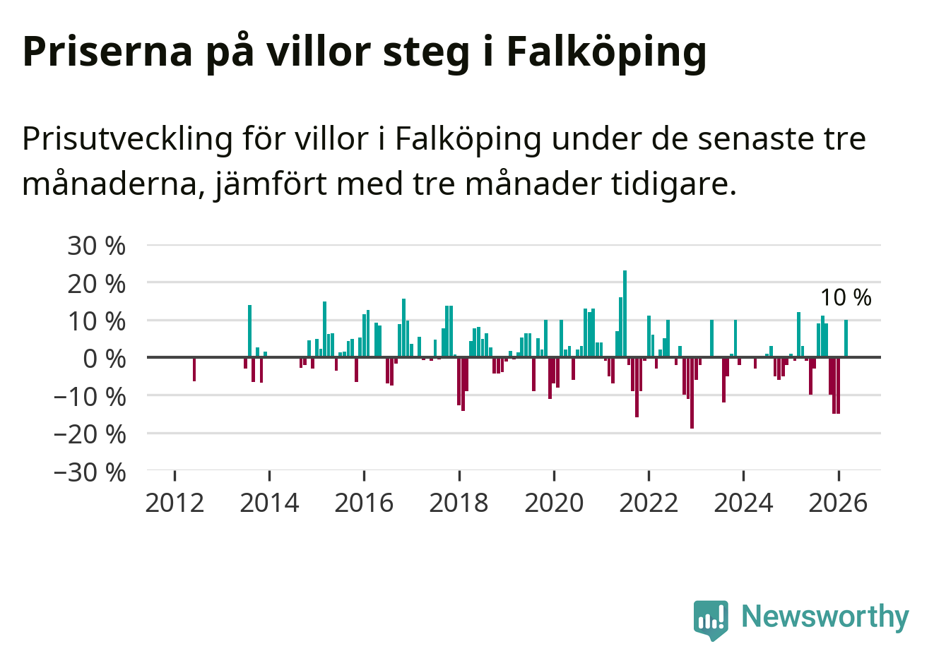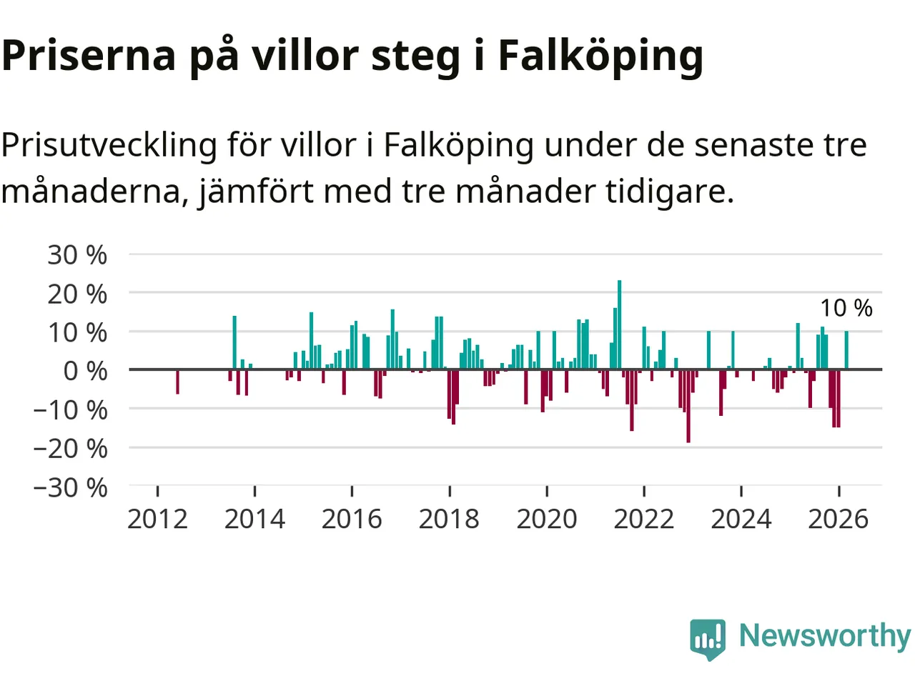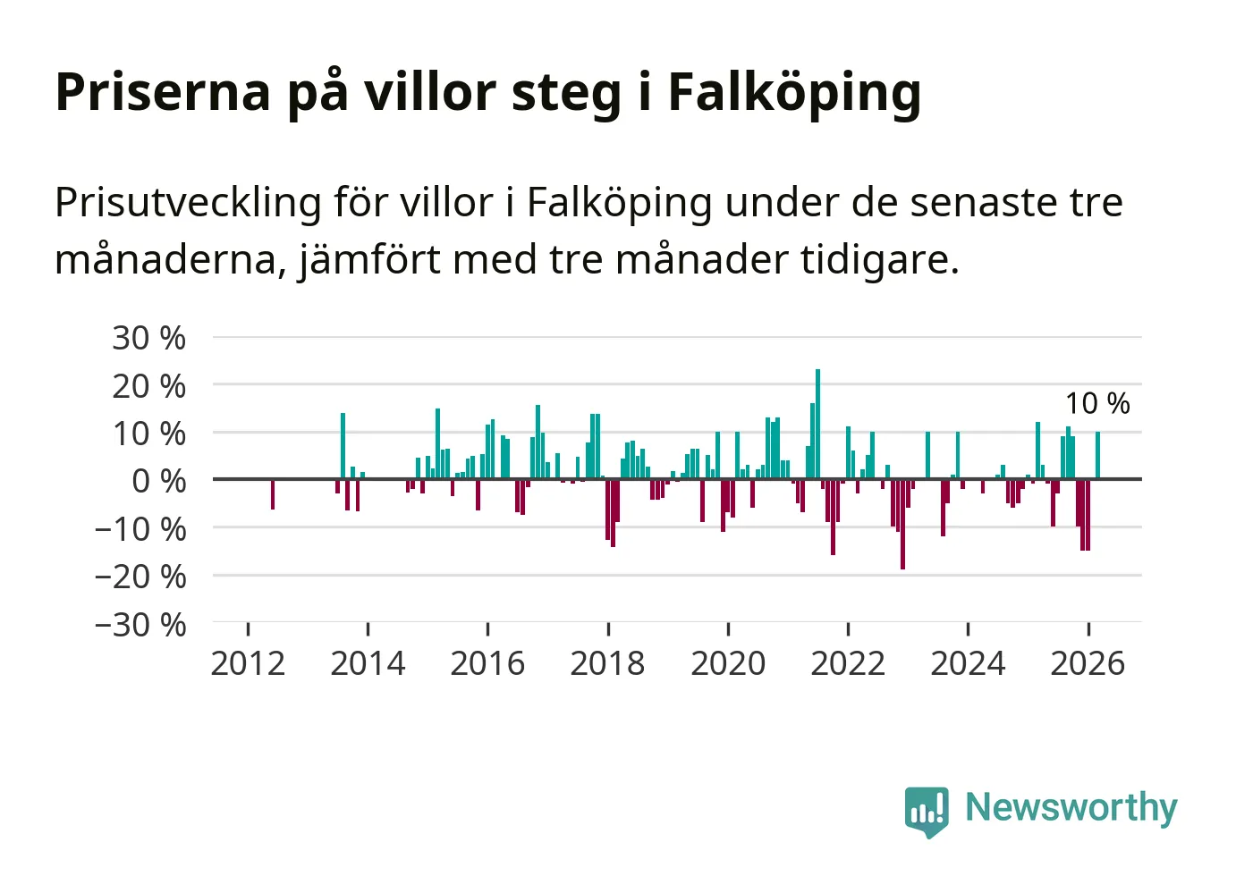 Villapriserna steg mellan januari och mars med 10 procent i Falköpings kommun. Det är en betydande uppgång jämfört med det gångna året då priserna i snitt sjunkit med 1 procent.