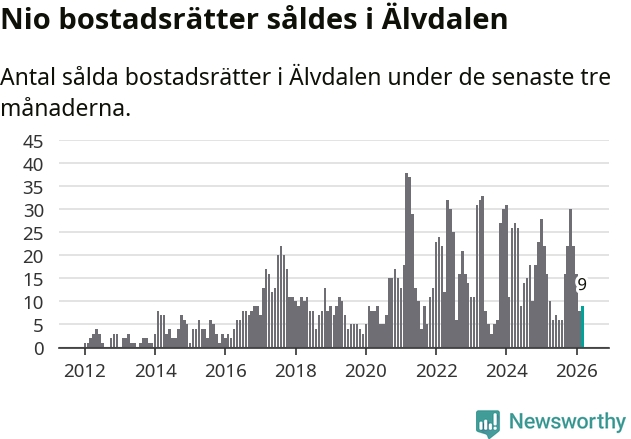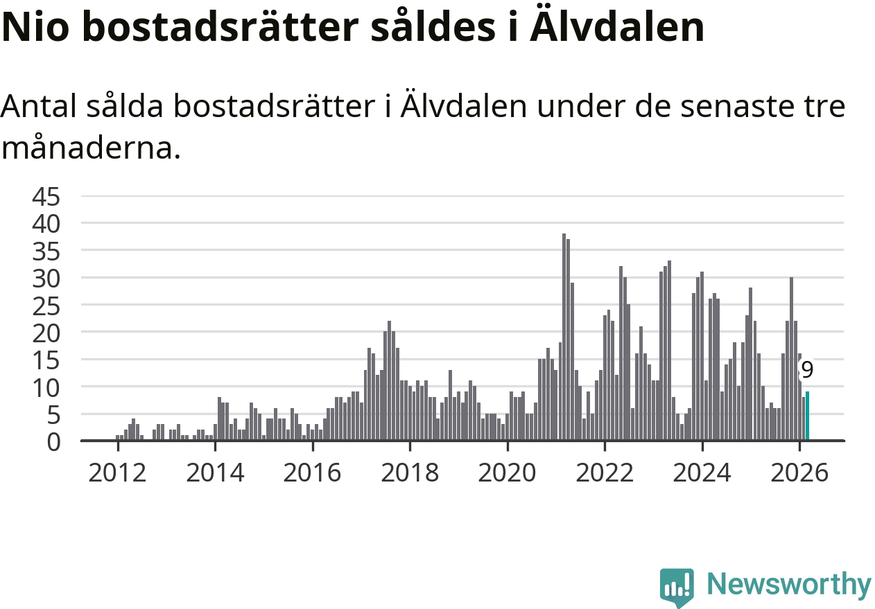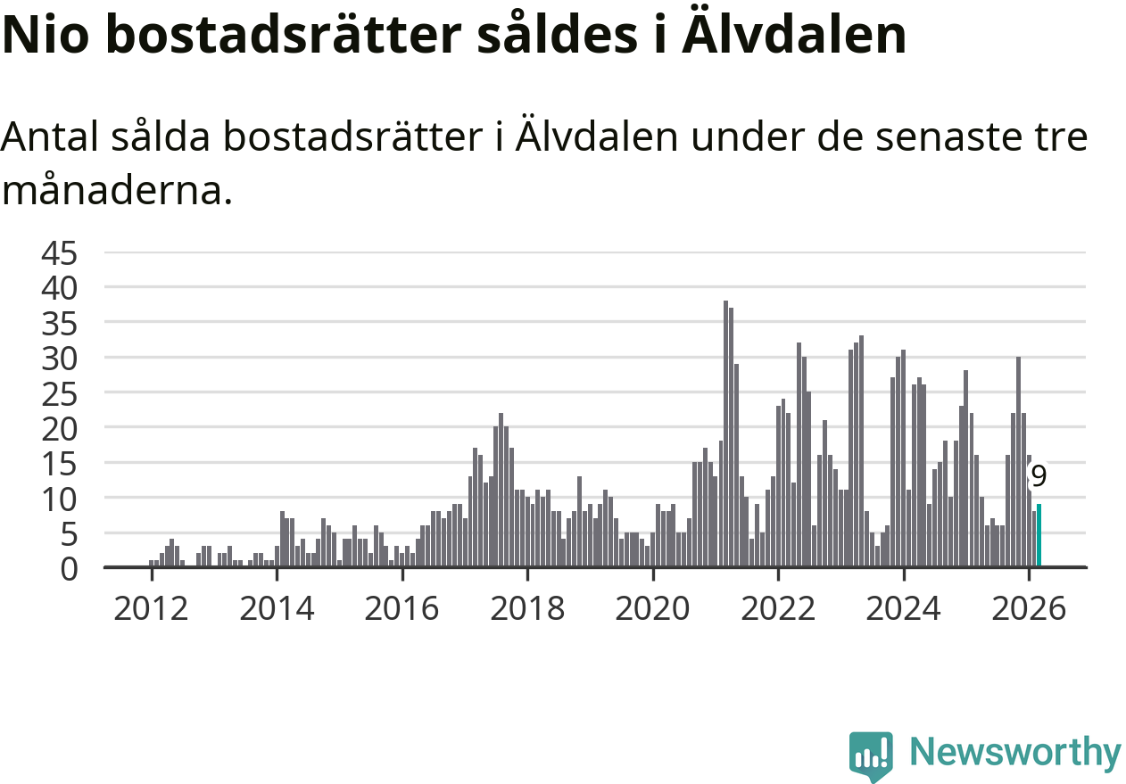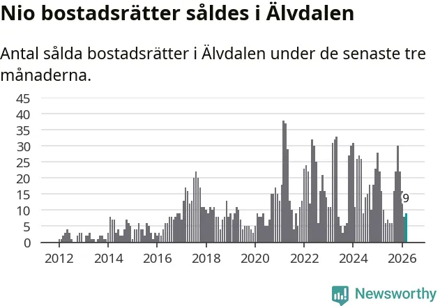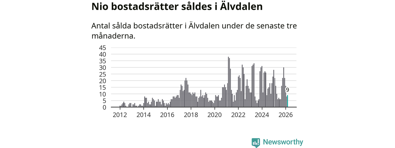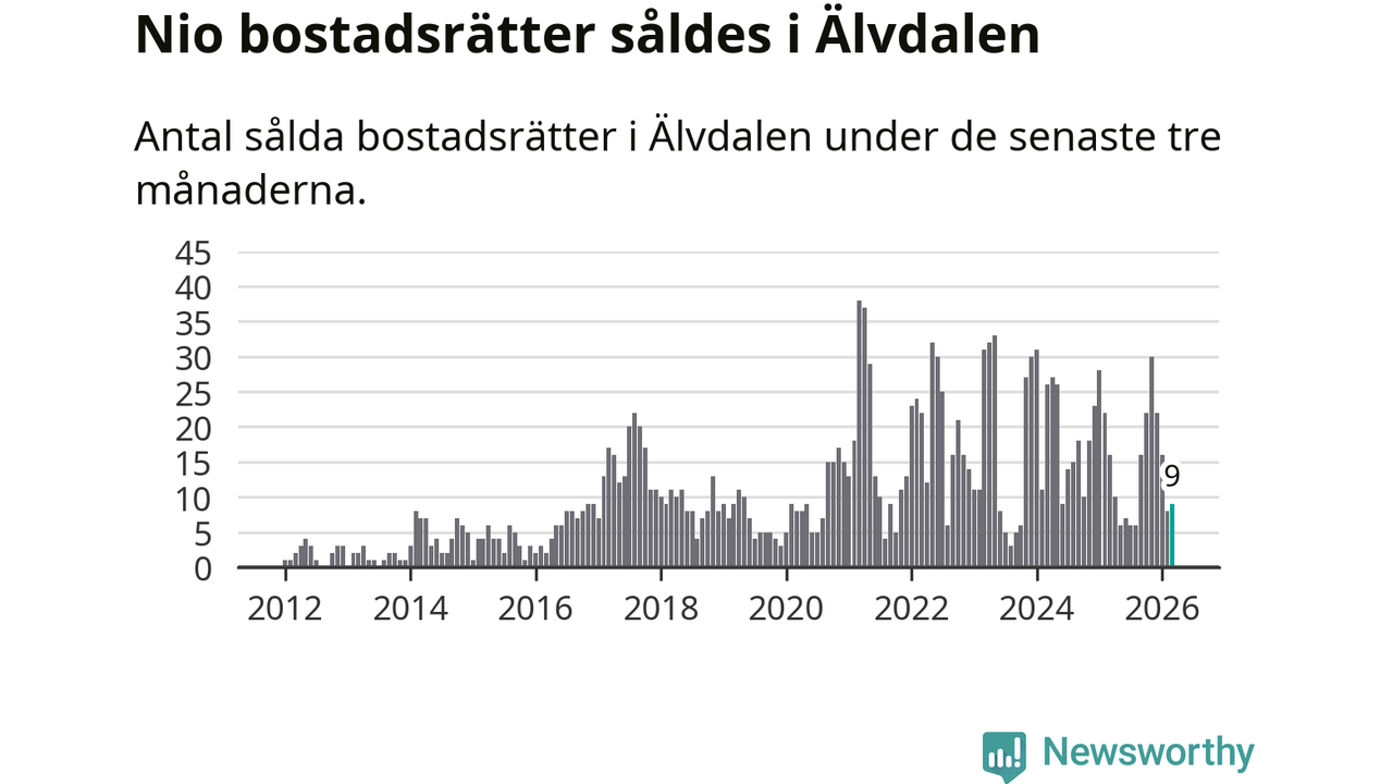 Mellan januari och mars gjordes sammanlagt nio affärer med bostadsrätter i Älvdalens kommun. Det kan jämföras med 16 vid motsvarande tid i fjol.