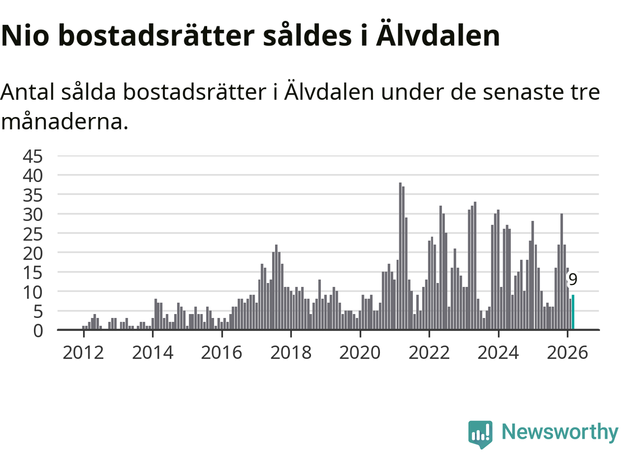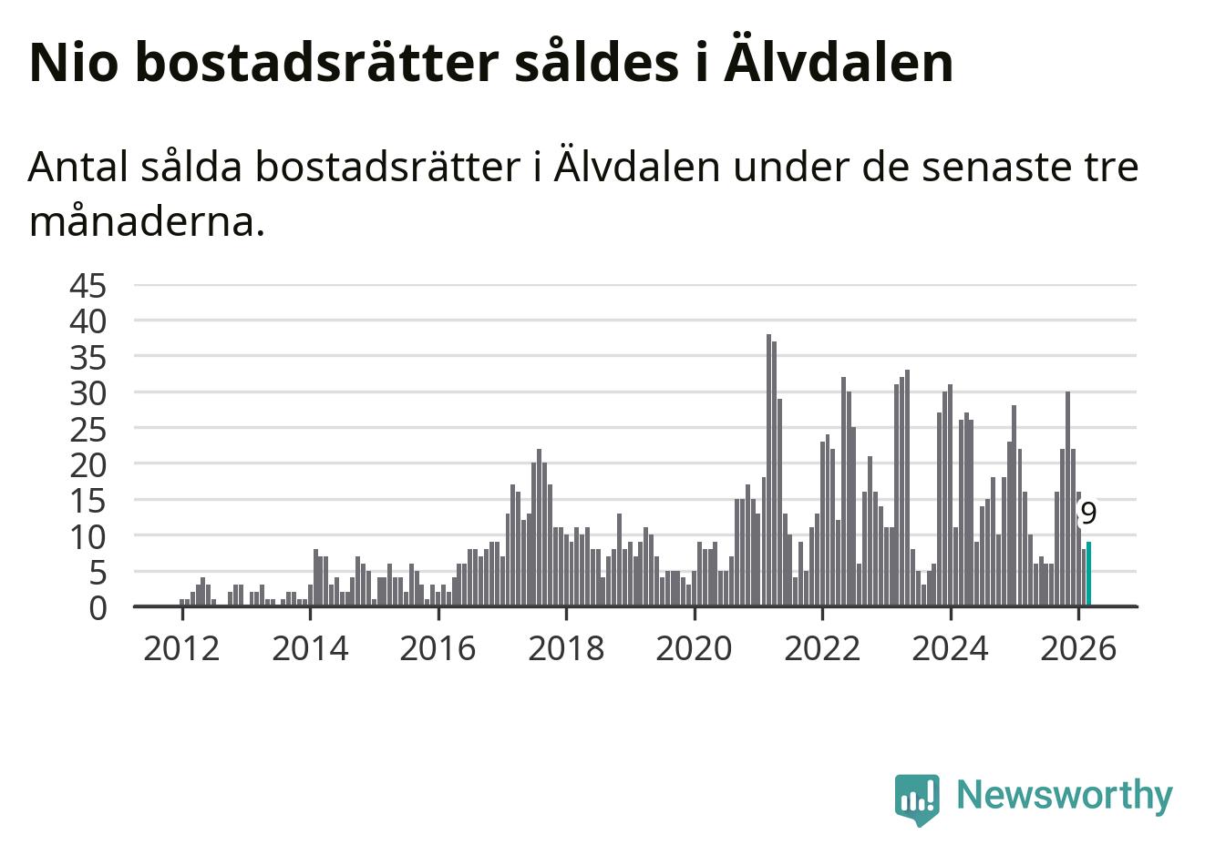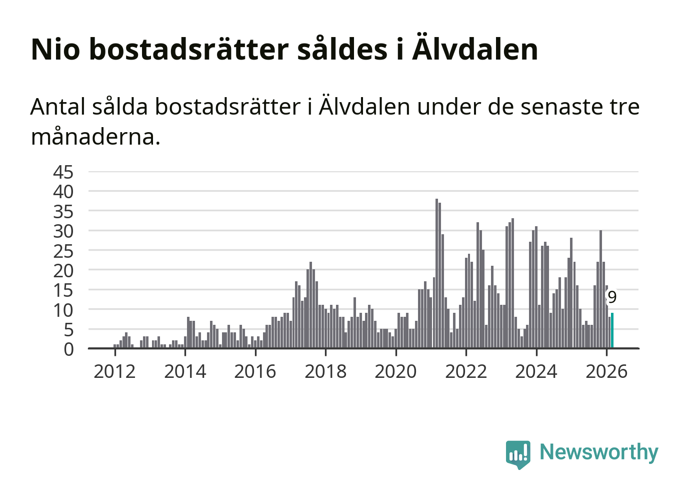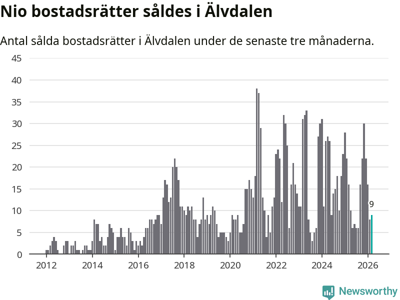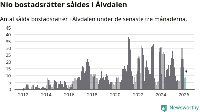 Mellan januari och mars gjordes sammanlagt nio affärer med bostadsrätter i Älvdalens kommun. Det kan jämföras med 16 vid motsvarande tid i fjol.