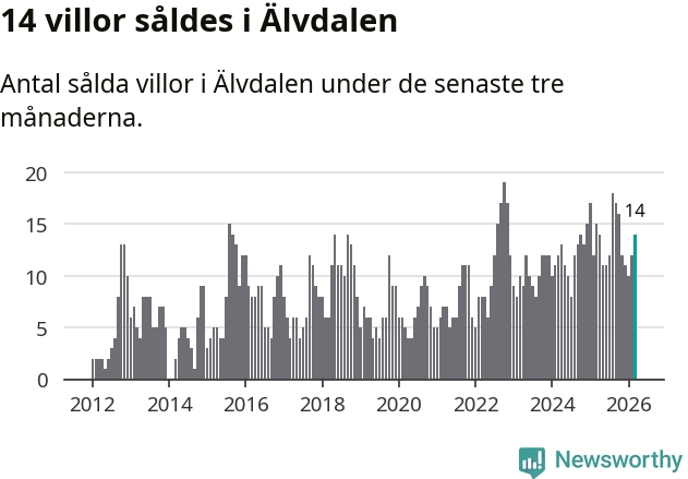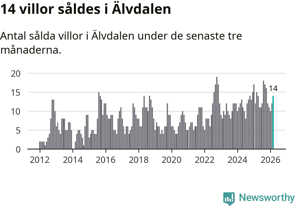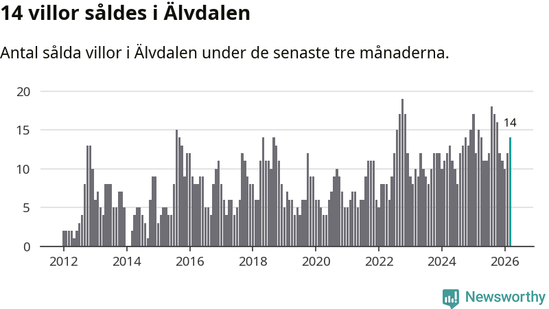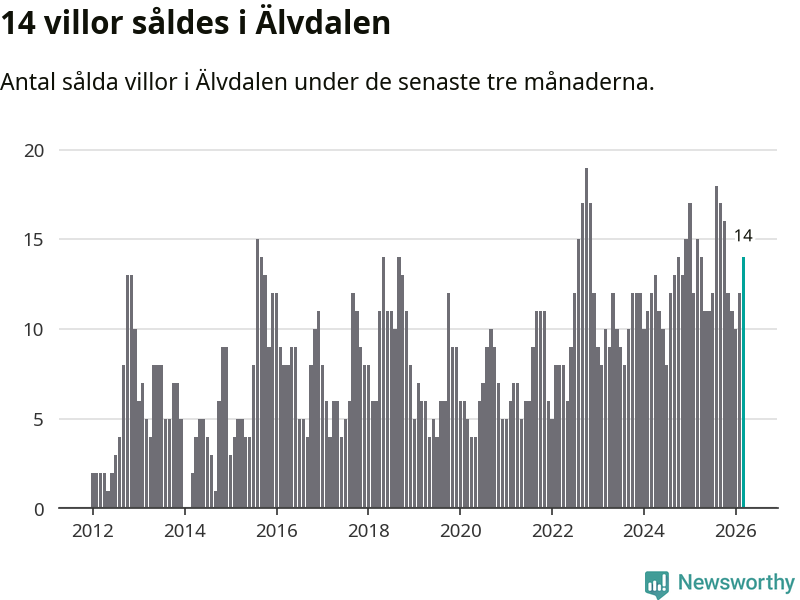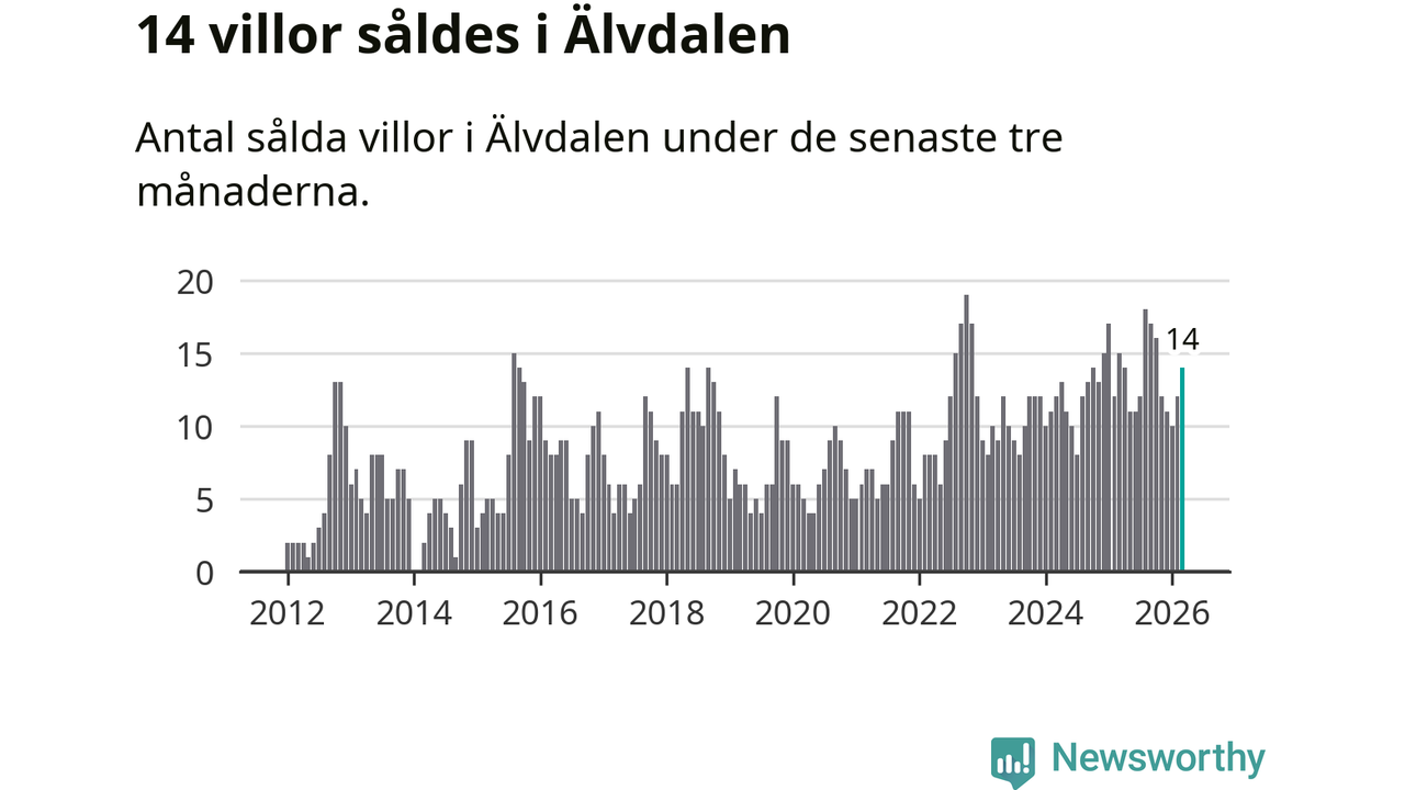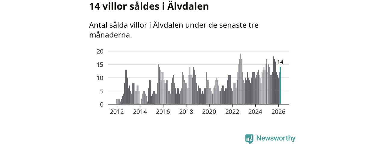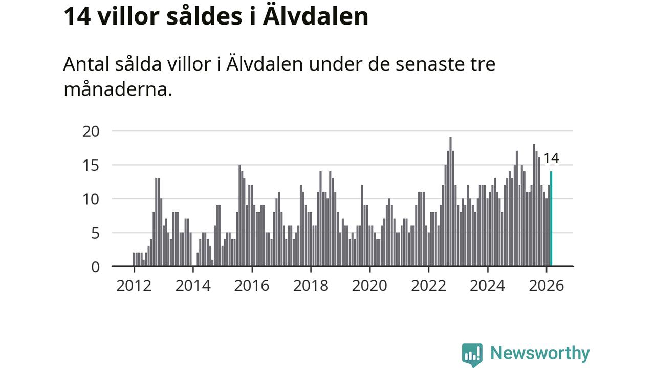 Mellan januari och mars gjordes sammanlagt 14 affärer med villor i Älvdalens kommun. Det kan jämföras med 15 vid motsvarande tid i fjol.