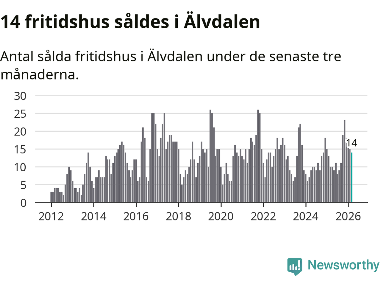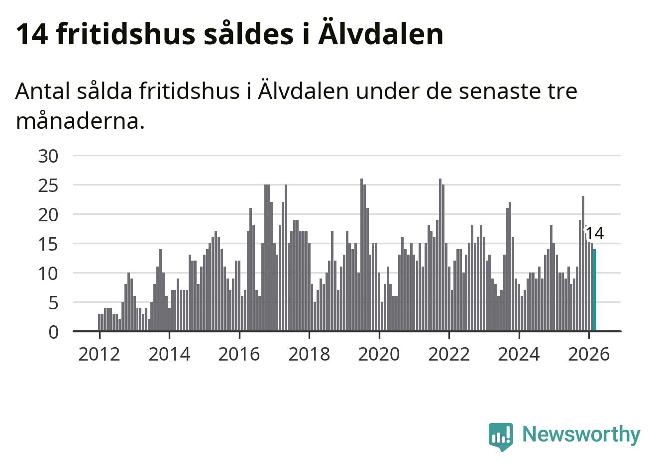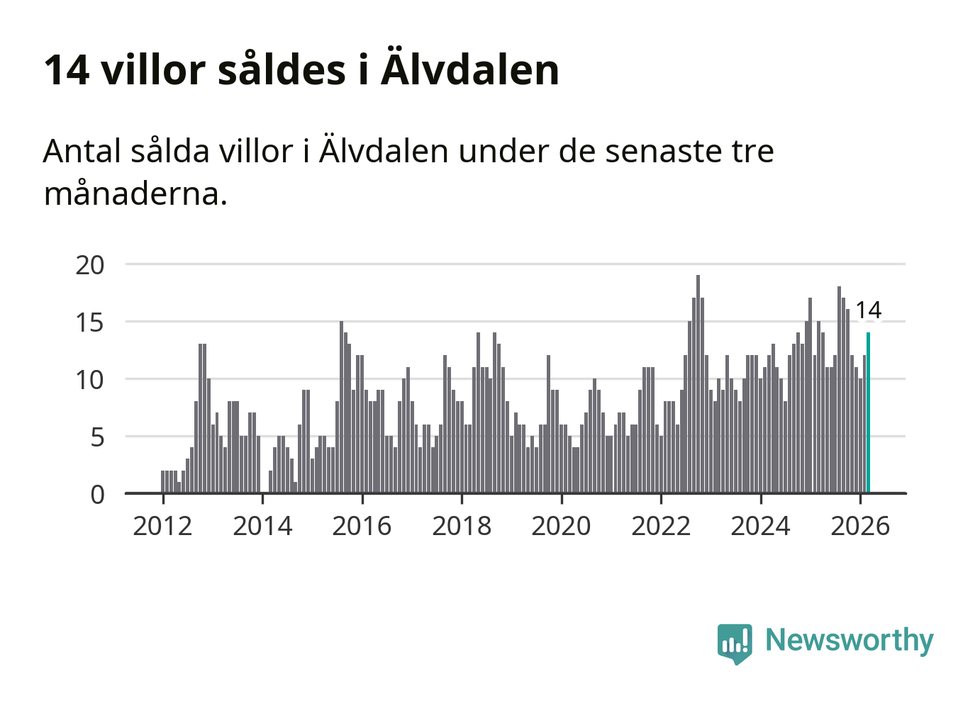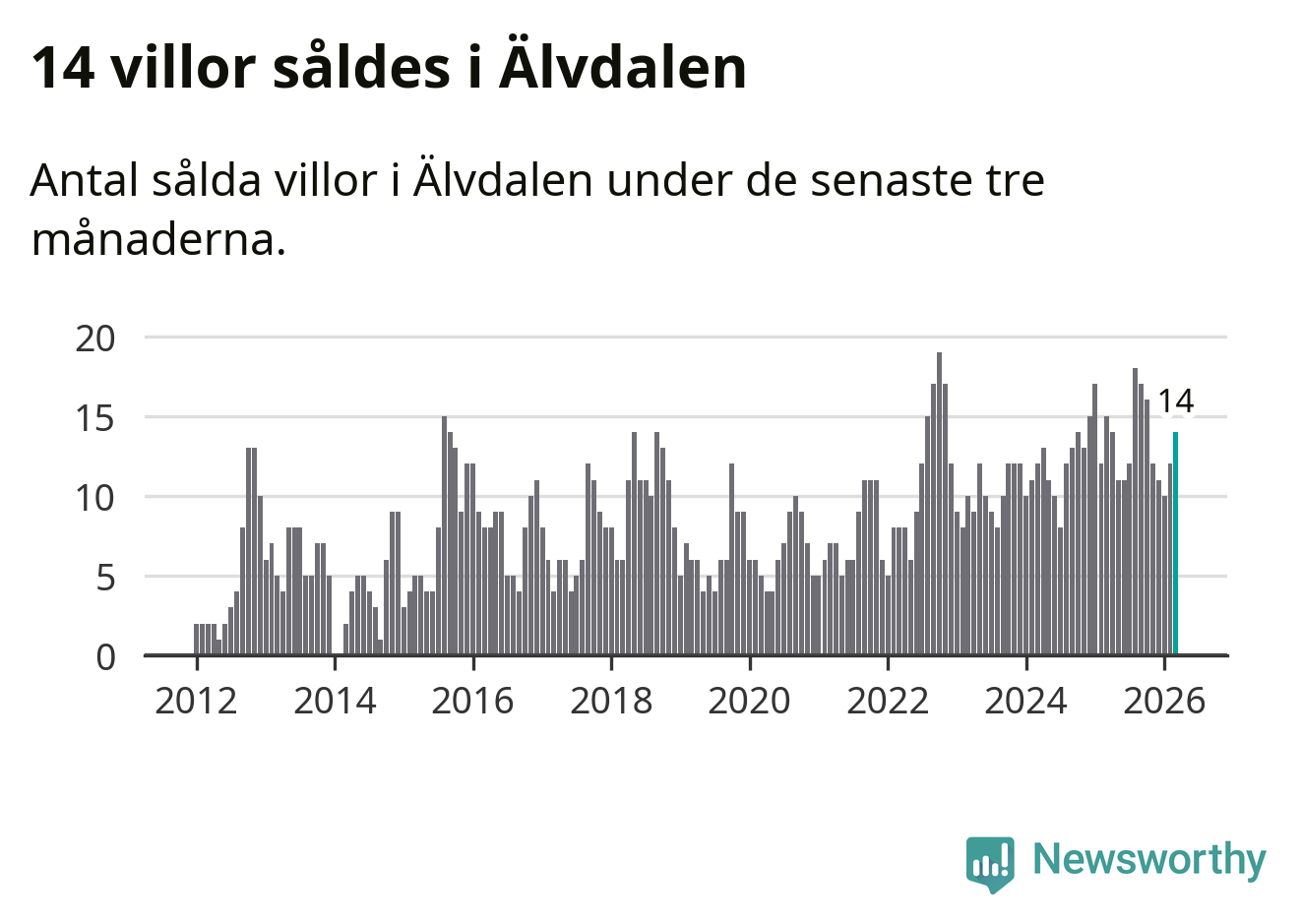 Mellan januari och mars gjordes sammanlagt 14 affärer med villor i Älvdalens kommun. Det kan jämföras med 15 vid motsvarande tid i fjol.
