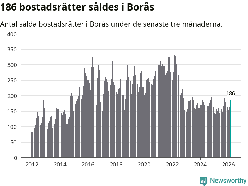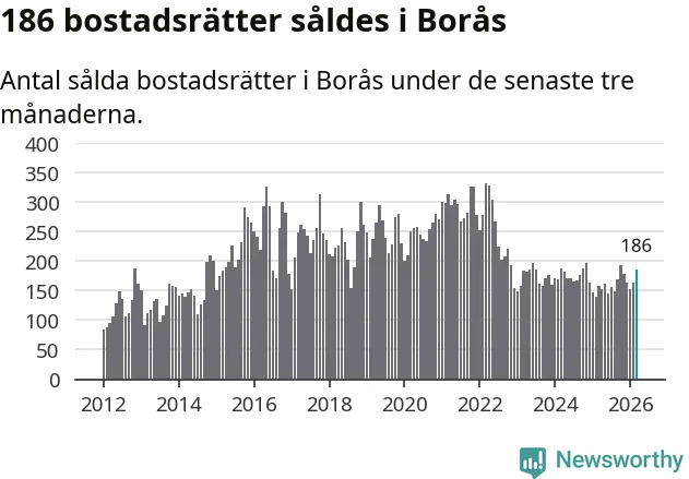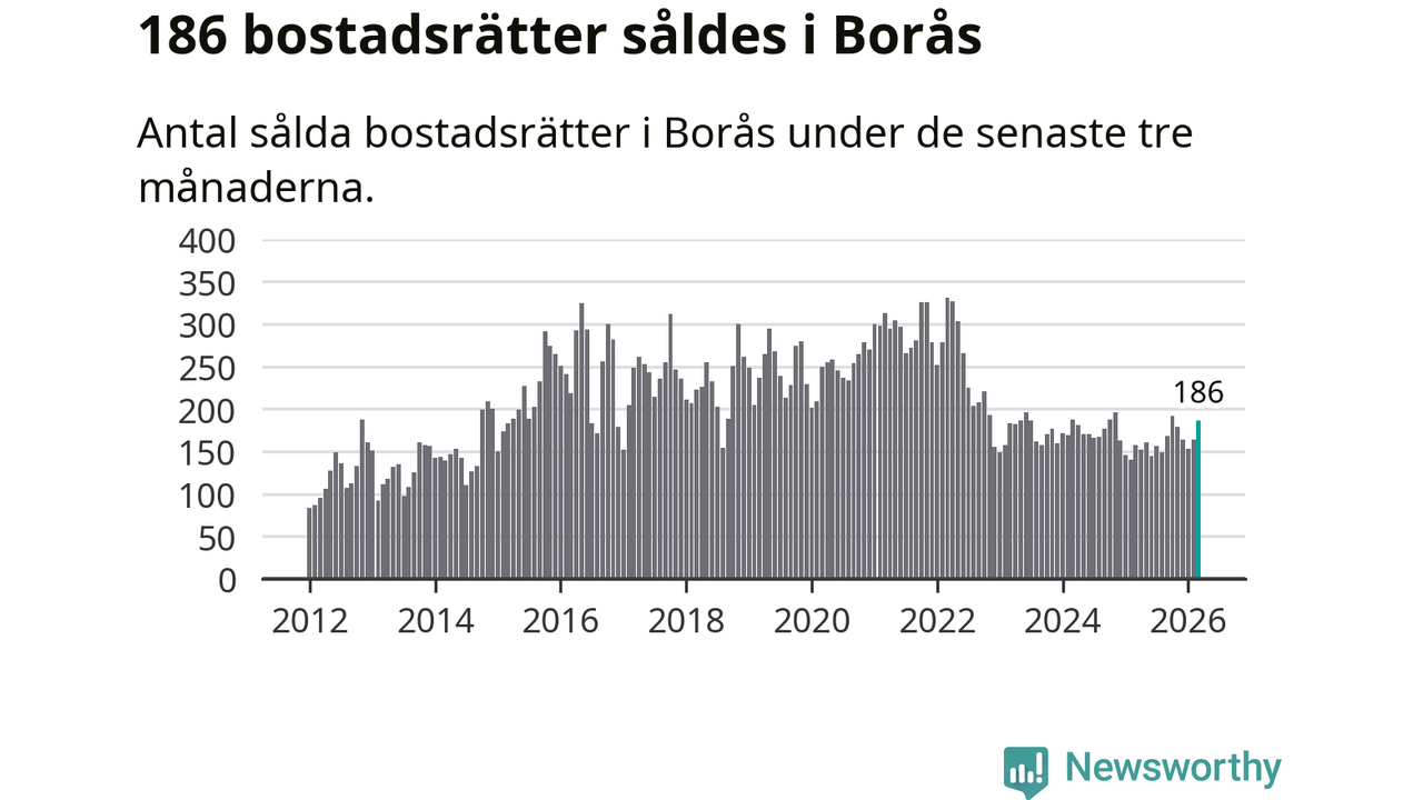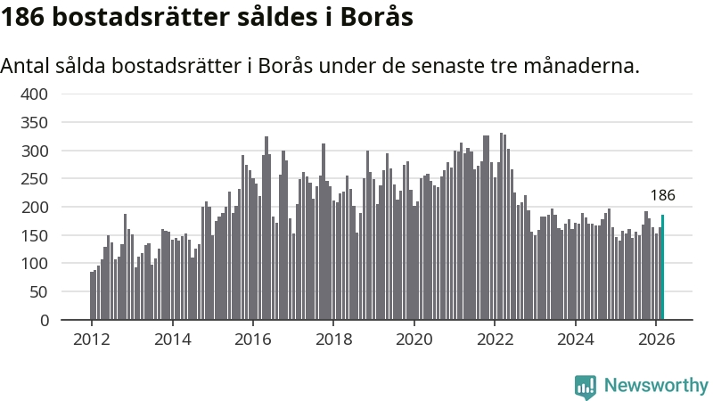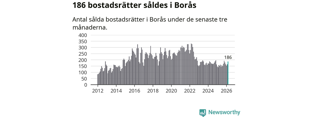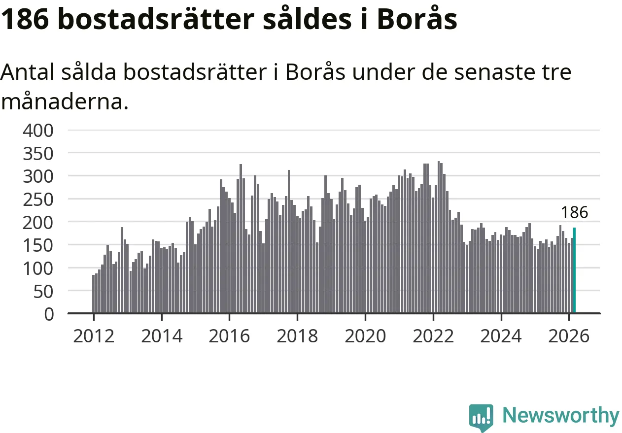 Sammanlagt såldes 186 bostadsrätter i Borås kommun mellan januari och mars till ett genomsnittligt pris på 1,4 miljoner kronor. I fjol gjordes 157 affärer vid den här tiden på året.