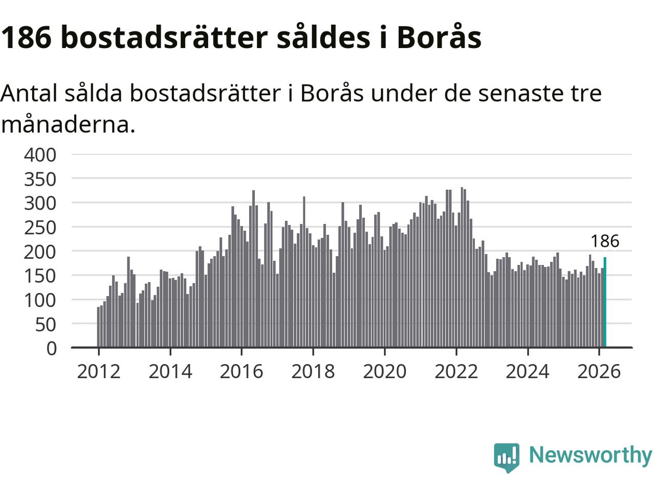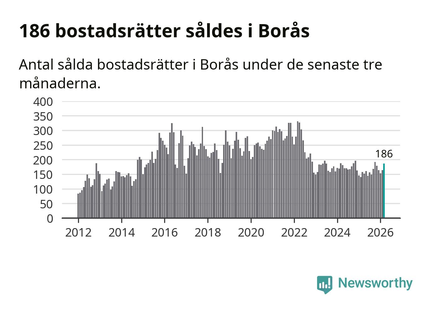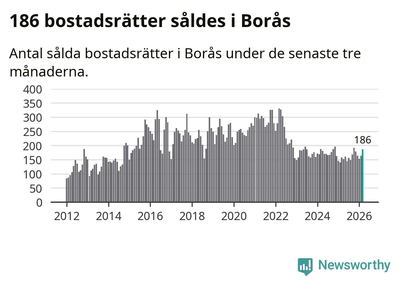 Sammanlagt såldes 186 bostadsrätter i Borås kommun mellan januari och mars till ett genomsnittligt pris på 1,4 miljoner kronor. I fjol gjordes 157 affärer vid den här tiden på året.