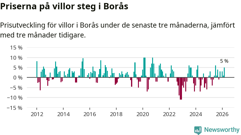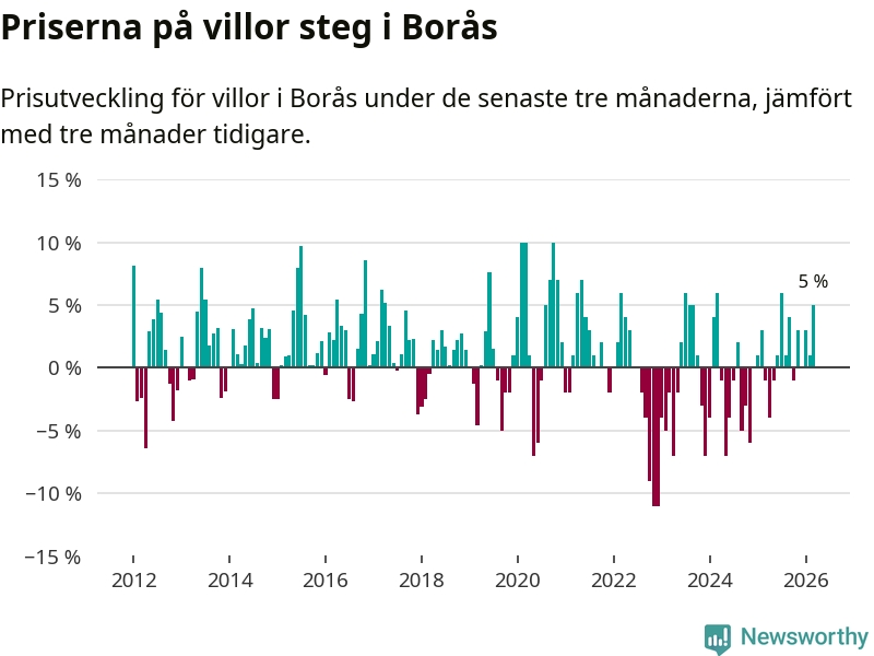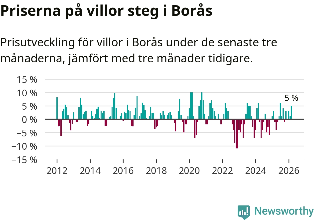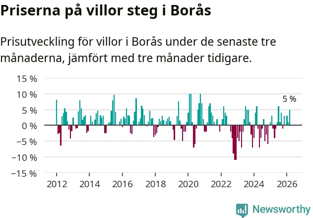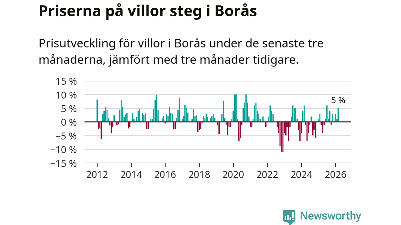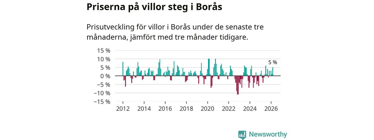 Villapriserna har gått upp i Borås kommun. Medelpriset på försäljningarna under de senaste tre månaderna visar på en uppgång med 5 procent.