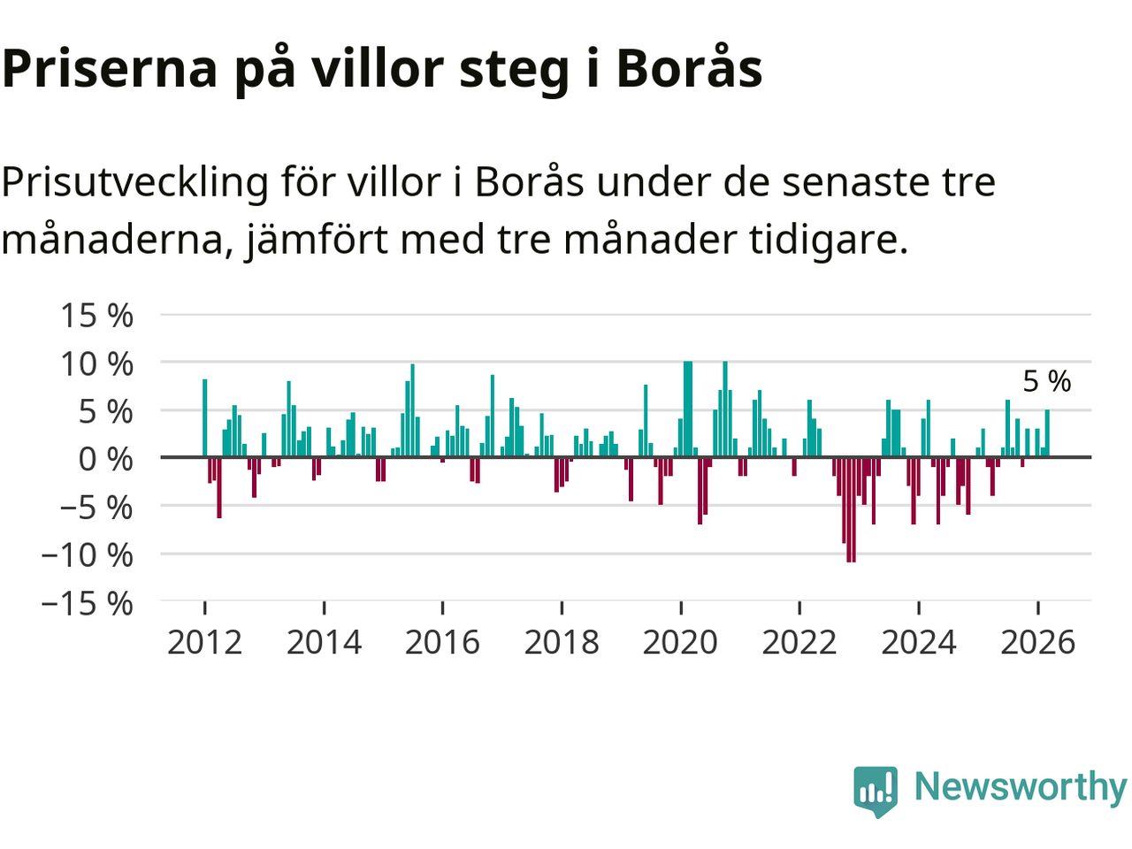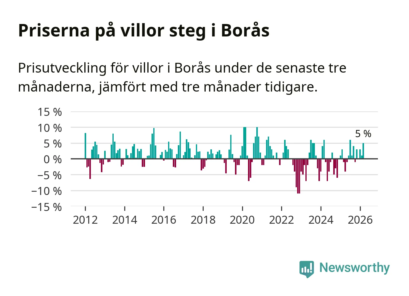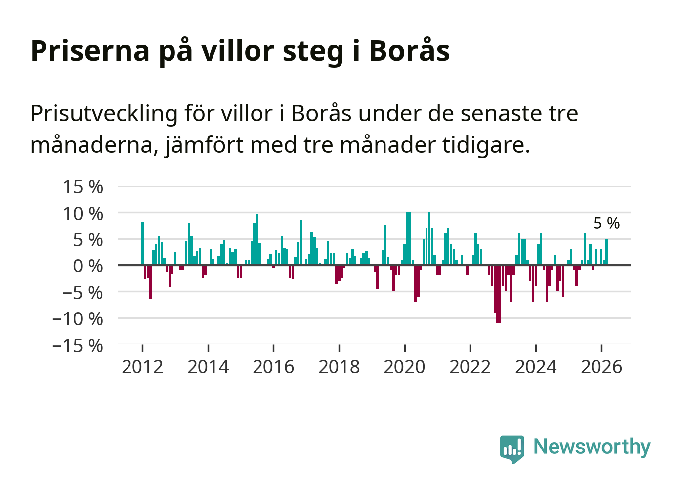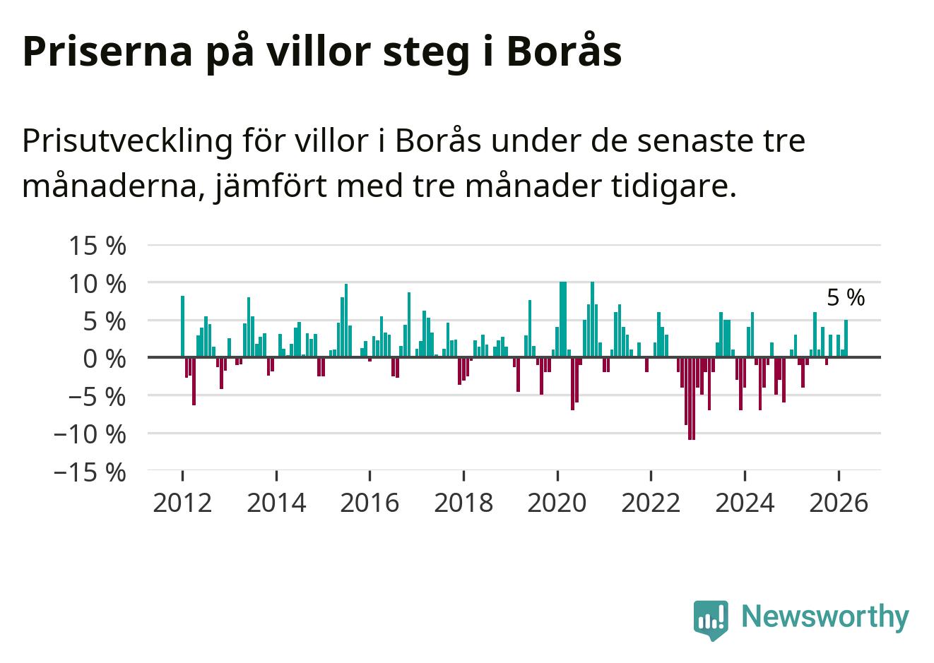 Villapriserna har gått upp i Borås kommun. Medelpriset på försäljningarna under de senaste tre månaderna visar på en uppgång med 5 procent.
