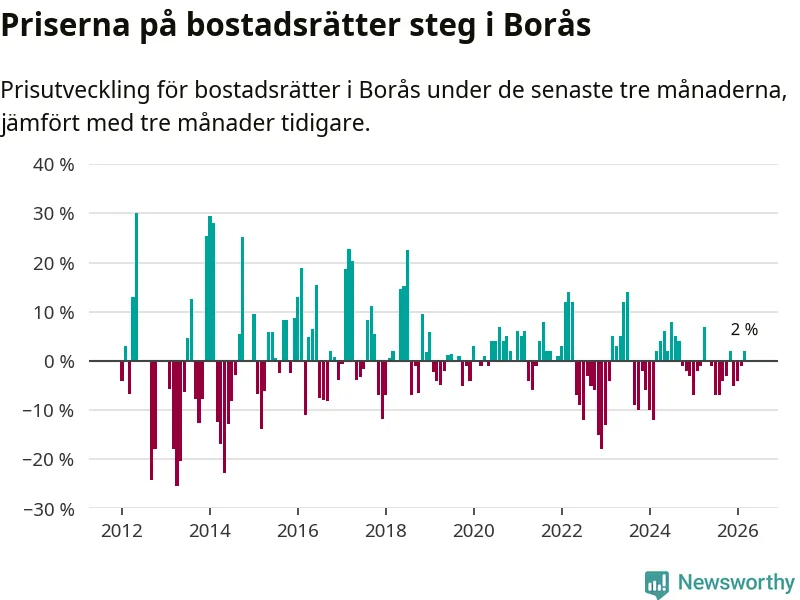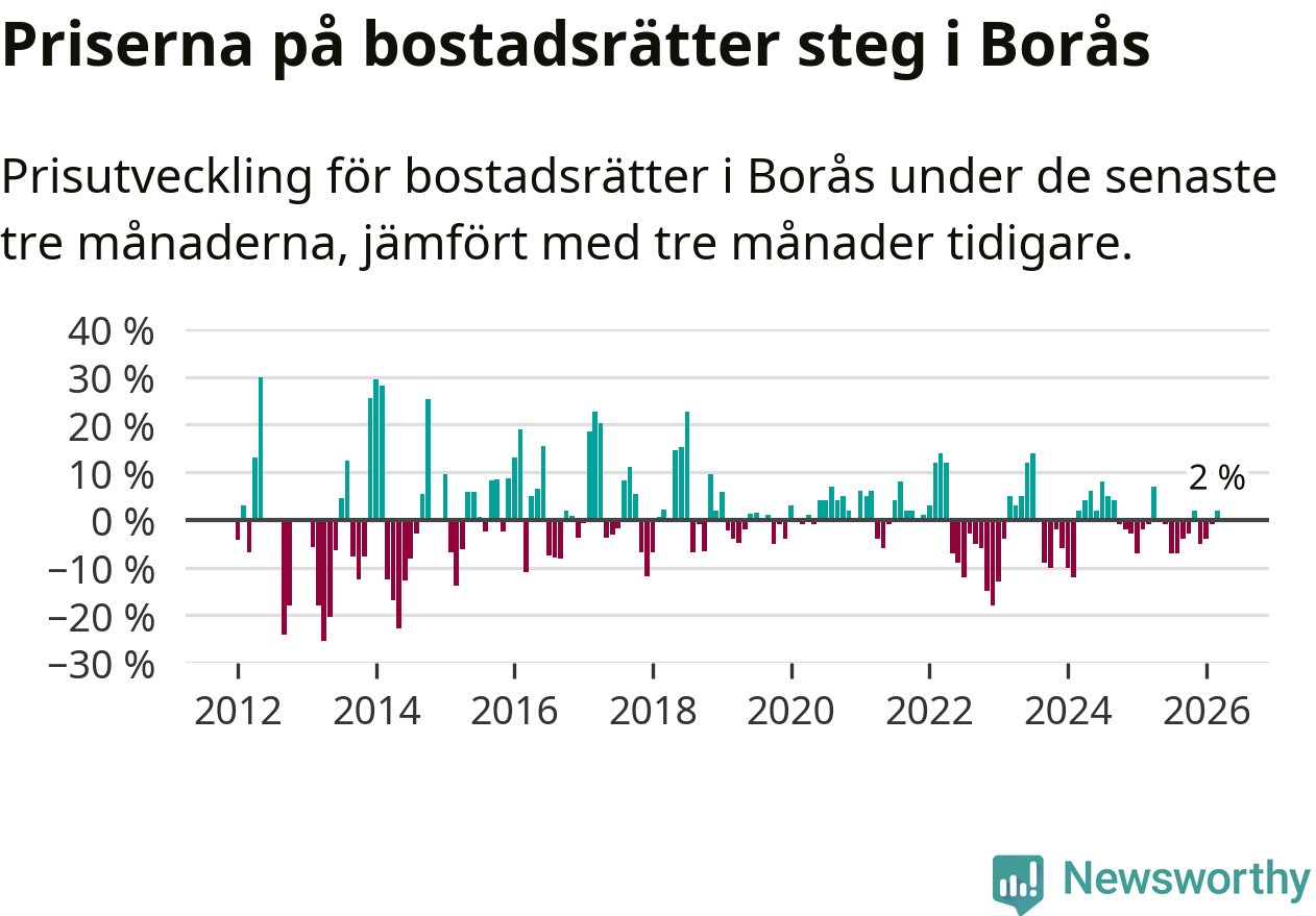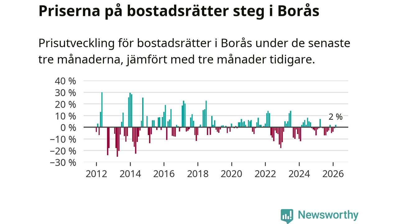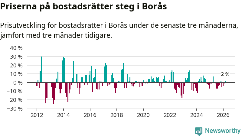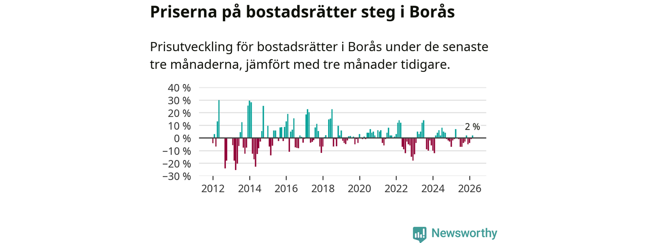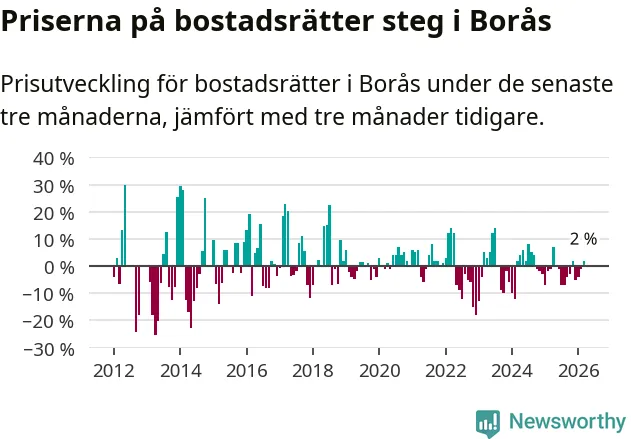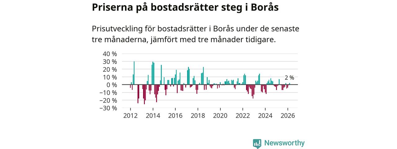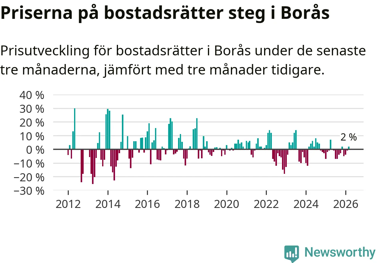 Priserna på bostadsrätter har gått upp i Borås kommun. Medelpriset på försäljningarna under de senaste tre månaderna visar på en uppgång med 2 procent.