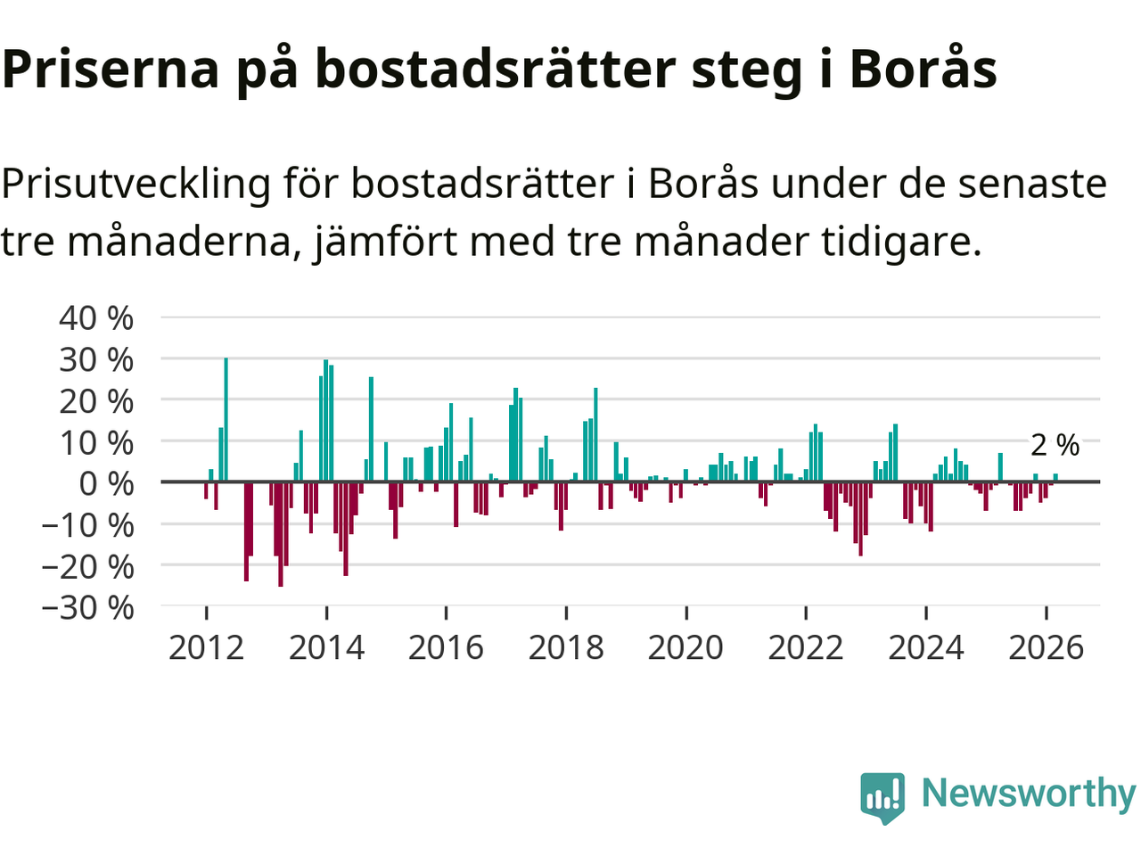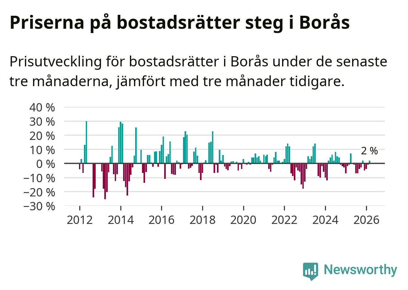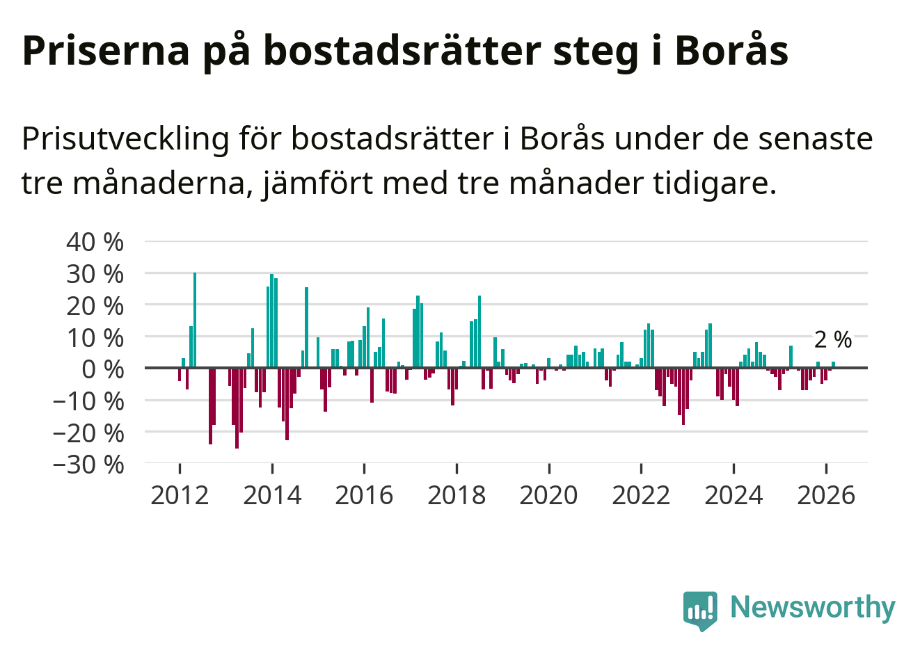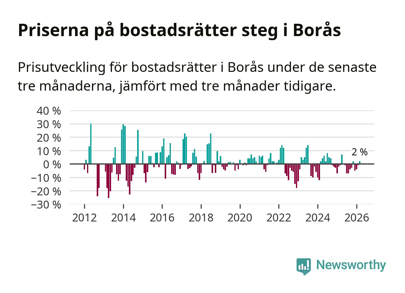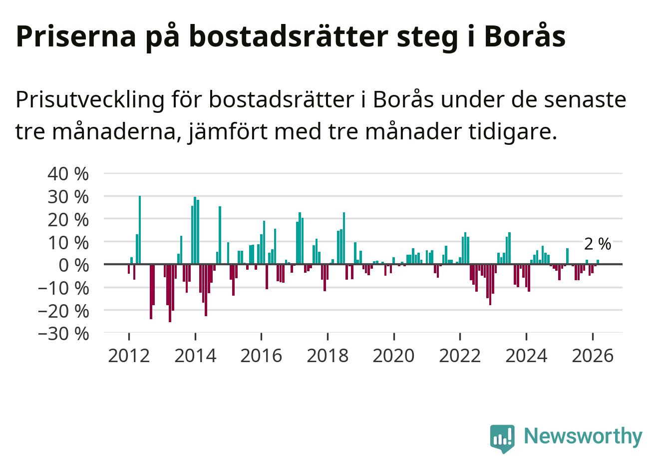 Priserna på bostadsrätter har gått upp i Borås kommun. Medelpriset på försäljningarna under de senaste tre månaderna visar på en uppgång med 2 procent.