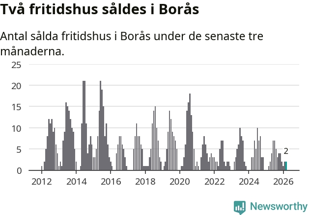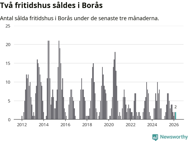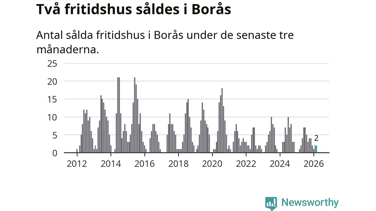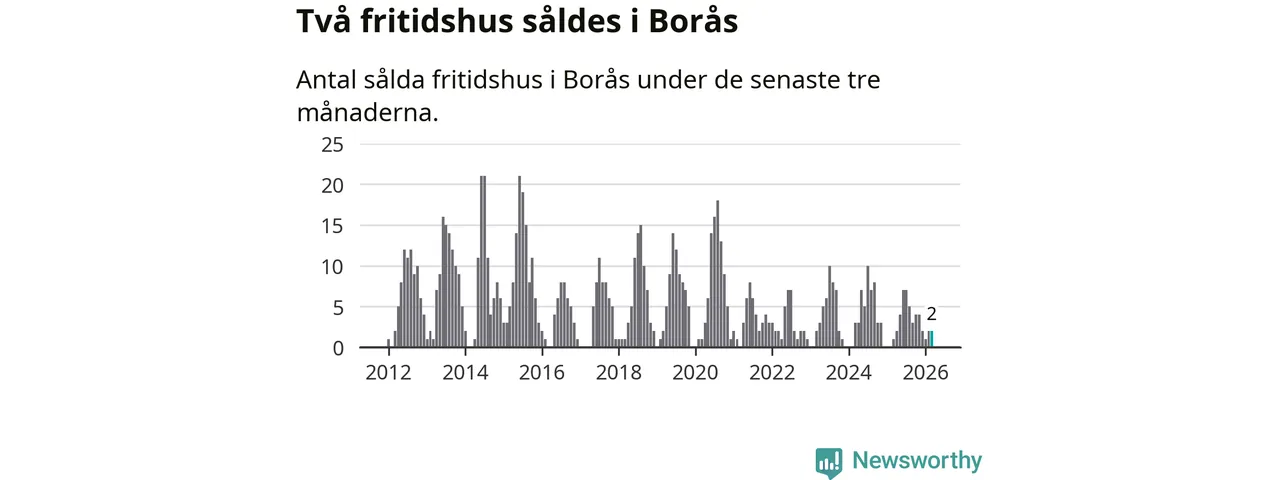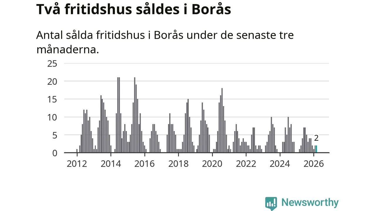 Mellan januari och mars gjordes sammanlagt två affärer med fritidshus i Borås kommun. Det kan jämföras med ett vid motsvarande tid i fjol.
