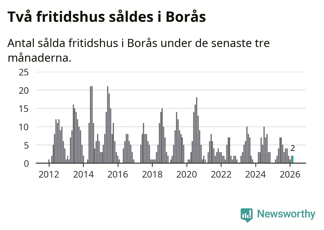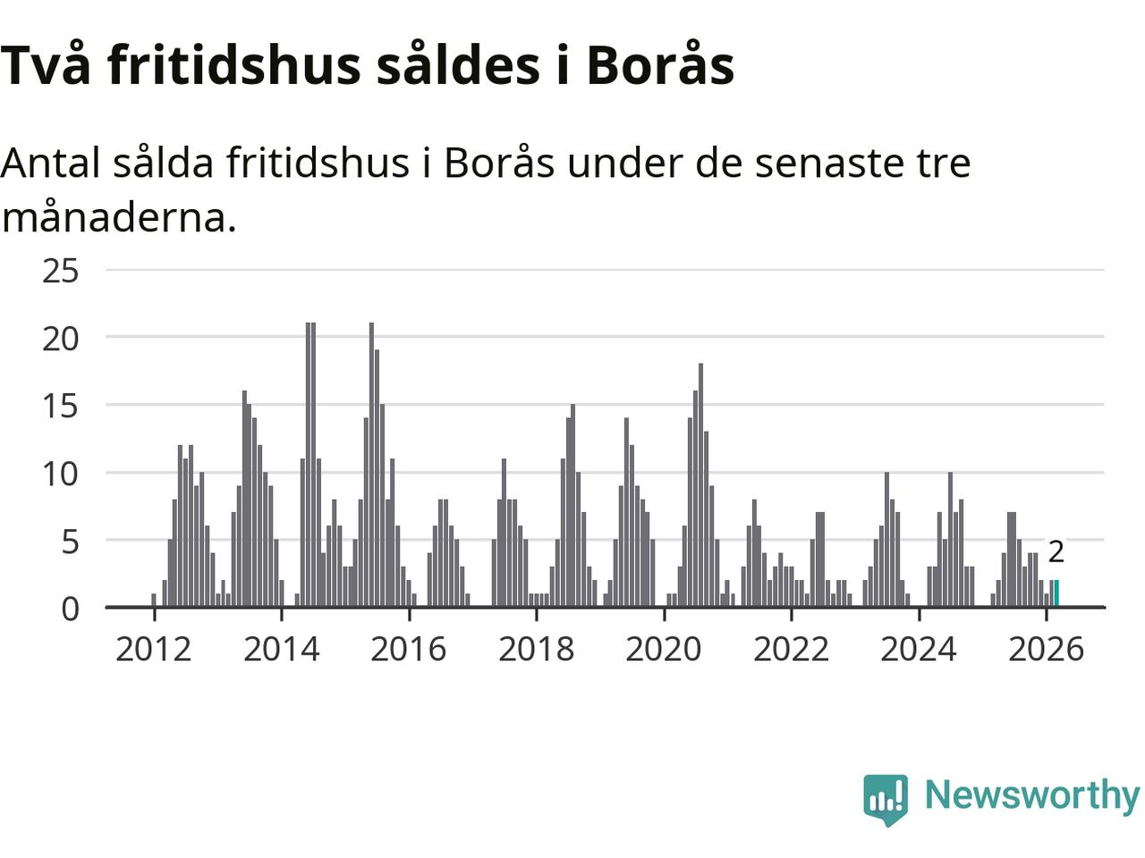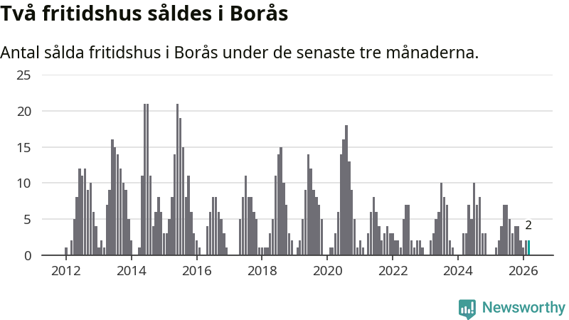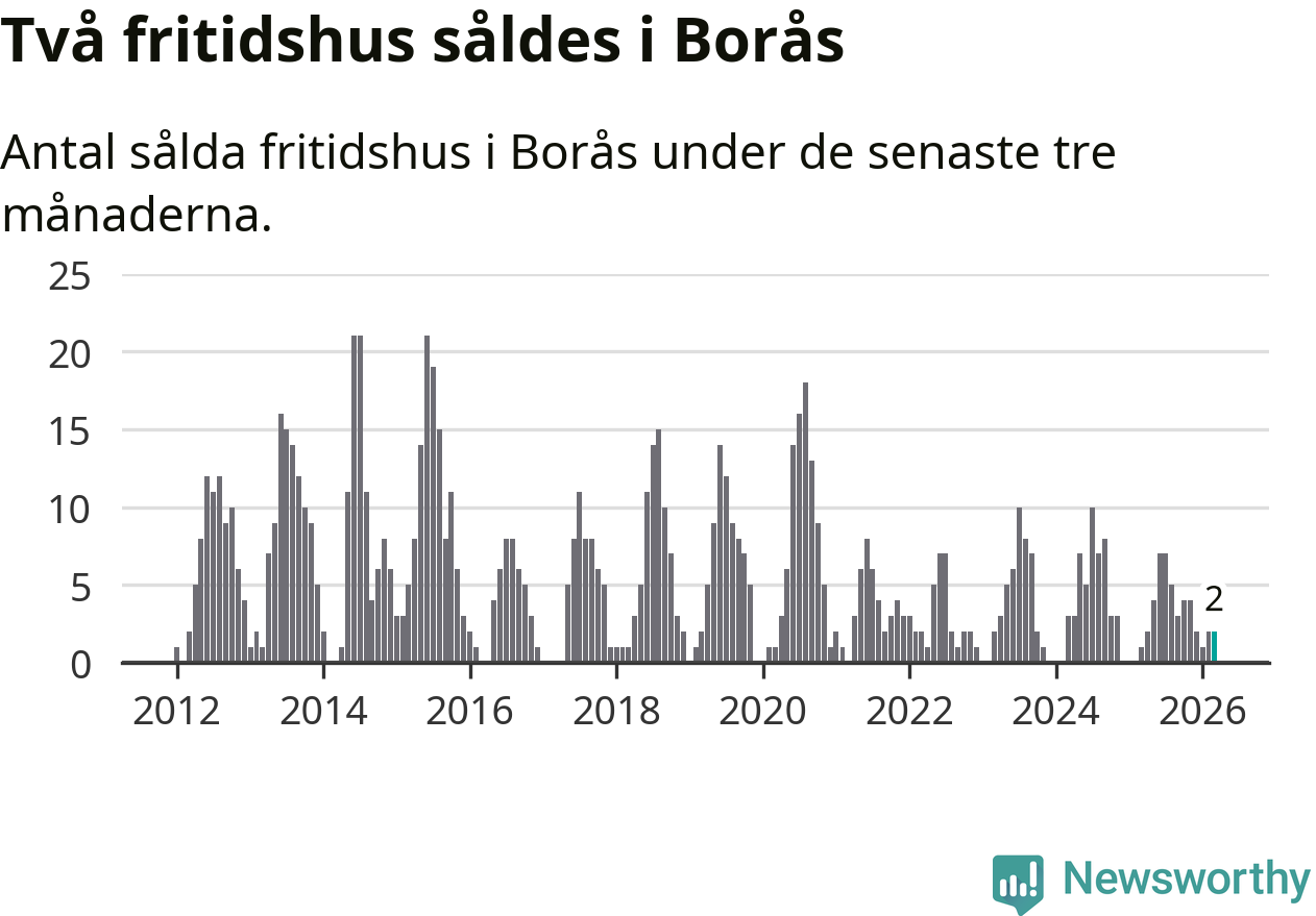 Mellan januari och mars gjordes sammanlagt två affärer med fritidshus i Borås kommun. Det kan jämföras med ett vid motsvarande tid i fjol.
