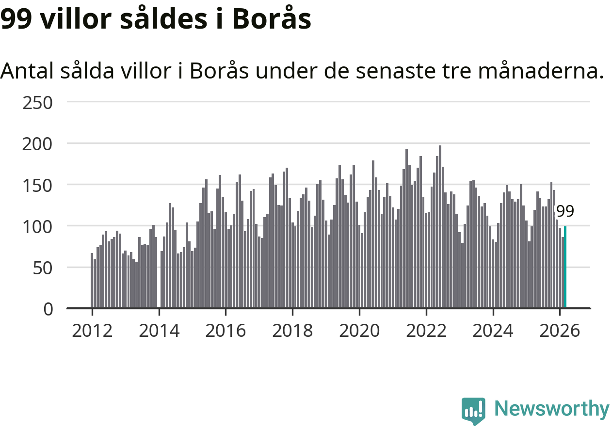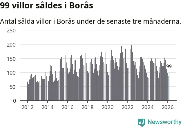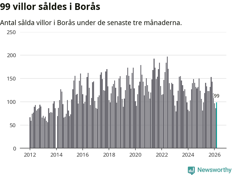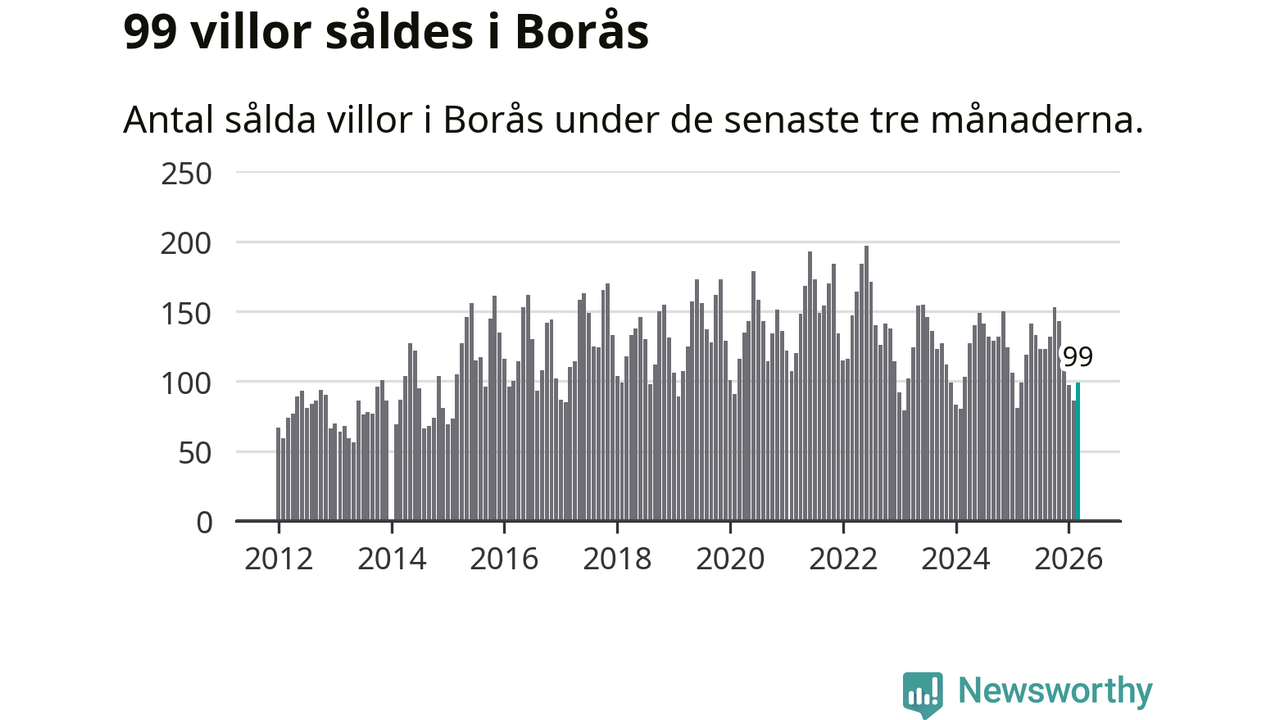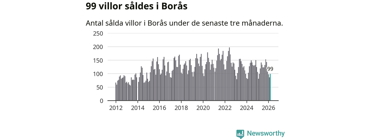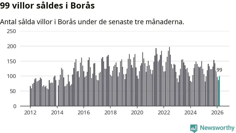Sammanlagt såldes 99 villor i Borås kommun mellan januari och mars till ett genomsnittligt pris på 3,7 miljoner kronor. I fjol gjordes 99 affärer vid den här tiden på året.