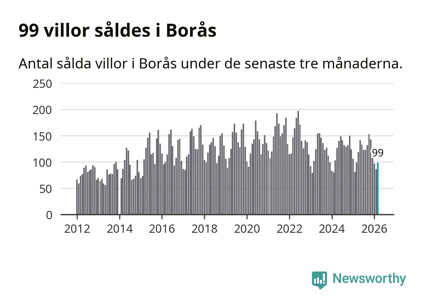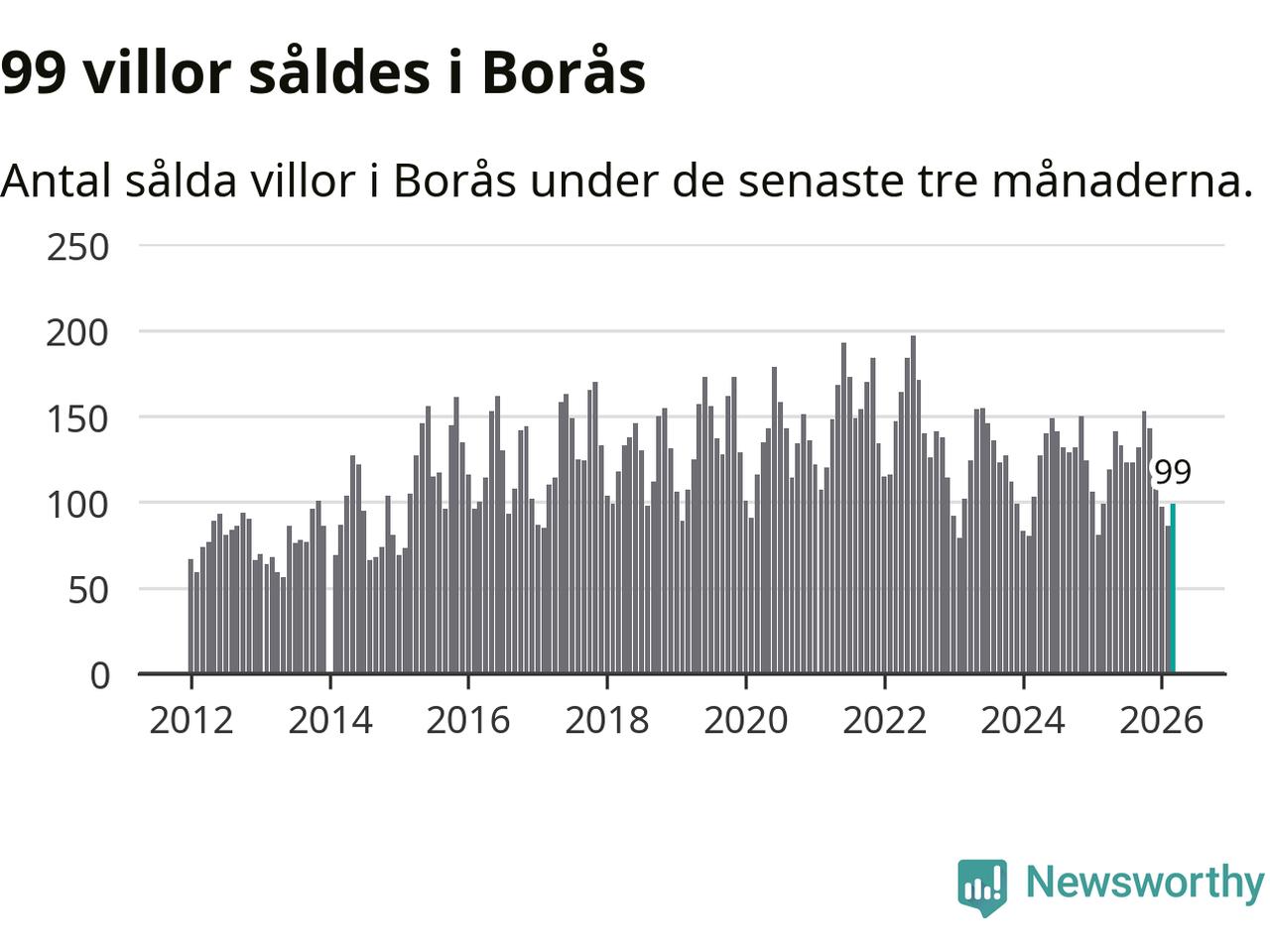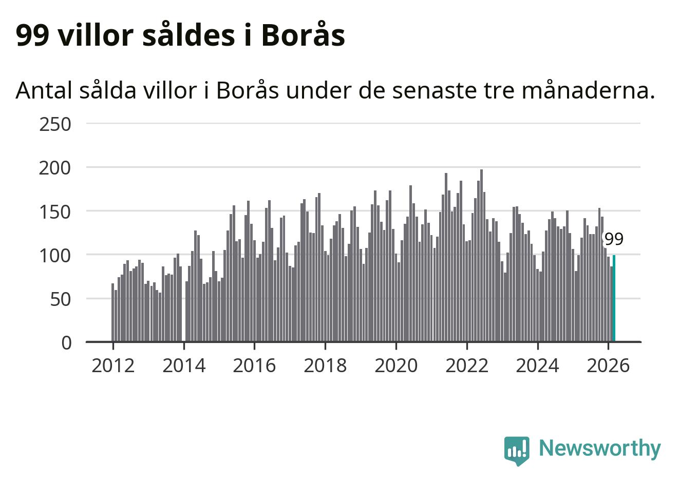 Sammanlagt såldes 99 villor i Borås kommun mellan januari och mars till ett genomsnittligt pris på 3,7 miljoner kronor. I fjol gjordes 99 affärer vid den här tiden på året.