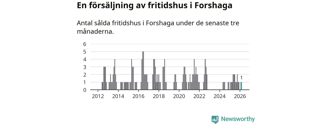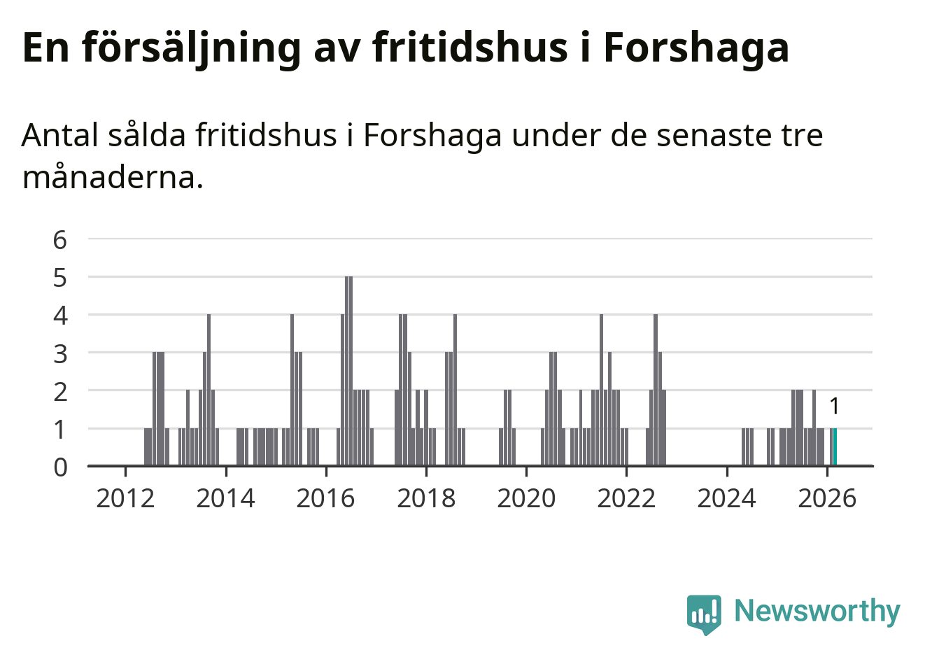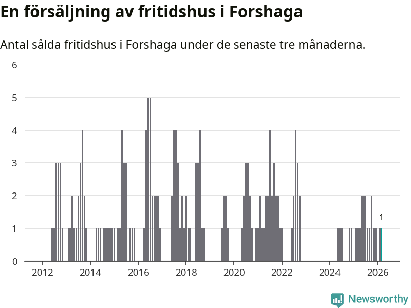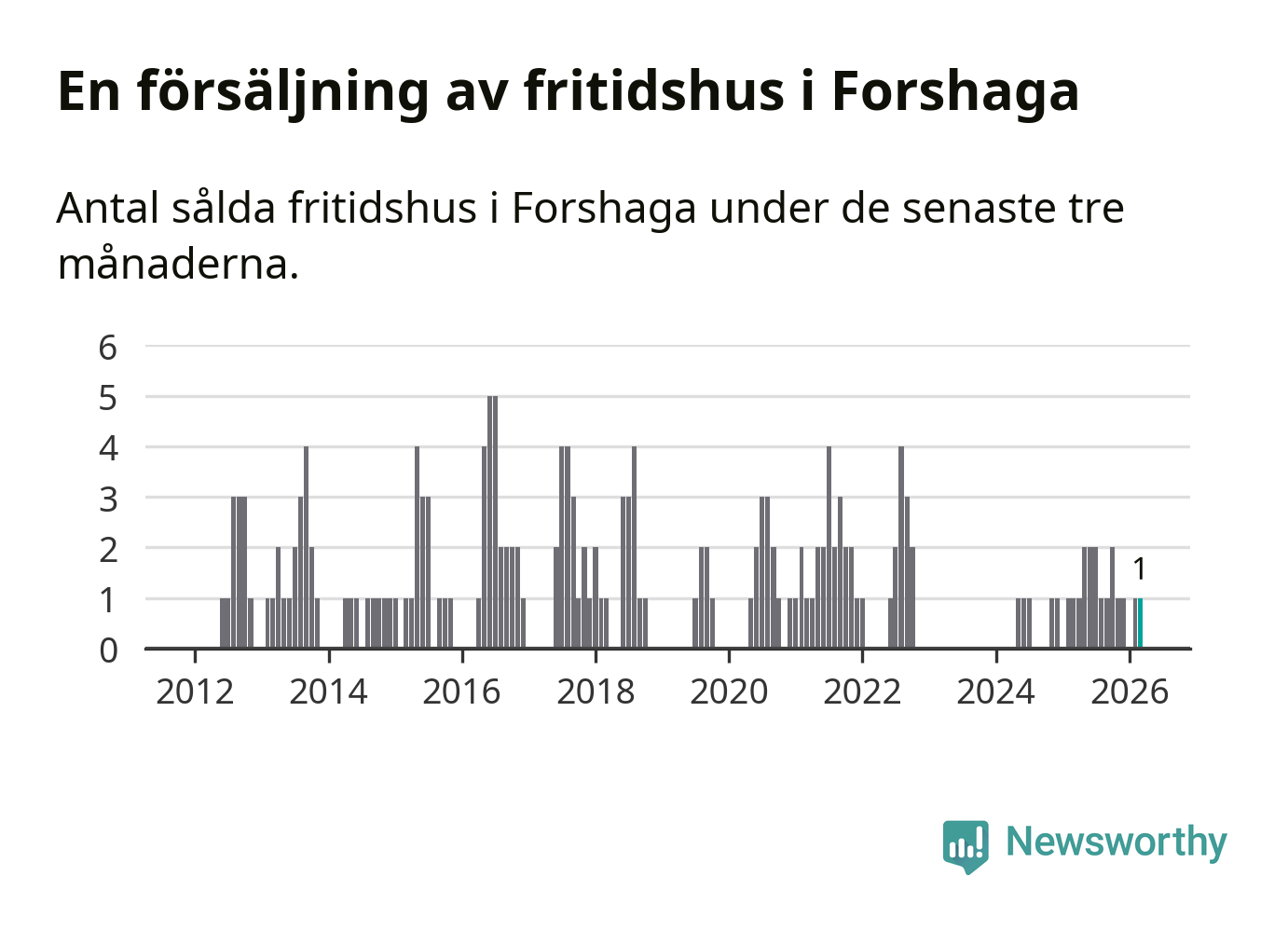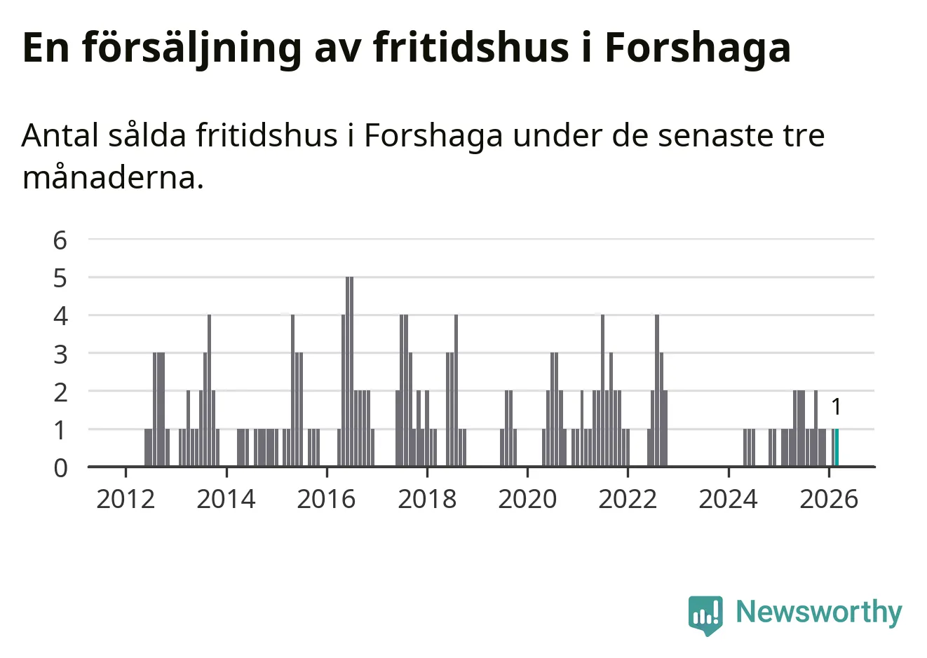 Mellan januari och mars gjordes sammanlagt en affär med fritidshus i Forshaga kommun. Det är lika många affärer som vid motsvarande tid i fjol.