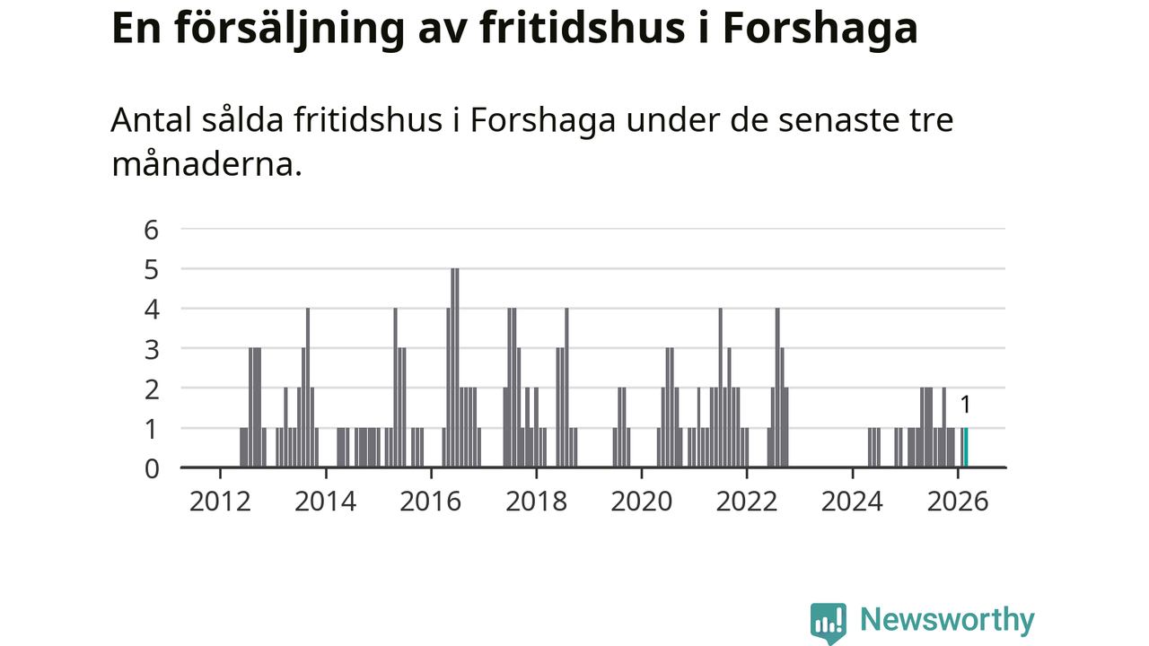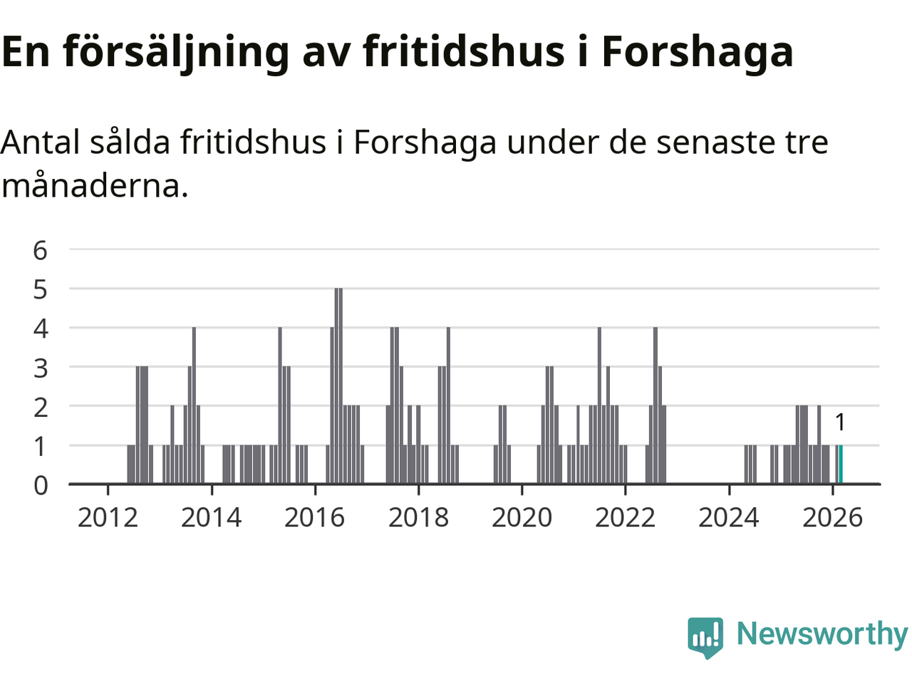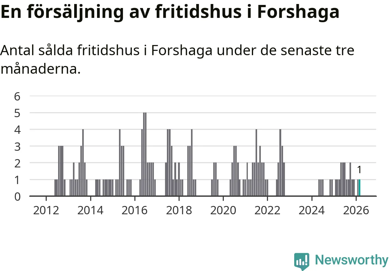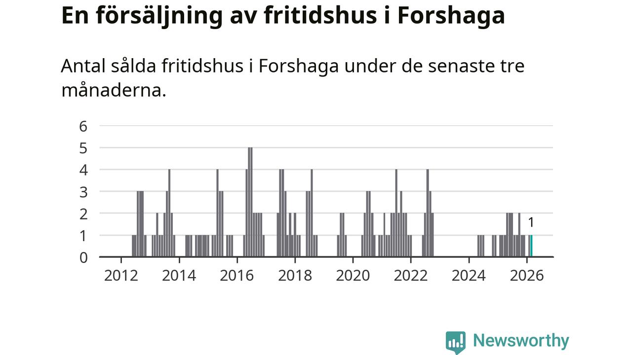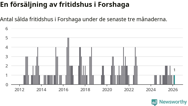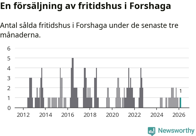 Mellan januari och mars gjordes sammanlagt en affär med fritidshus i Forshaga kommun. Det är lika många affärer som vid motsvarande tid i fjol.
