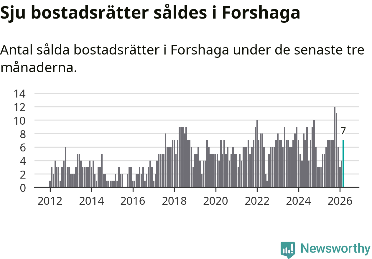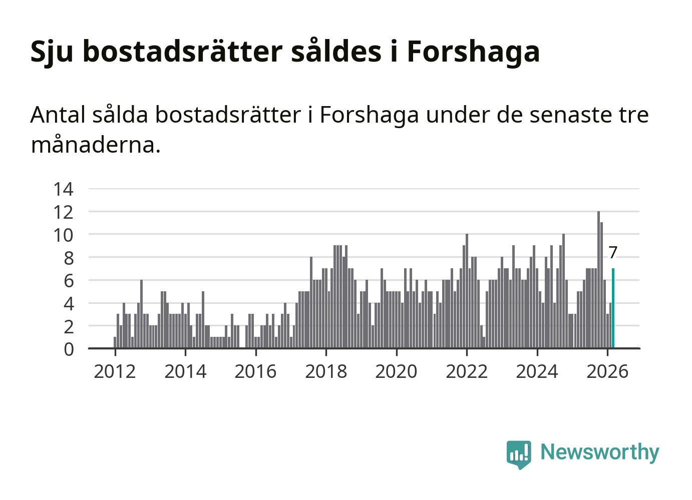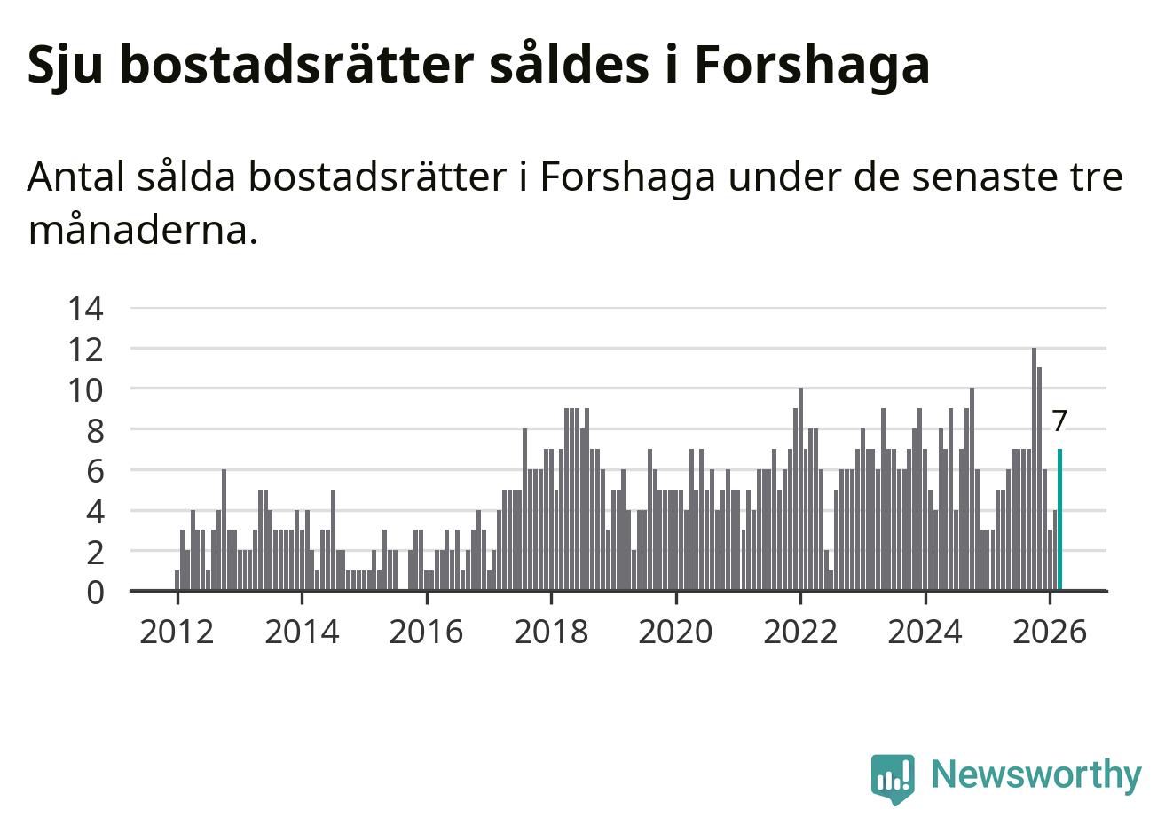 Mellan januari och mars gjordes sammanlagt sju affärer med bostadsrätter i Forshaga kommun. Det kan jämföras med fem vid motsvarande tid i fjol.