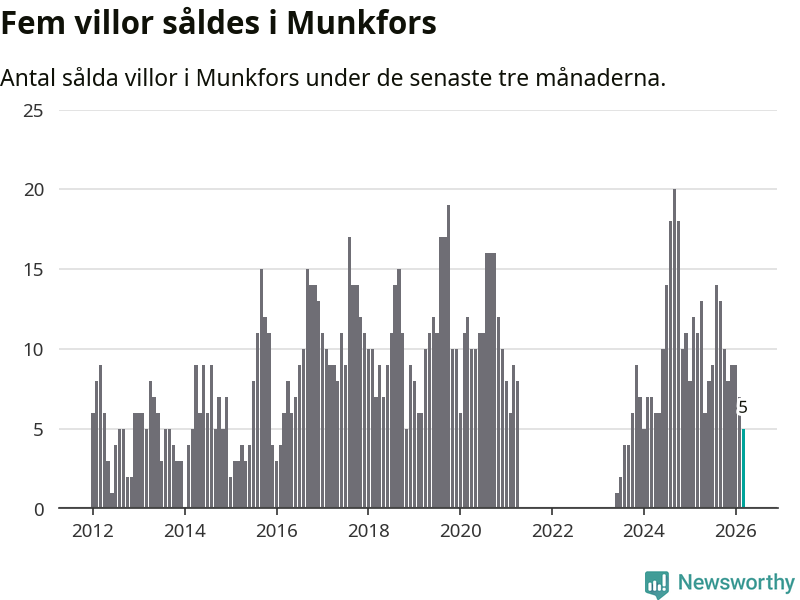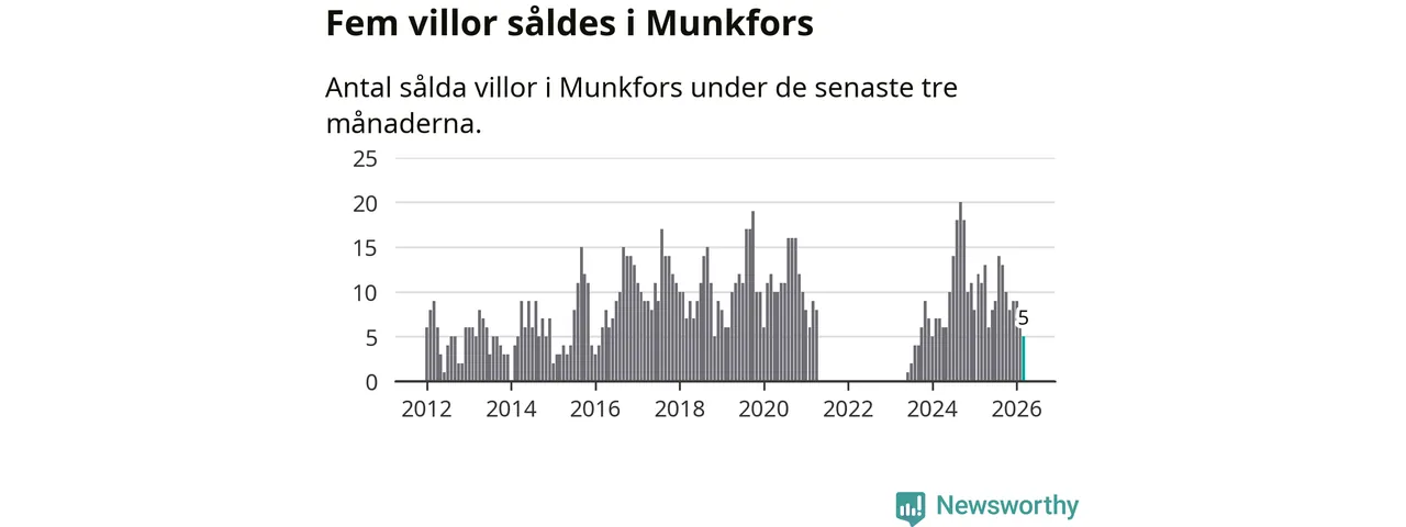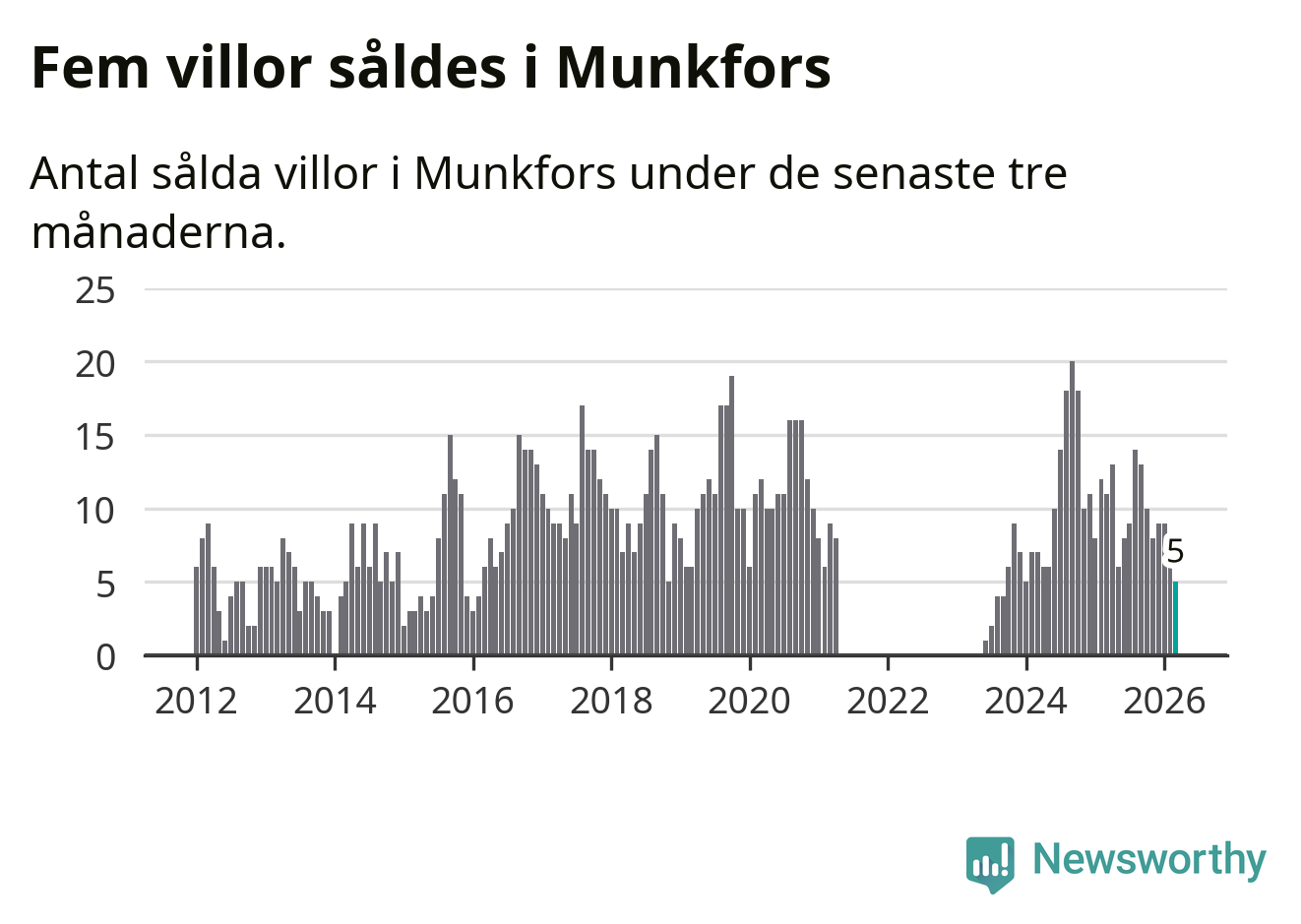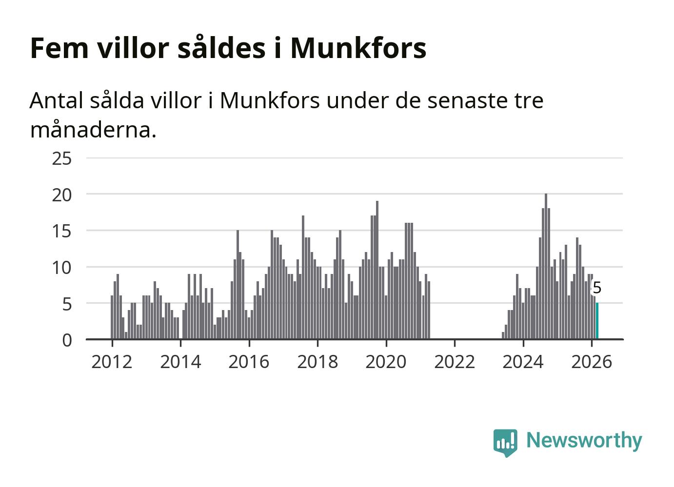 Mellan januari och mars gjordes sammanlagt fem affärer med villor i Munkfors kommun. Det kan jämföras med elva vid motsvarande tid i fjol.