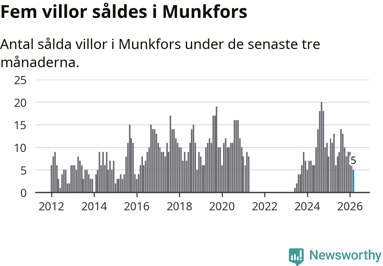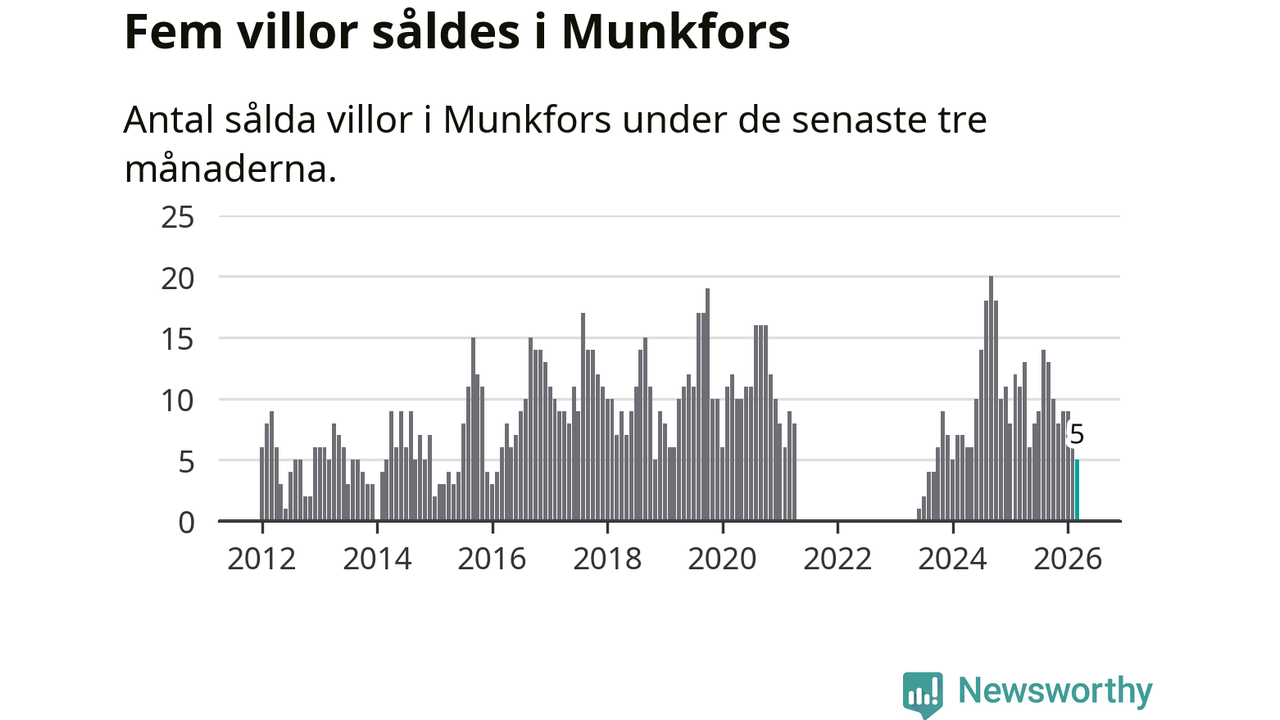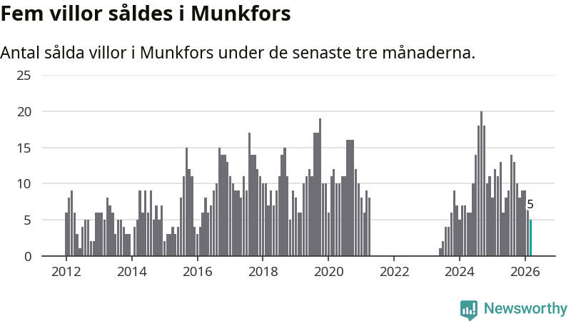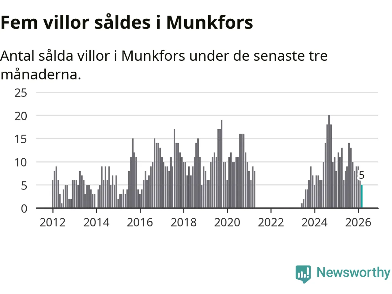 Mellan januari och mars gjordes sammanlagt fem affärer med villor i Munkfors kommun. Det kan jämföras med elva vid motsvarande tid i fjol.
