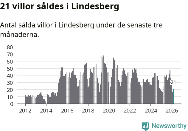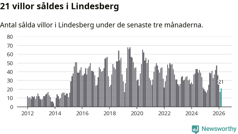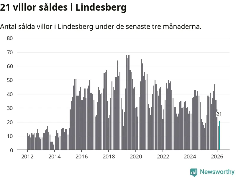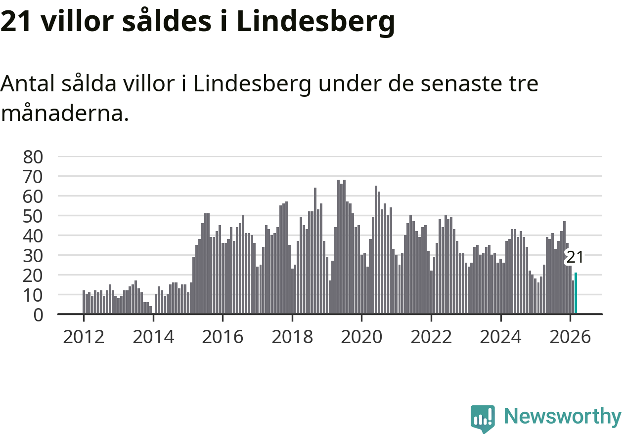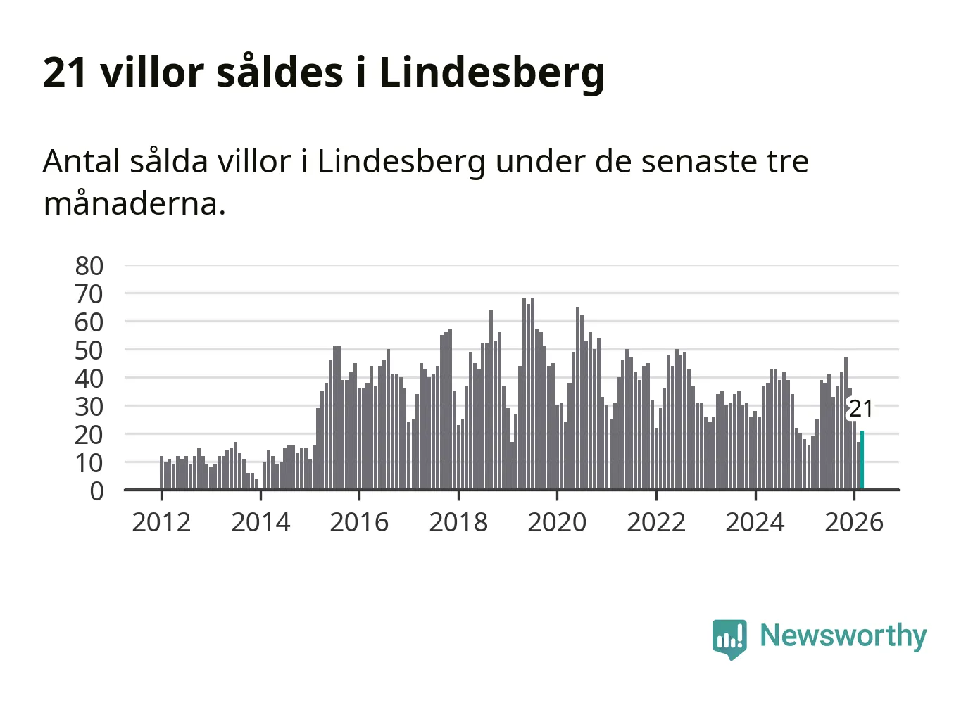 Mellan januari och mars gjordes sammanlagt 21 affärer med villor i Lindesbergs kommun. Det kan jämföras med 19 vid motsvarande tid i fjol.