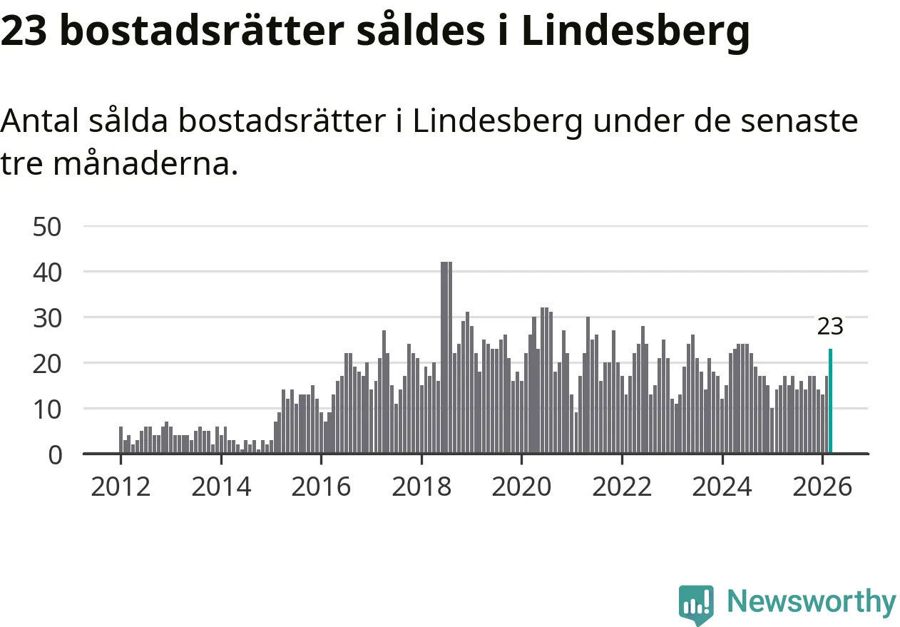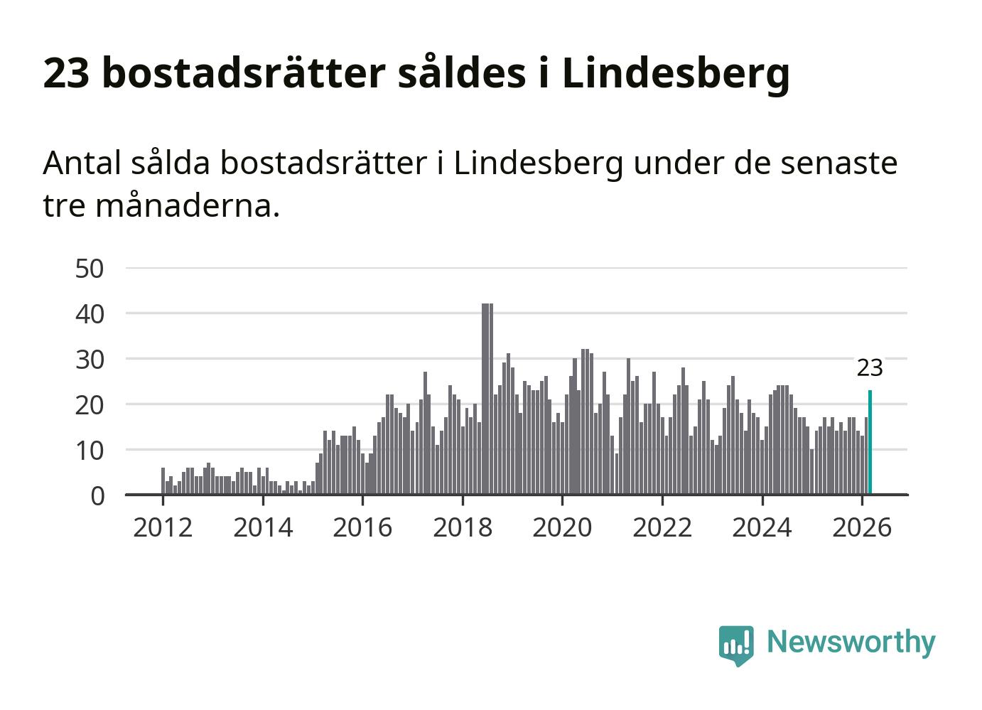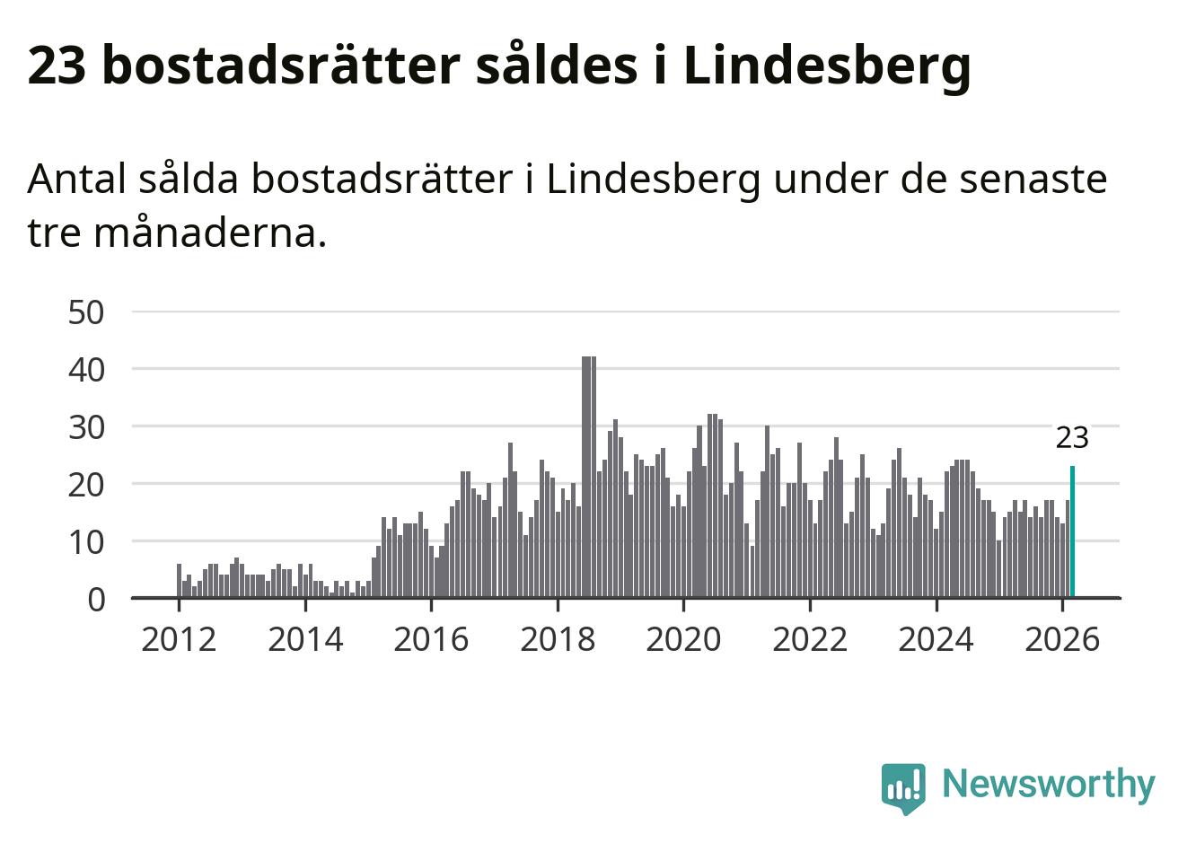 Mellan januari och mars såldes 23 bostadsrätter i Lindesbergs kommun. Det är relativt många sett till aktiviteten på bostadsmarknaden i kommunen under de senaste tolv månaderna, samt det historiska snittet för den här tiden på året.