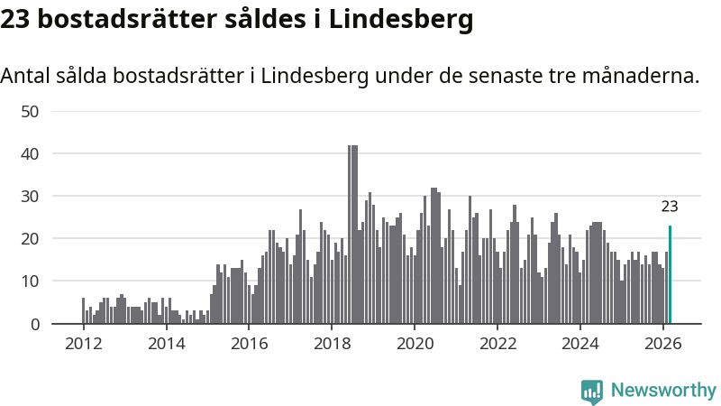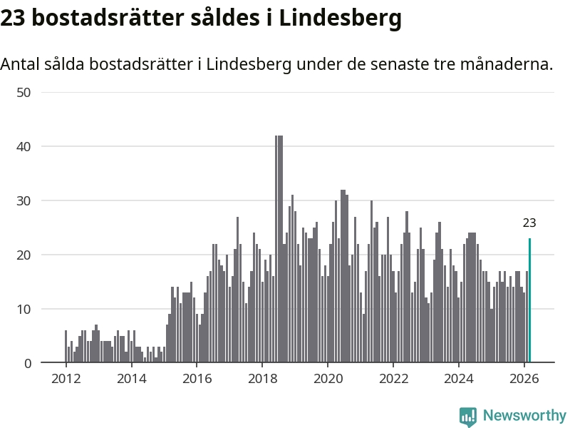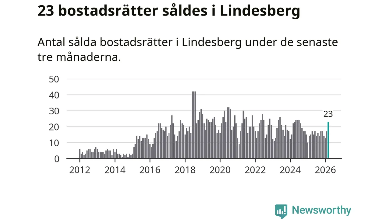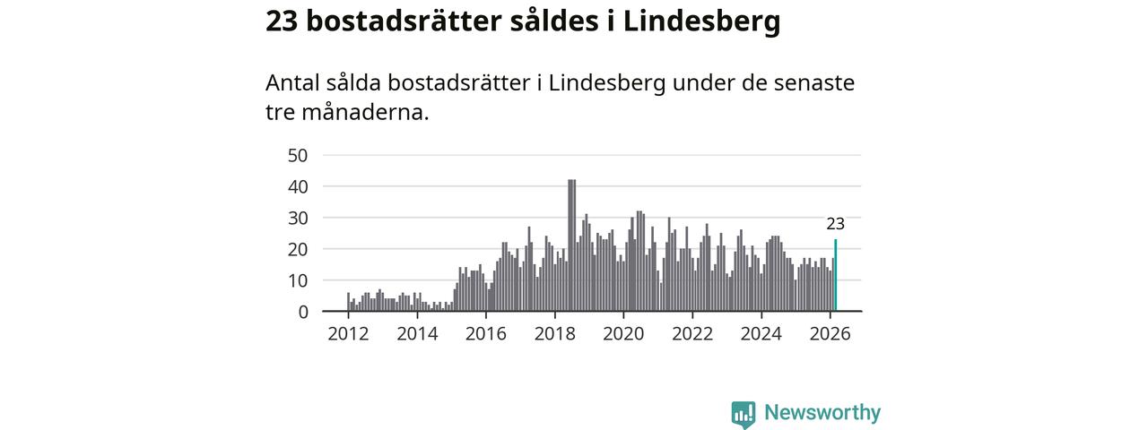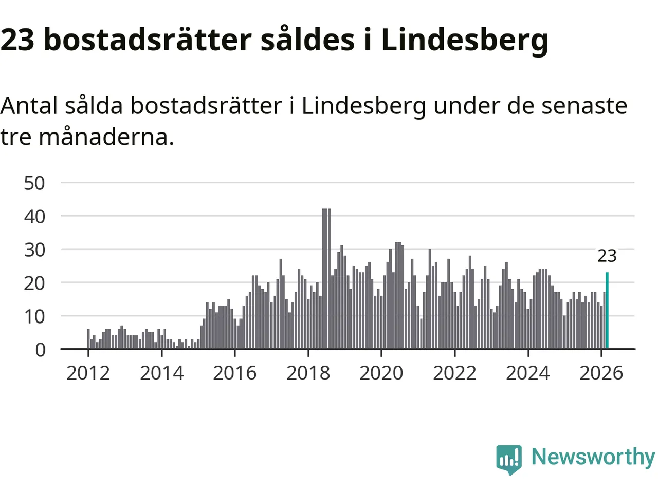 Mellan januari och mars såldes 23 bostadsrätter i Lindesbergs kommun. Det är relativt många sett till aktiviteten på bostadsmarknaden i kommunen under de senaste tolv månaderna, samt det historiska snittet för den här tiden på året.