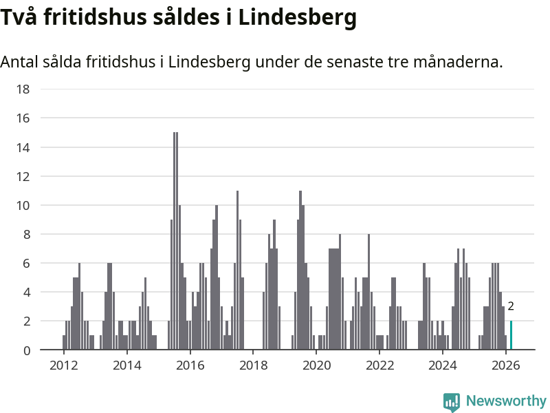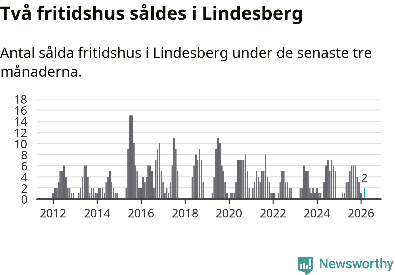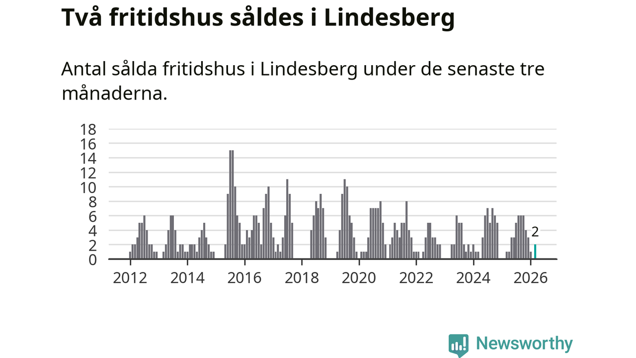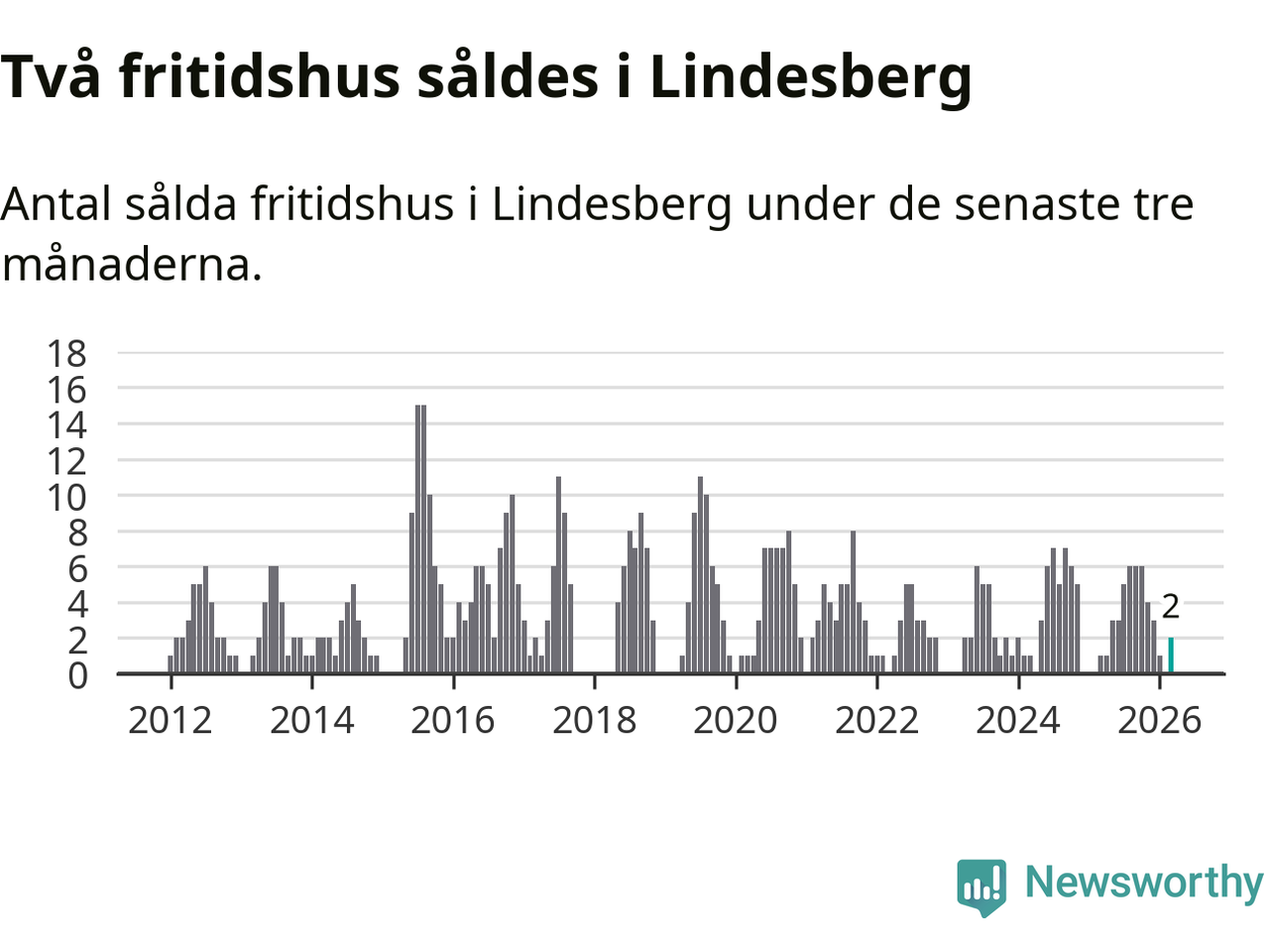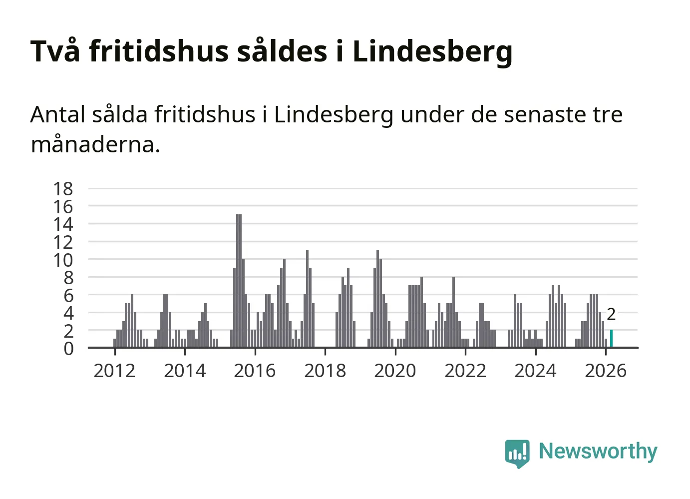 Mellan januari och mars gjordes sammanlagt två affärer med fritidshus i Lindesbergs kommun. Det kan jämföras med ett vid motsvarande tid i fjol.