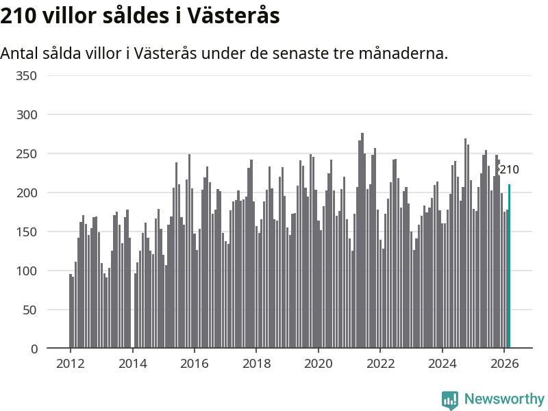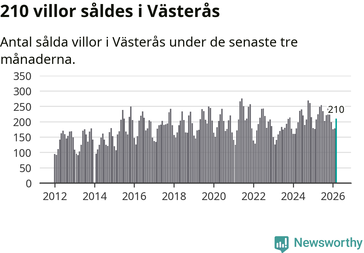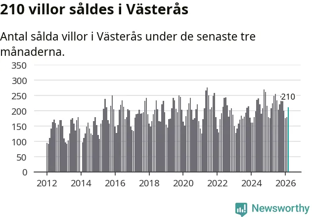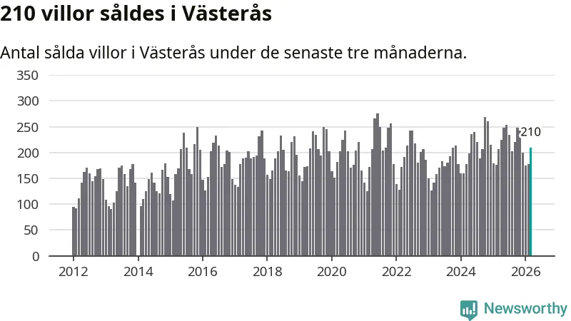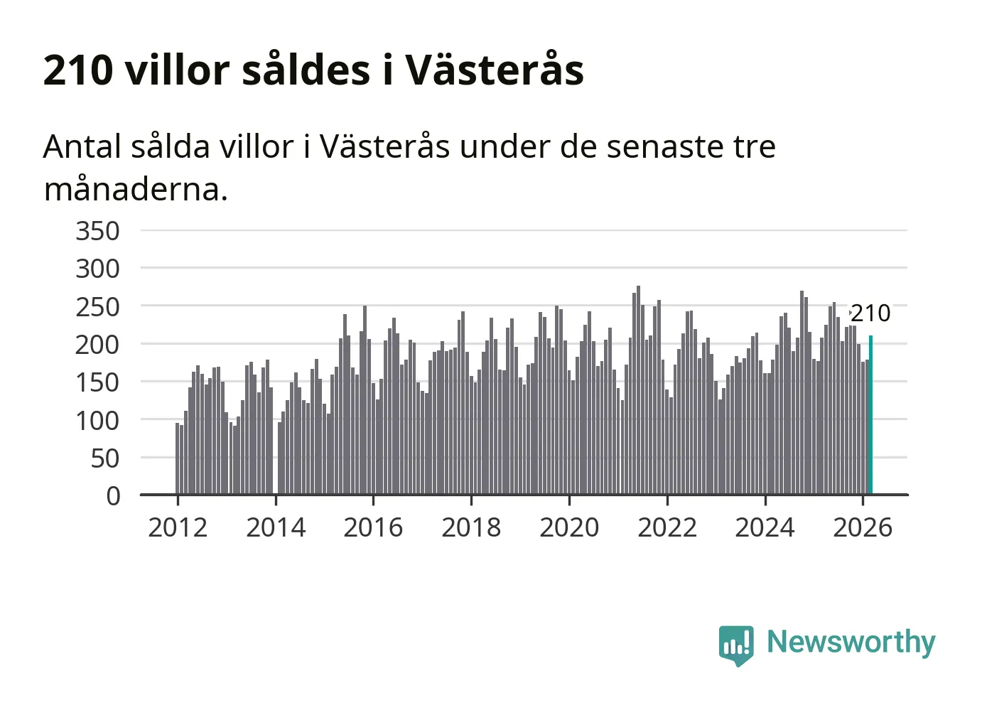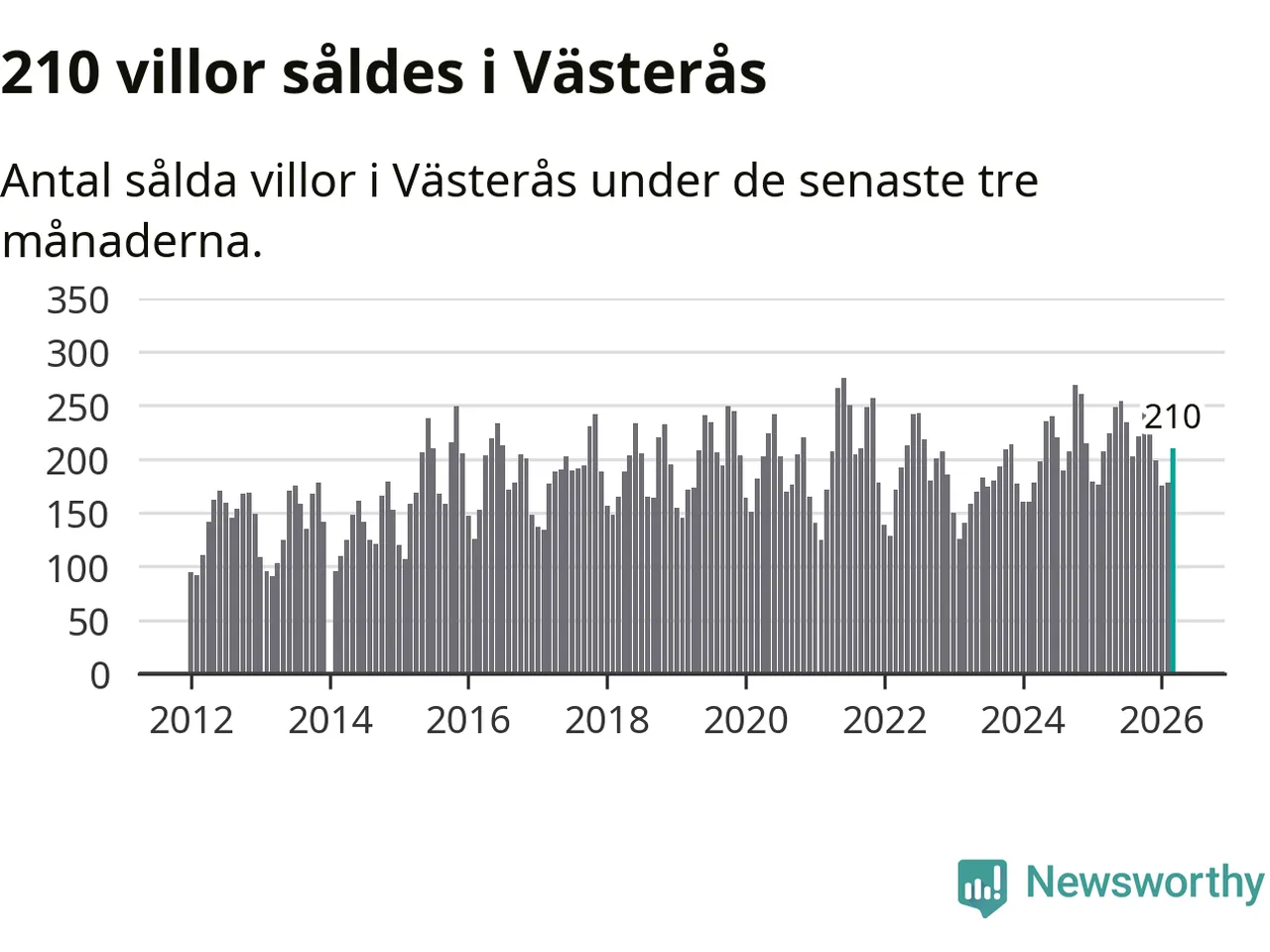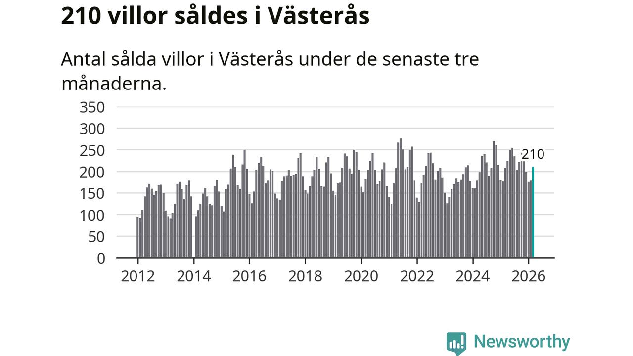 Sammanlagt såldes 210 villor i Västerås kommun mellan januari och mars till ett genomsnittligt pris på 4,1 miljoner kronor. I fjol gjordes 207 affärer vid den här tiden på året.