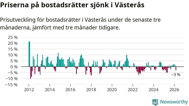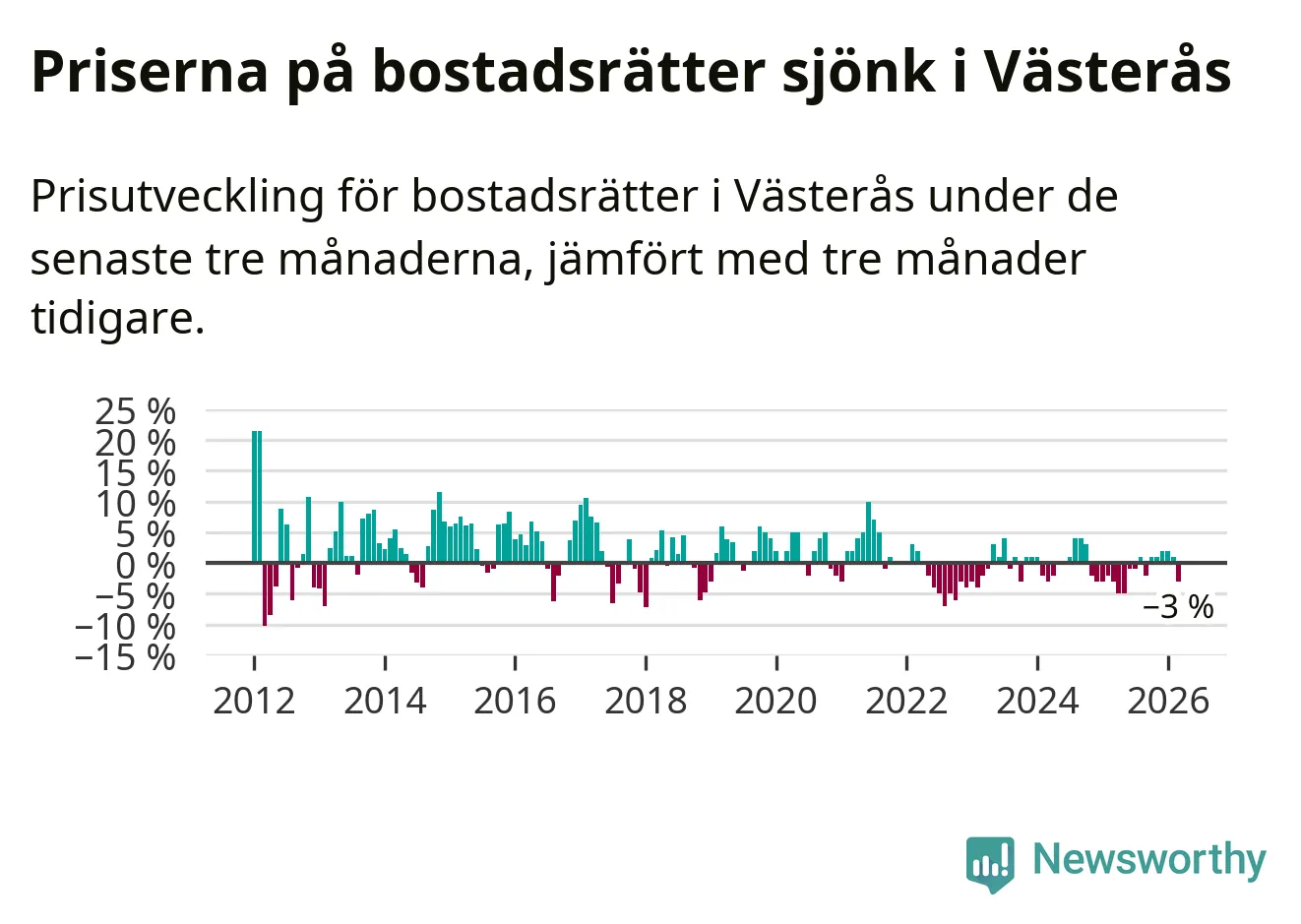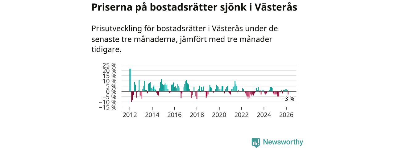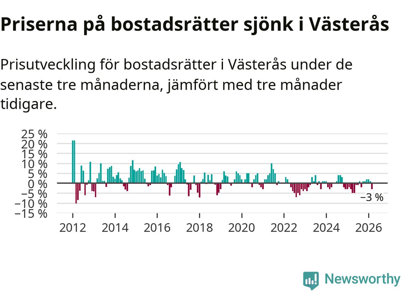 Statistiken visar även på en prisnedgång i Västerås kommun. Medelpriset på försäljningarna av bostadsrätter i kommunen var 3 procent lägre än för tre månader sedan. I hela Västmanland däremot ökar priserna på bostadsrätter. I hela länet noterades en prisuppgång på 1 procent.