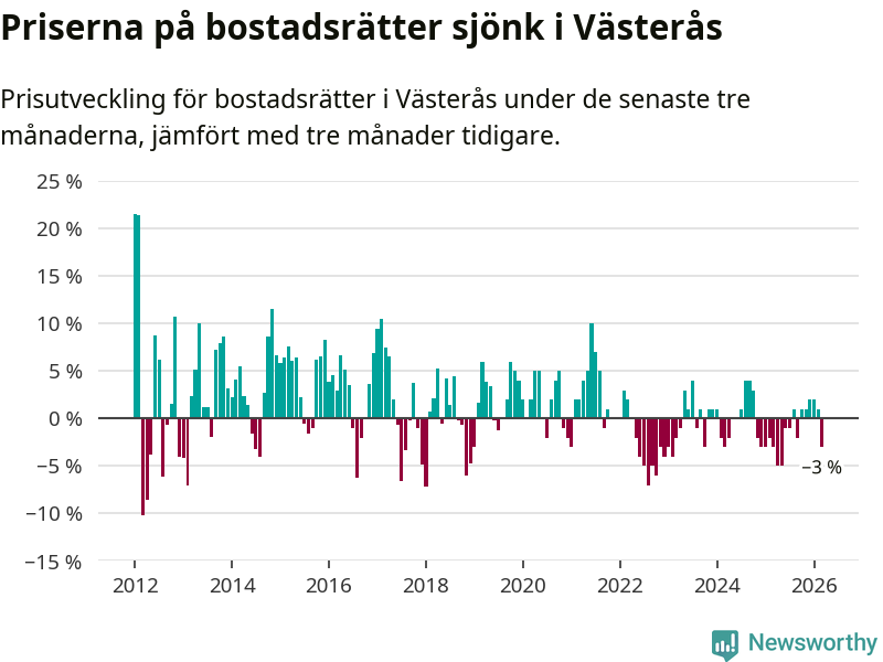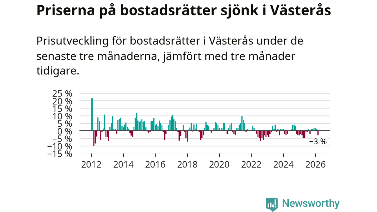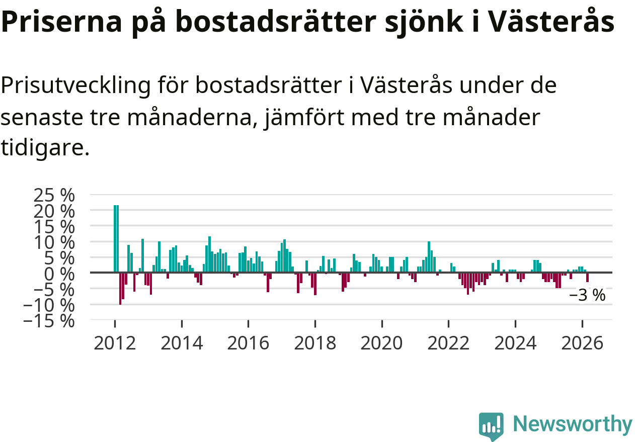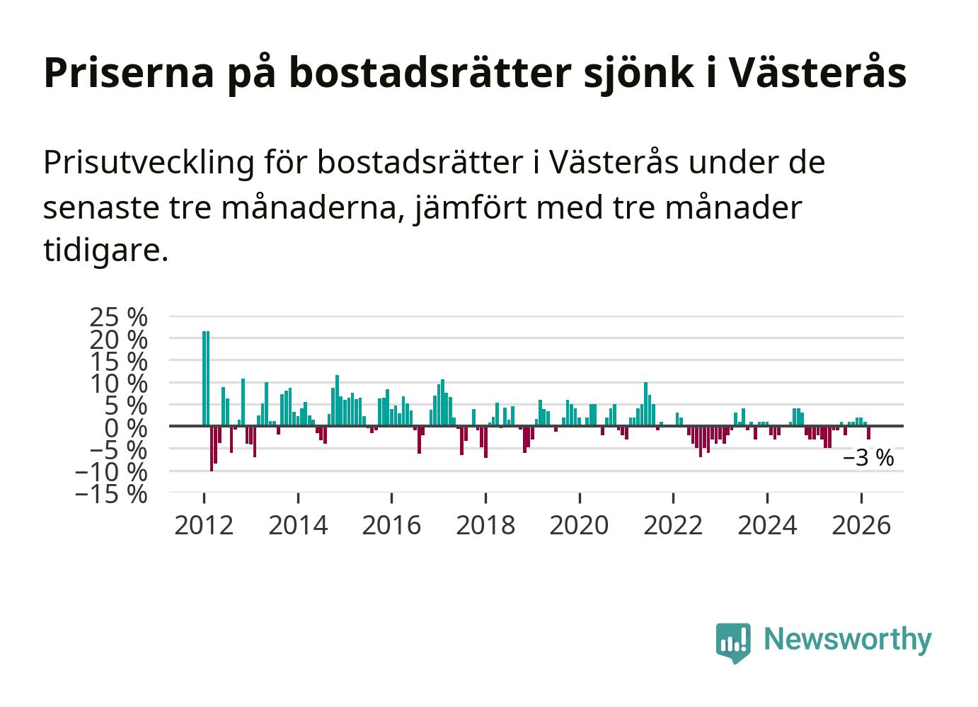 Statistiken visar även på en prisnedgång i Västerås kommun. Medelpriset på försäljningarna av bostadsrätter i kommunen var 3 procent lägre än för tre månader sedan. I hela Västmanland däremot ökar priserna på bostadsrätter. I hela länet noterades en prisuppgång på 1 procent.