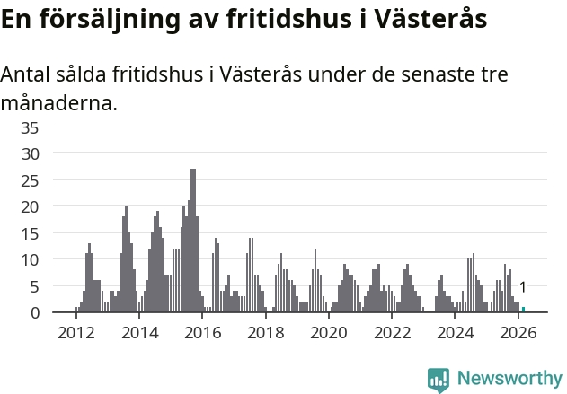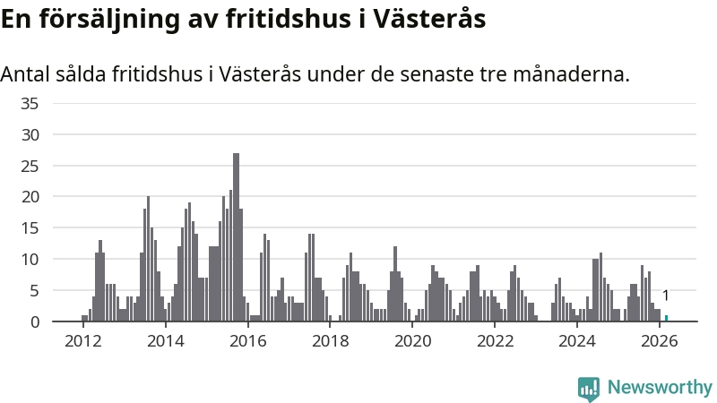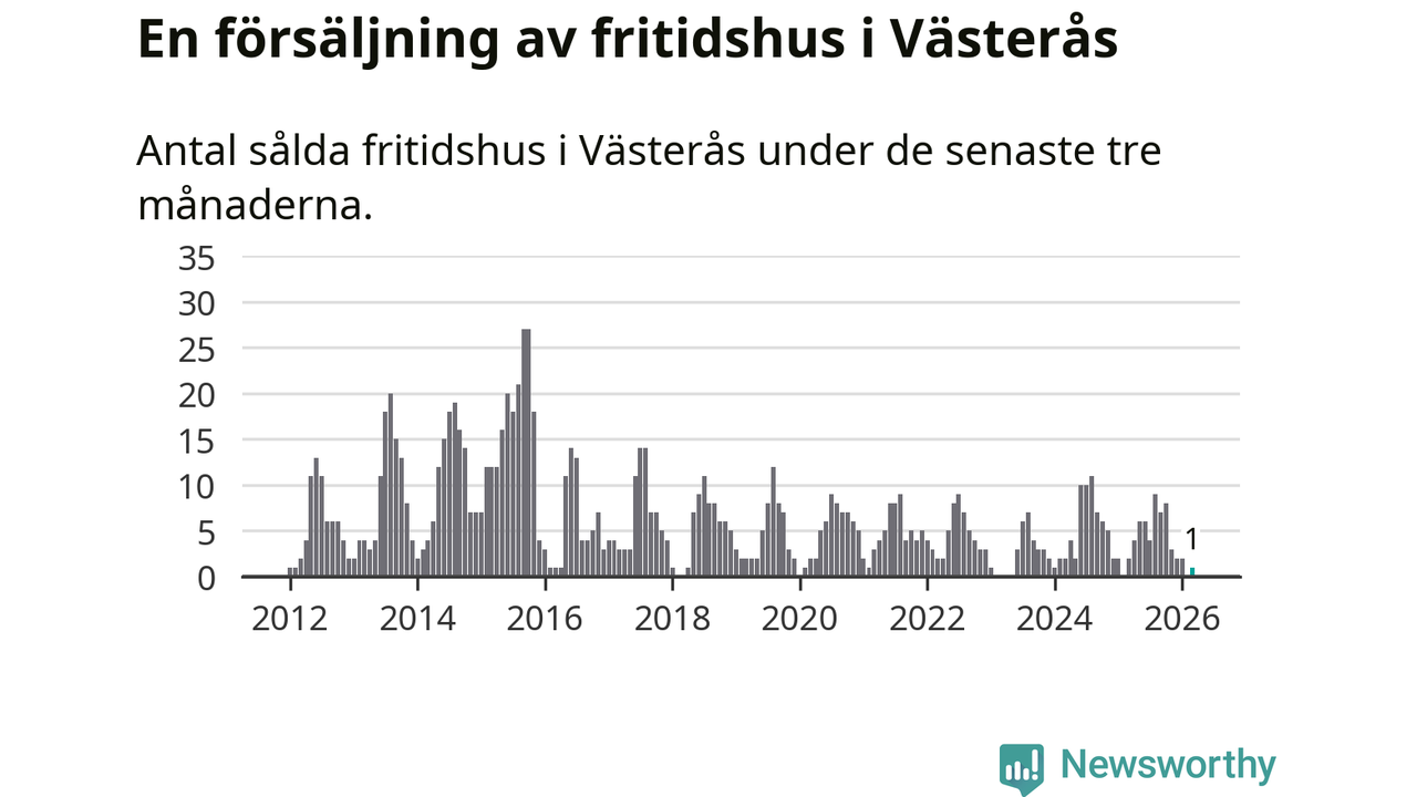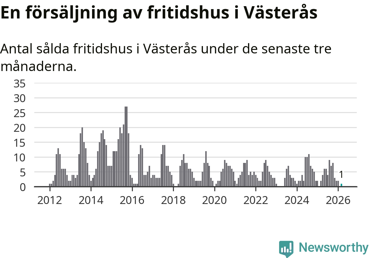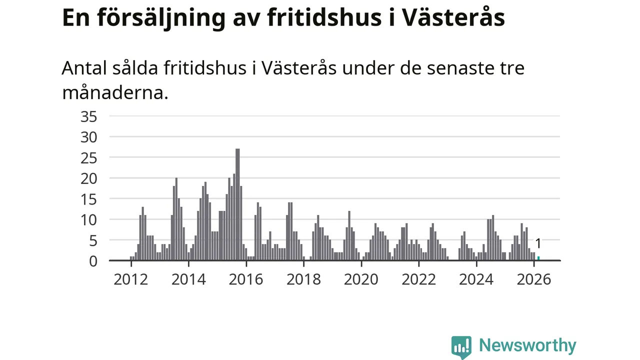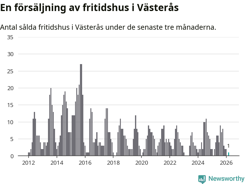 Mellan januari och mars gjordes sammanlagt en affär med fritidshus i Västerås kommun. Det kan jämföras med två vid motsvarande tid i fjol.