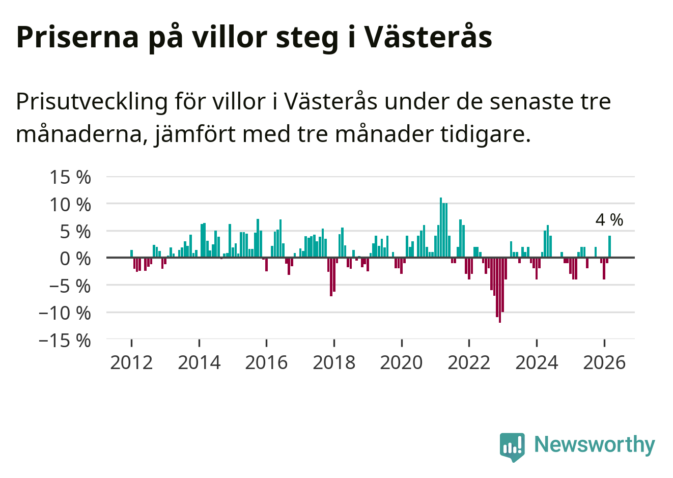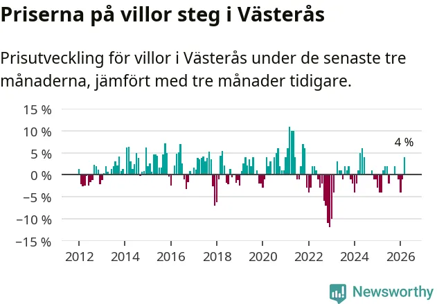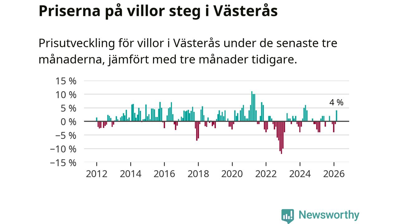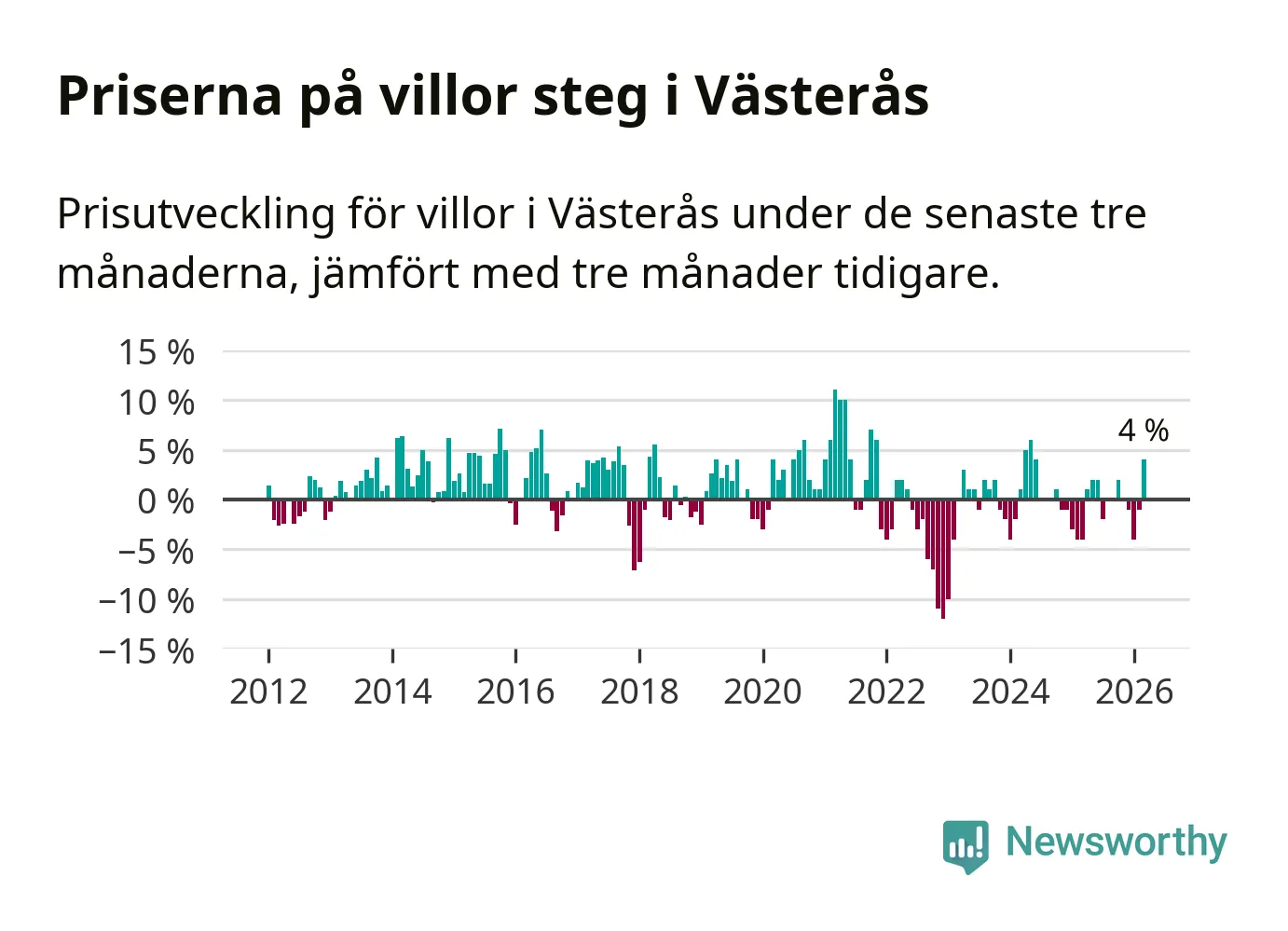 Villapriserna har gått upp i Västerås kommun. Medelpriset på försäljningarna under de senaste tre månaderna visar på en uppgång med 4 procent.