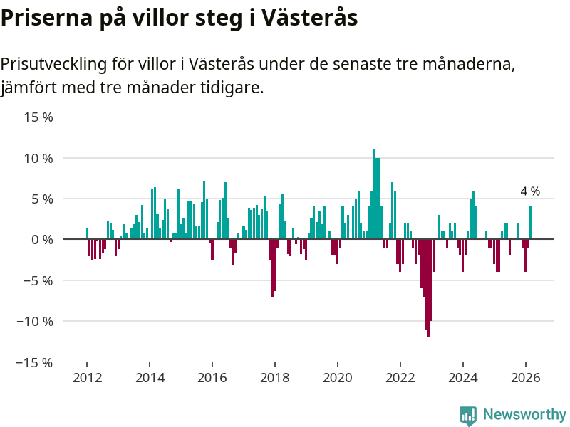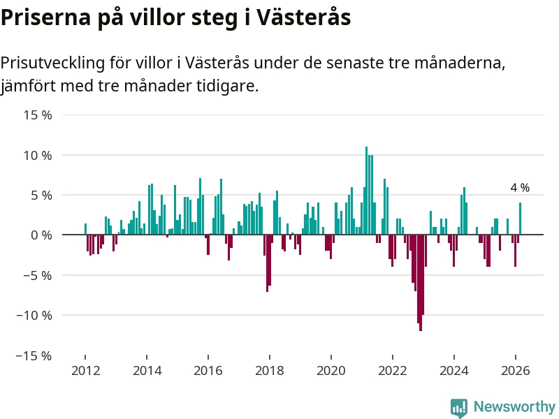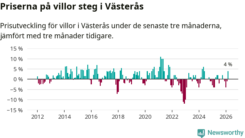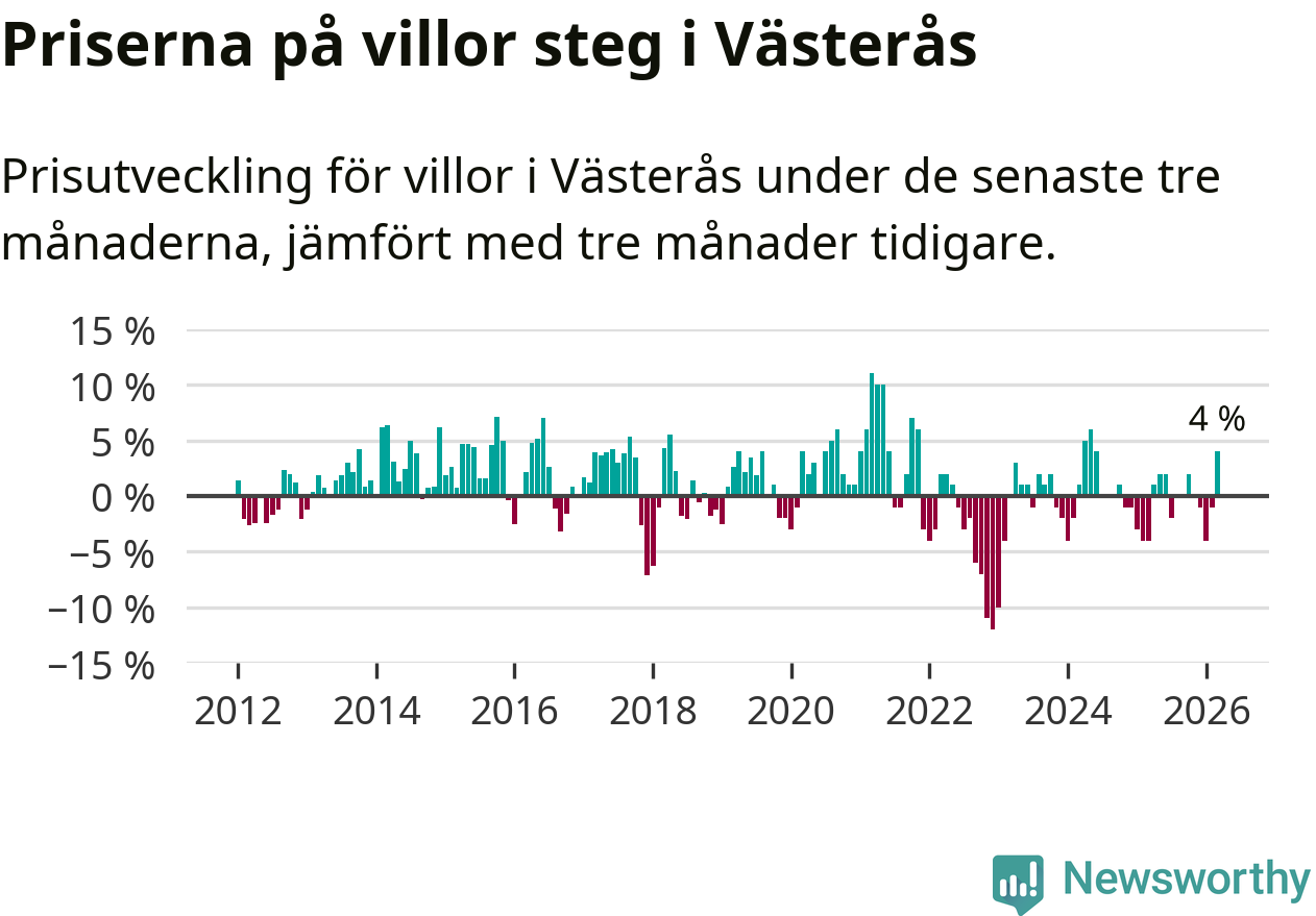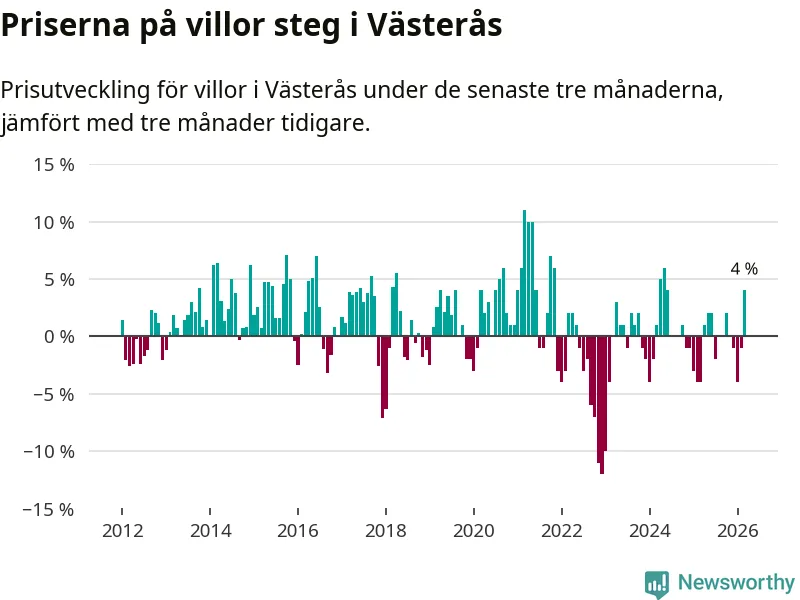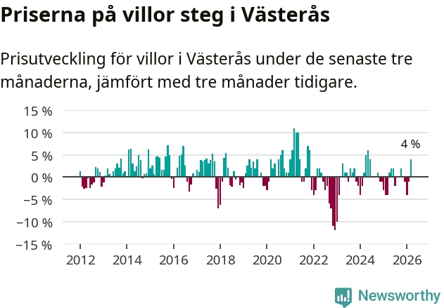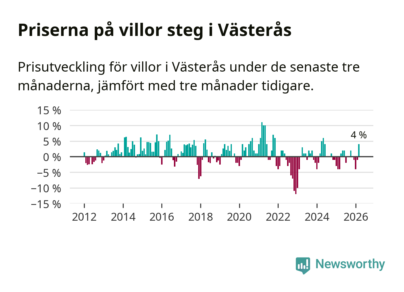 Villapriserna har gått upp i Västerås kommun. Medelpriset på försäljningarna under de senaste tre månaderna visar på en uppgång med 4 procent.