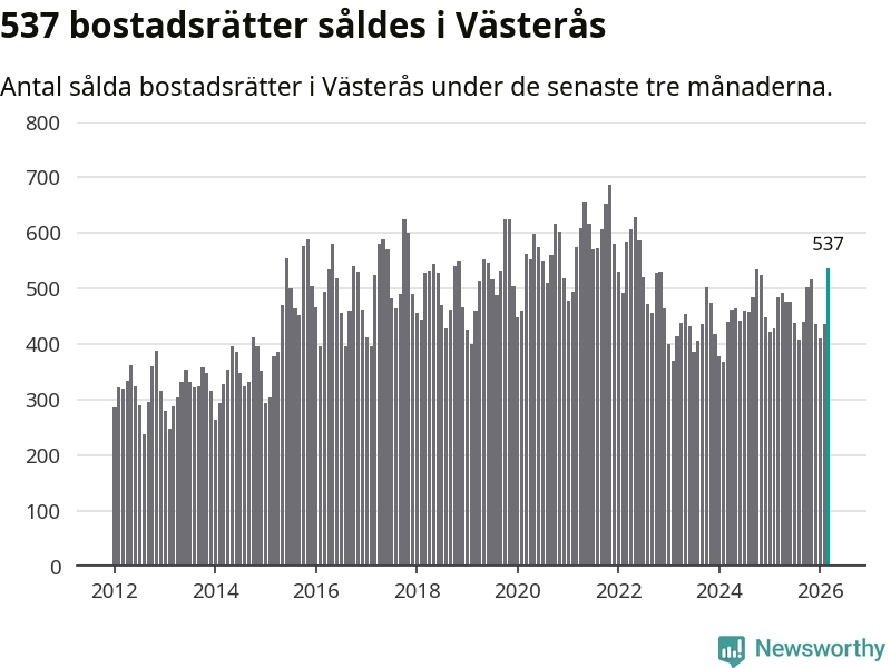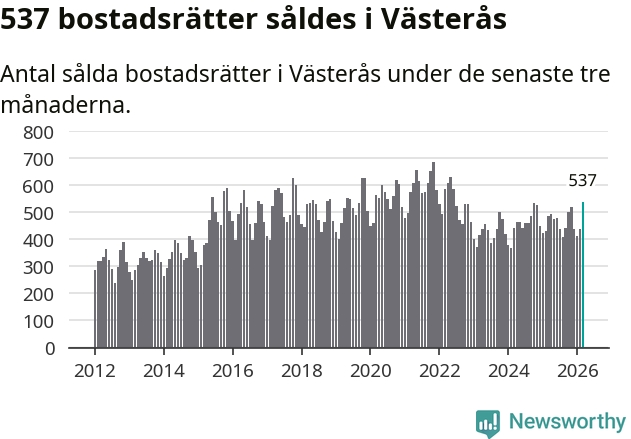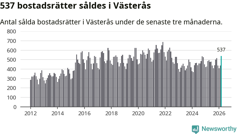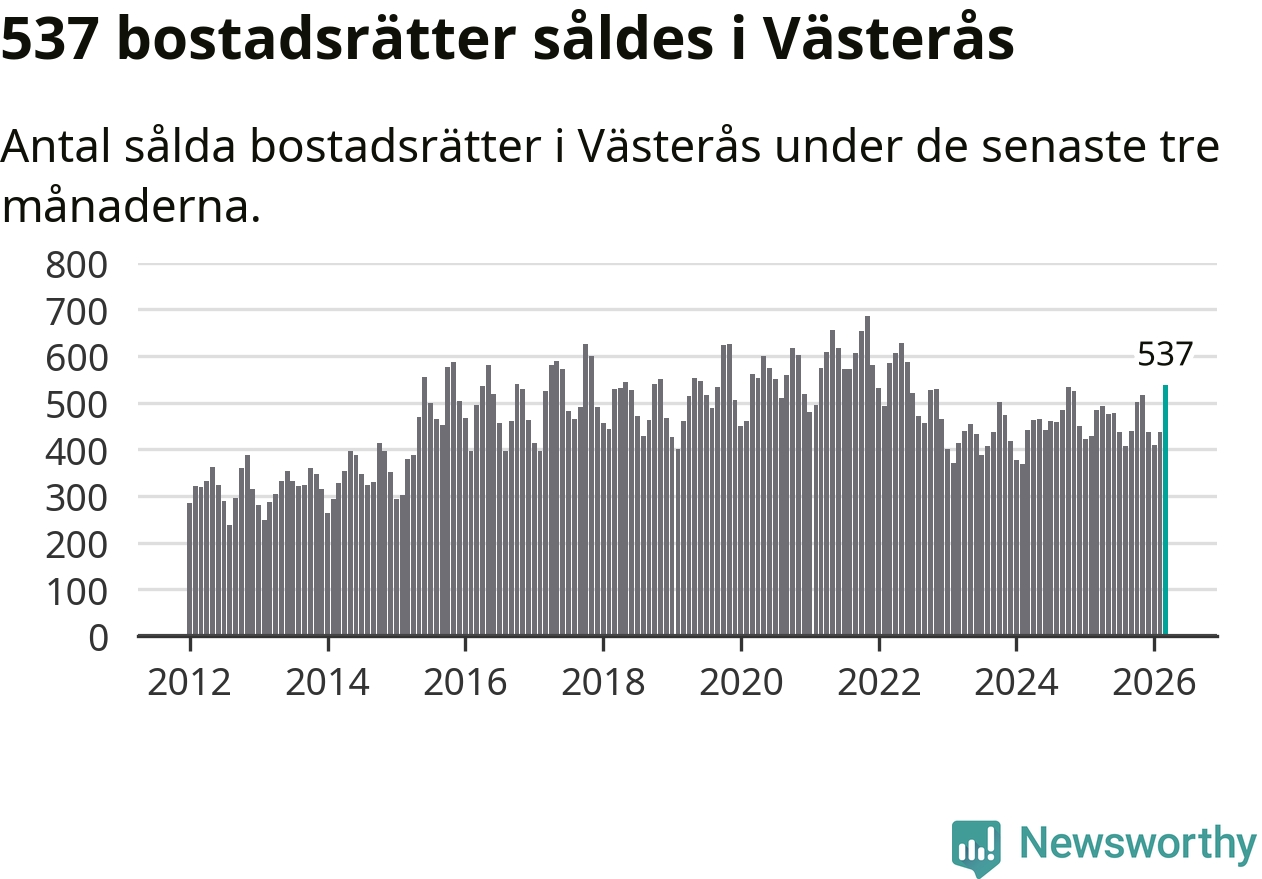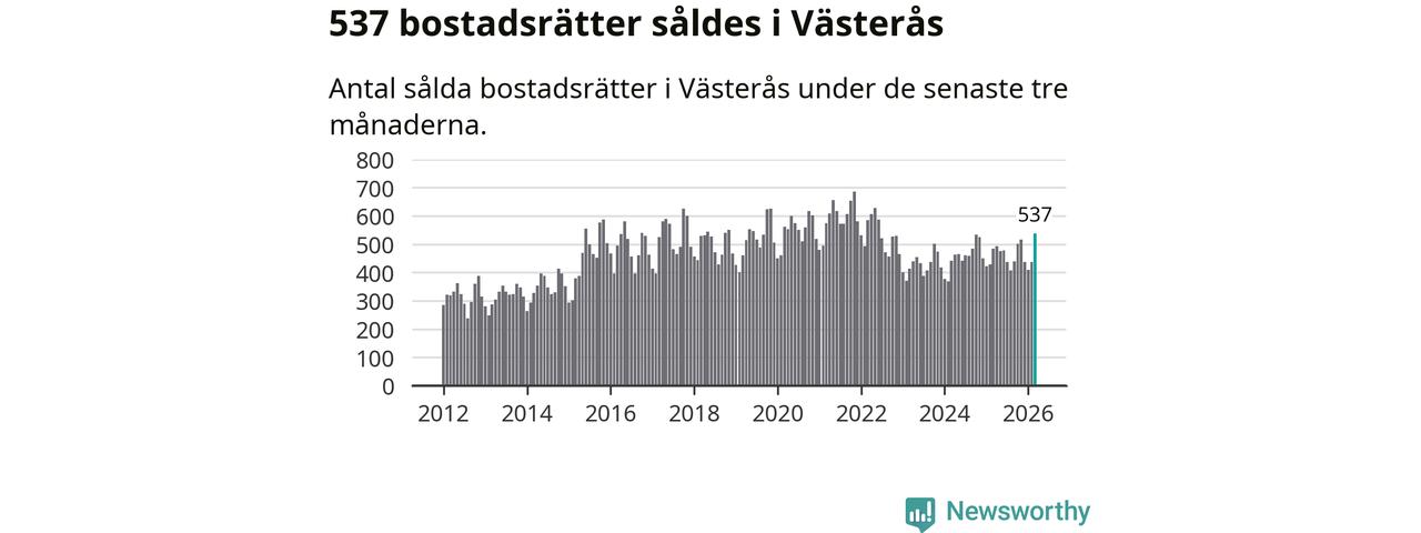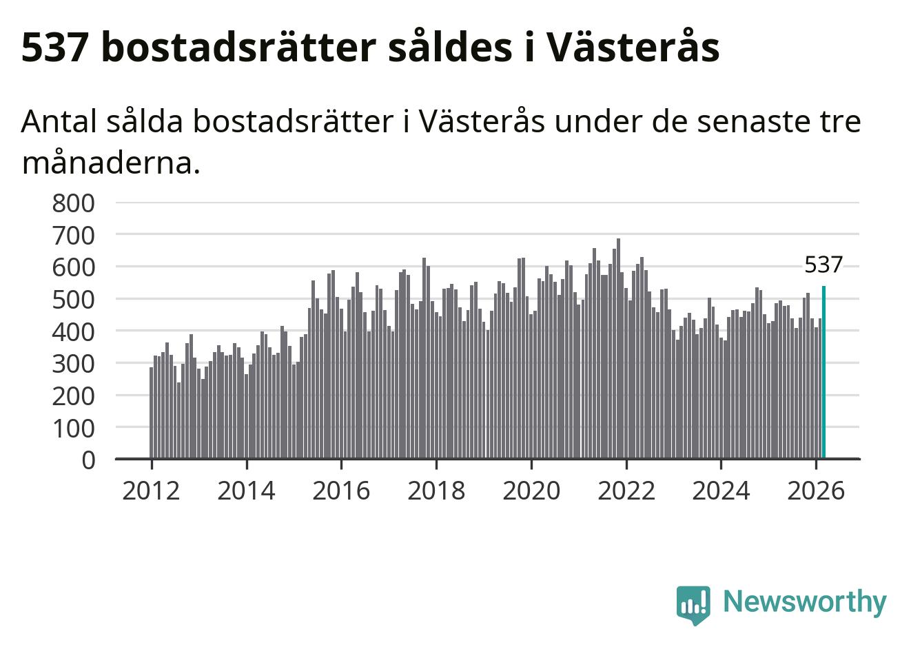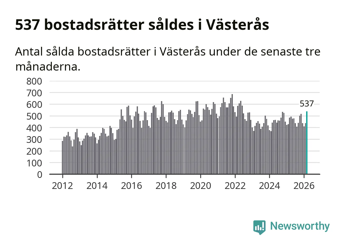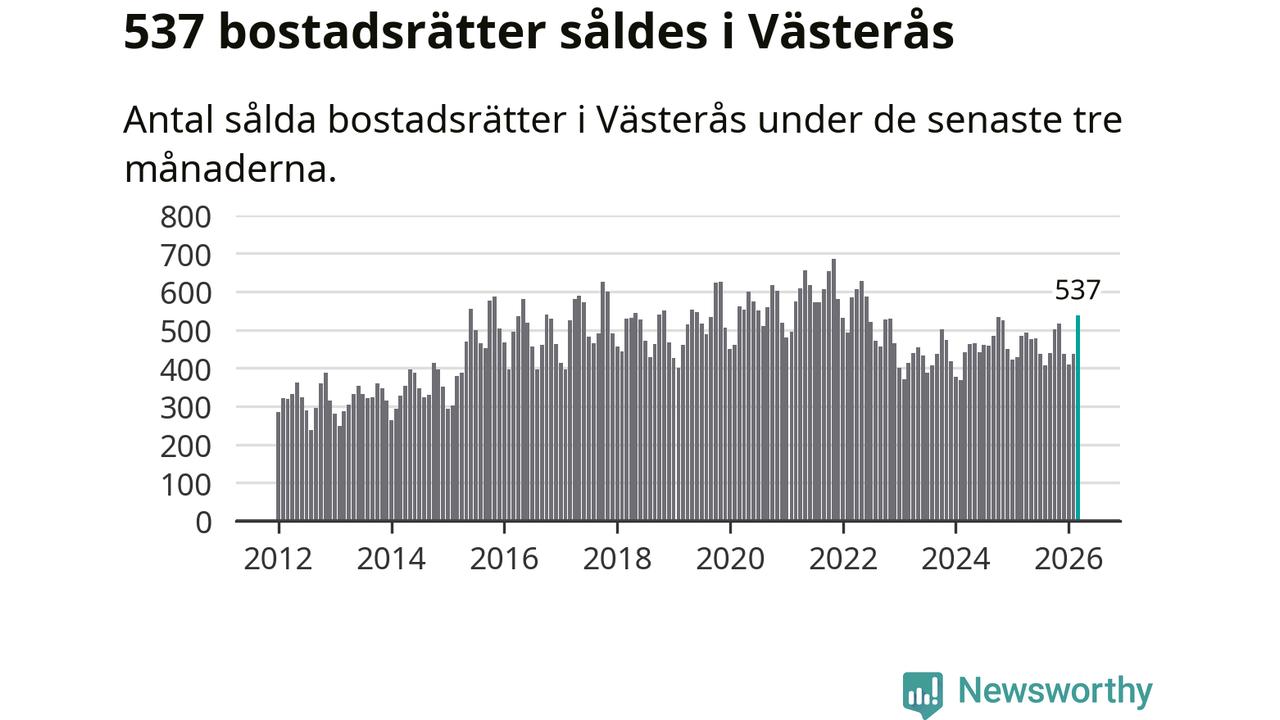 Mellan januari och mars såldes 537 bostadsrätter i Västerås kommun. Det är fler än någon tremånadersperiod sedan 2022.