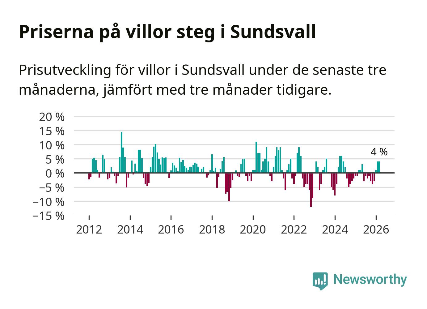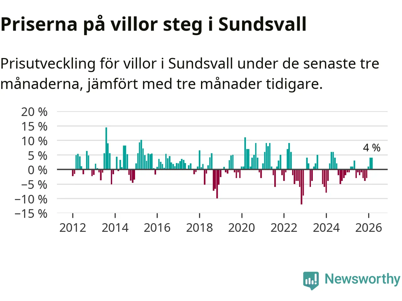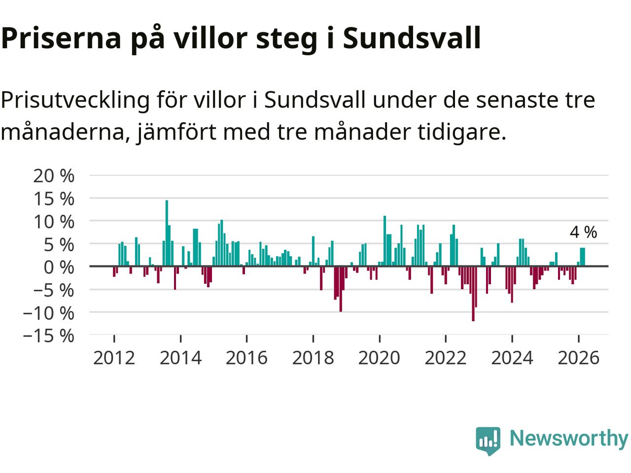 Villapriserna har gått upp i Sundsvalls kommun. Medelpriset på försäljningarna under de senaste tre månaderna visar på en uppgång med 4 procent.