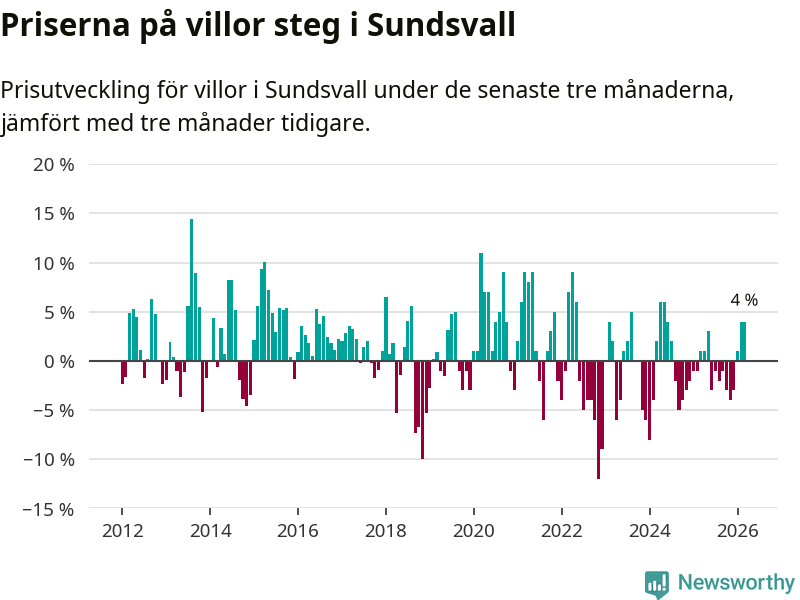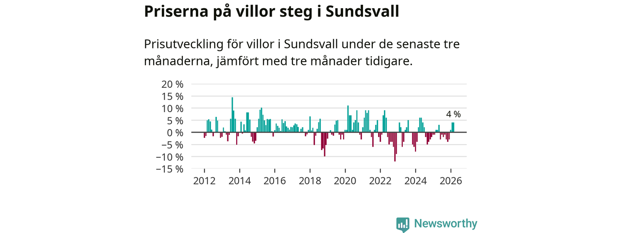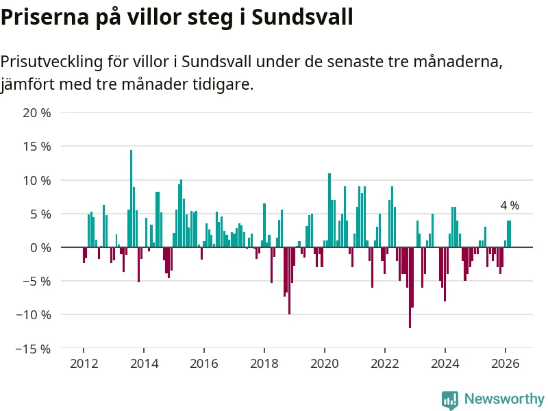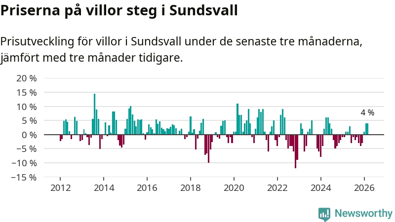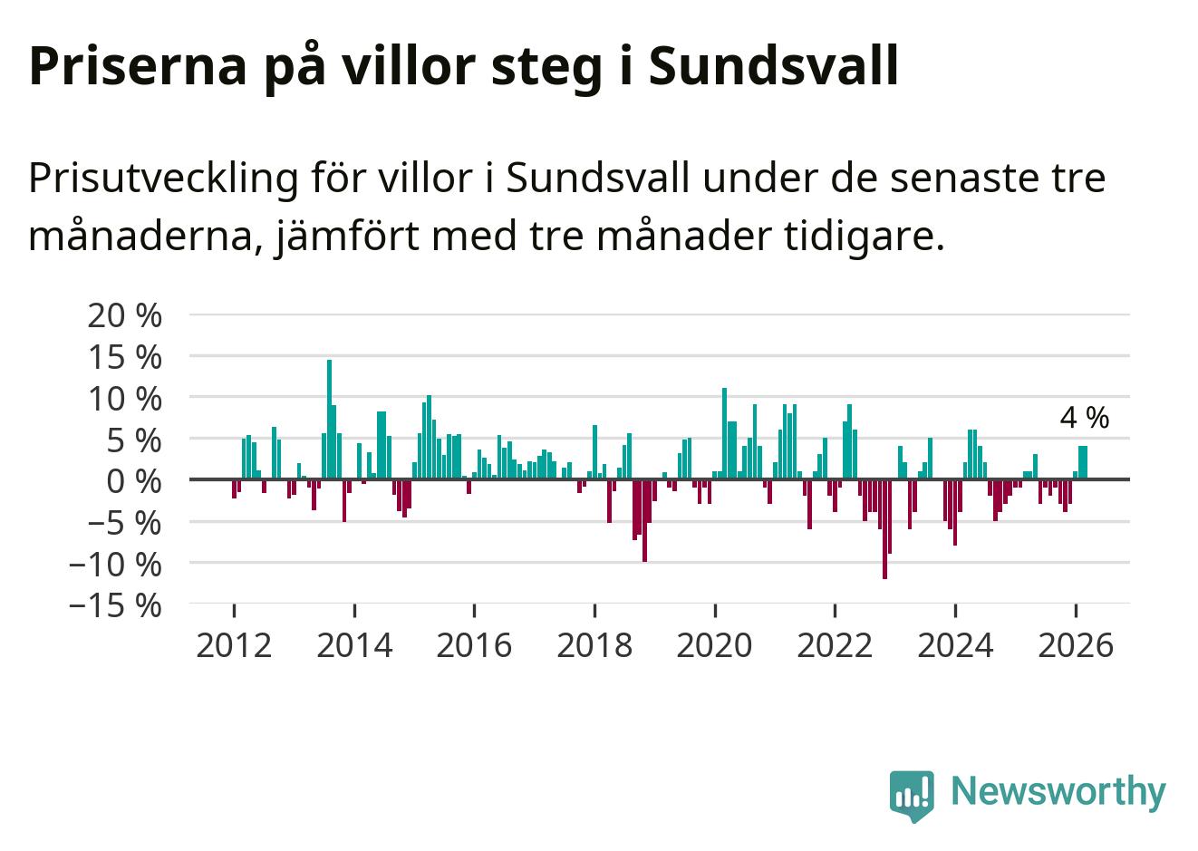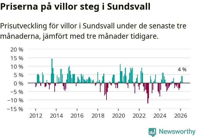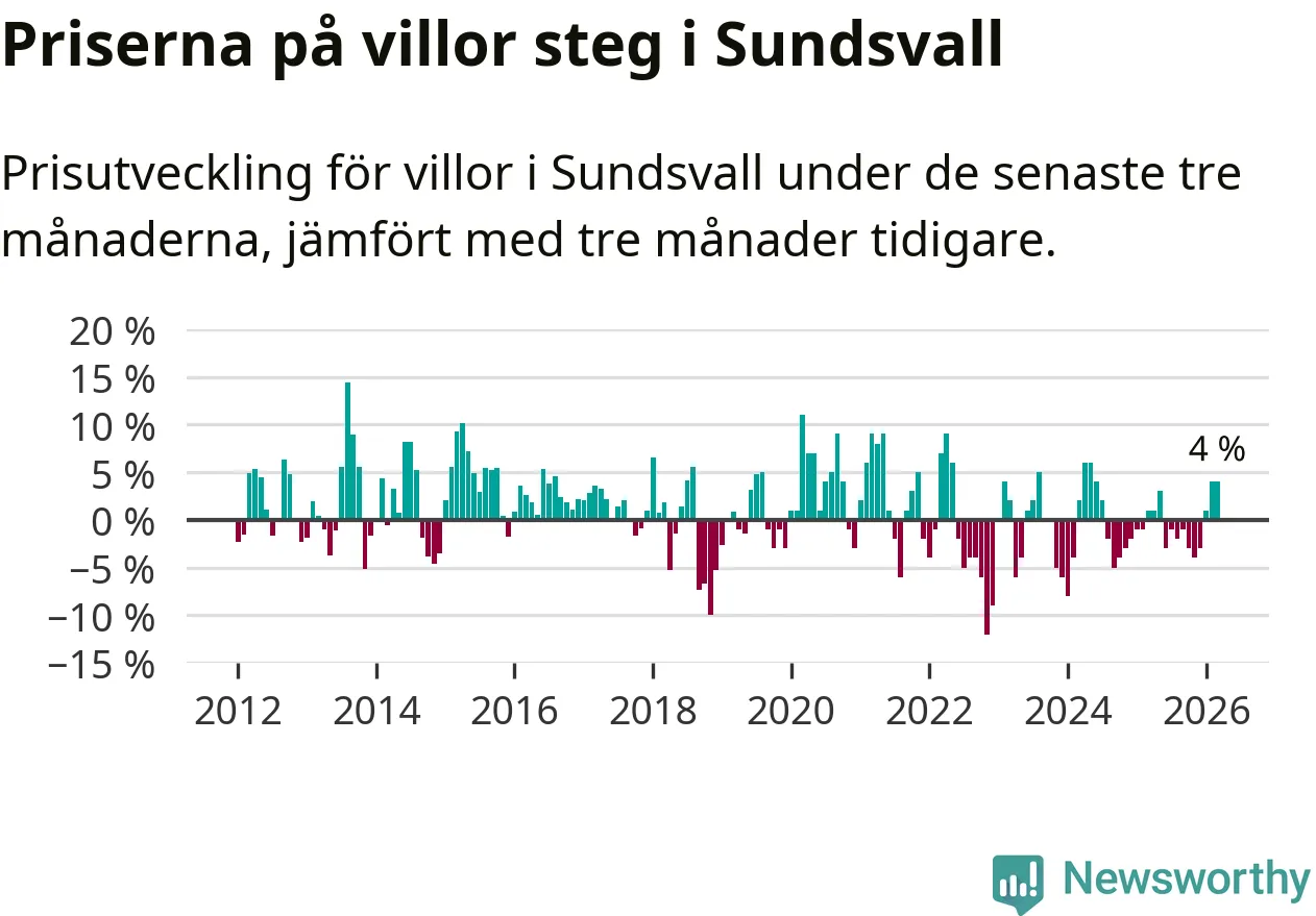 Villapriserna har gått upp i Sundsvalls kommun. Medelpriset på försäljningarna under de senaste tre månaderna visar på en uppgång med 4 procent.