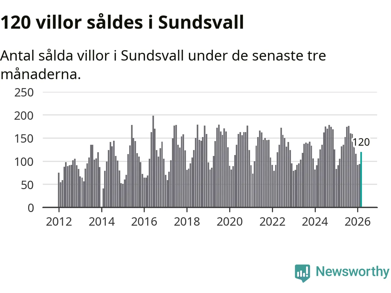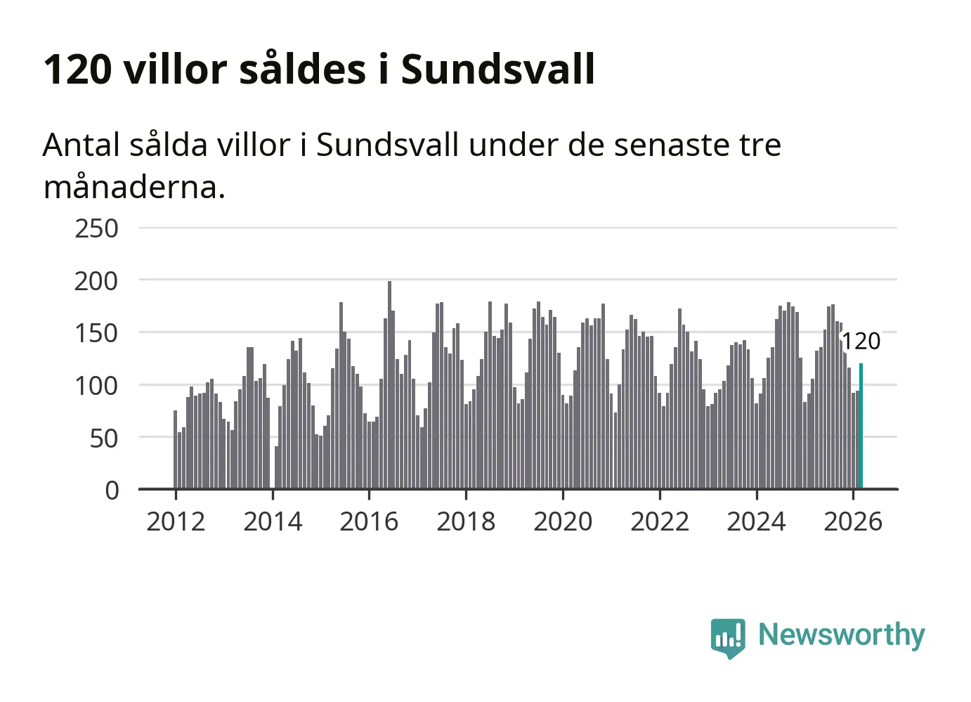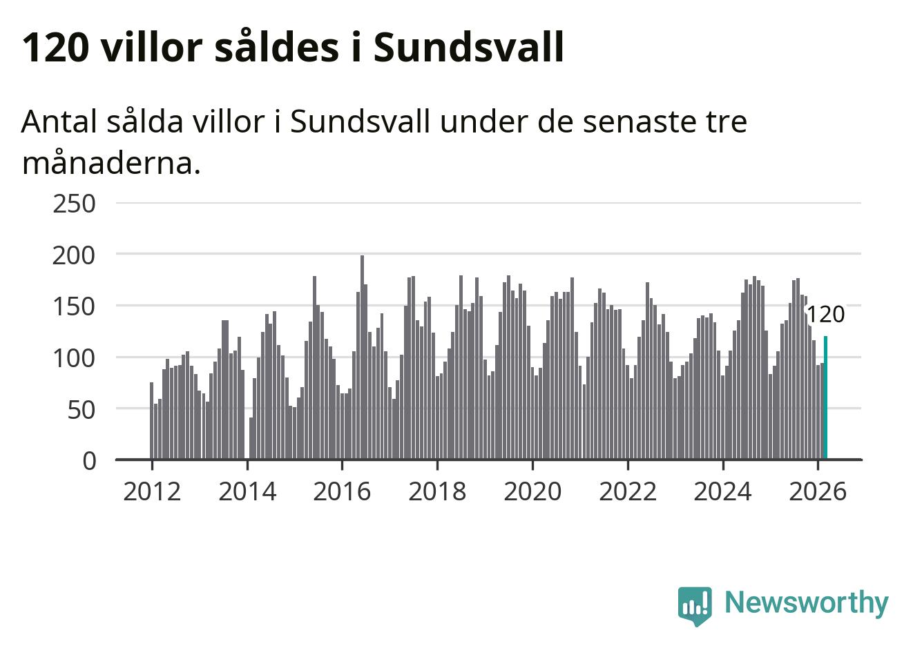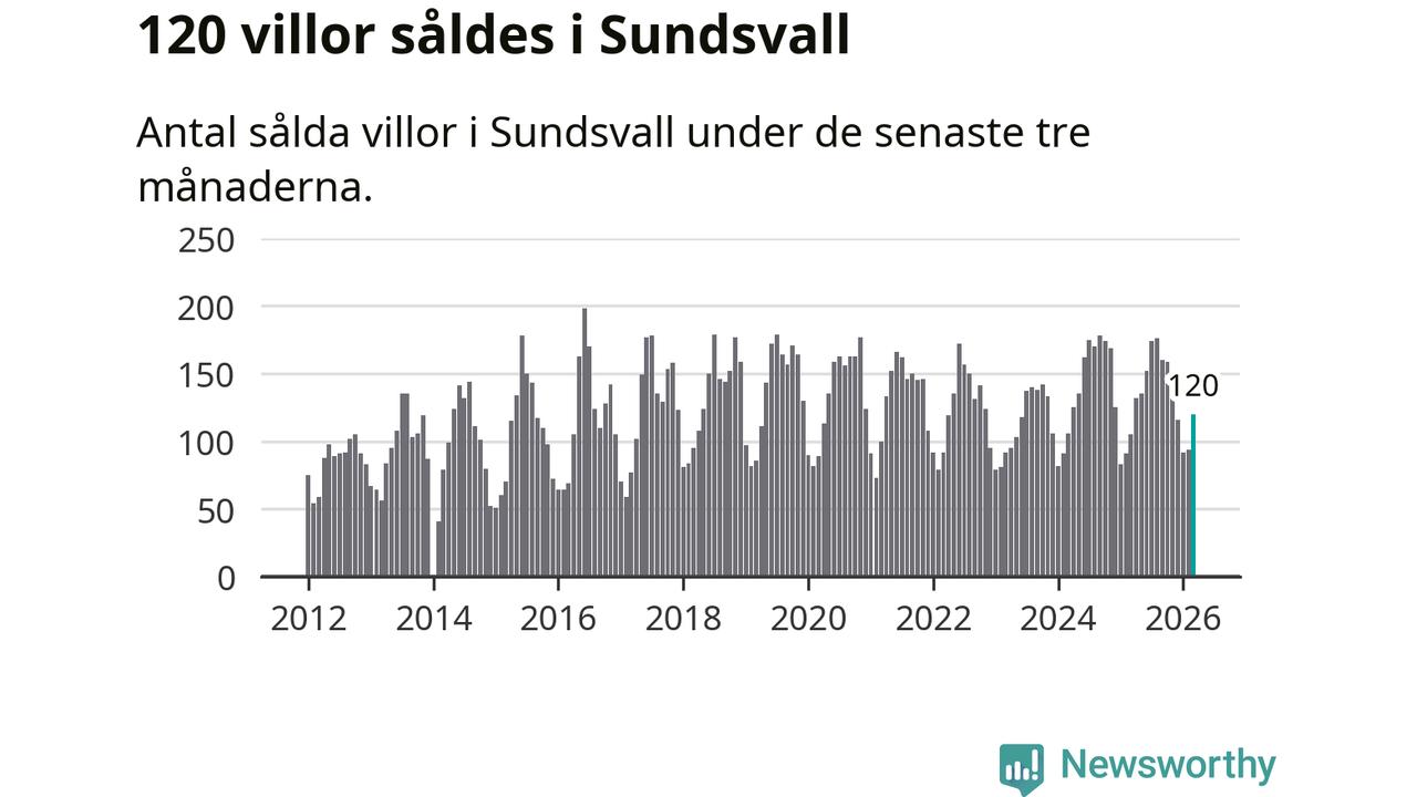 Sammanlagt såldes 120 villor i Sundsvalls kommun mellan januari och mars till ett genomsnittligt pris på 2,7 miljoner kronor. I fjol gjordes 105 affärer vid den här tiden på året.
