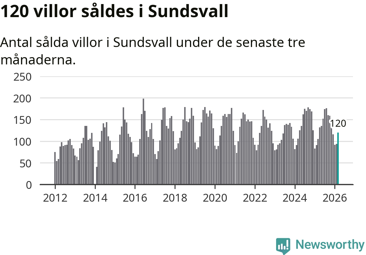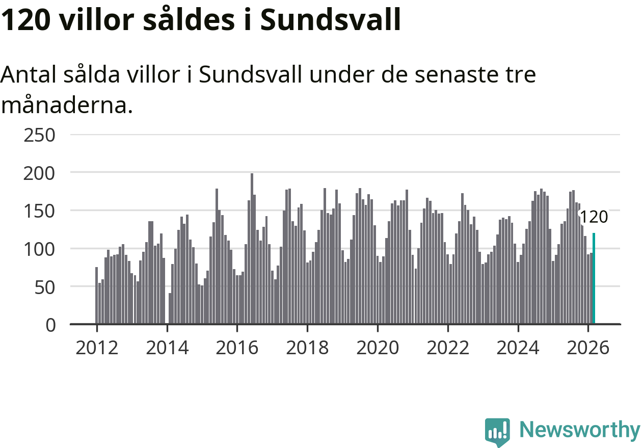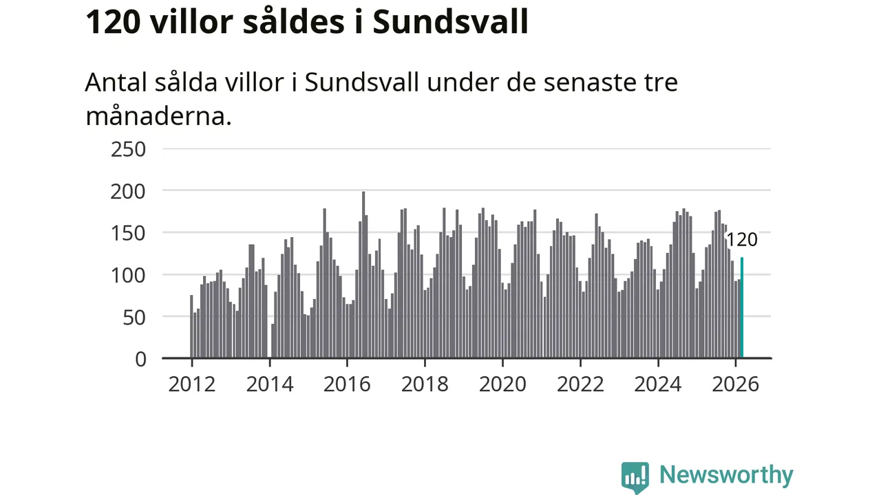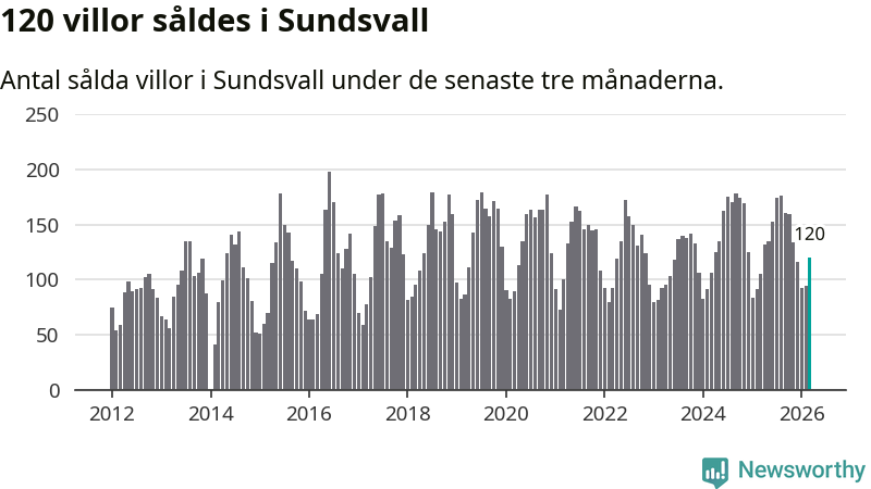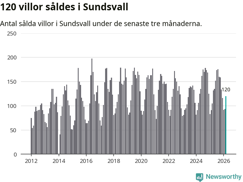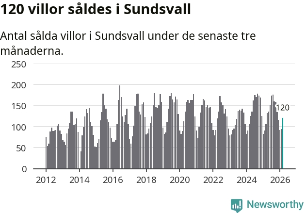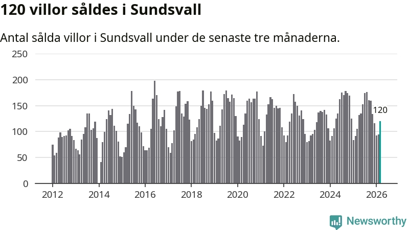 Sammanlagt såldes 120 villor i Sundsvalls kommun mellan januari och mars till ett genomsnittligt pris på 2,7 miljoner kronor. I fjol gjordes 105 affärer vid den här tiden på året.