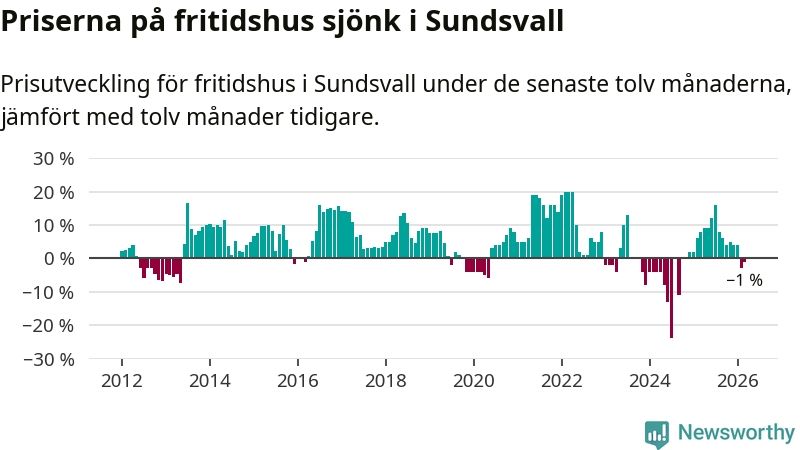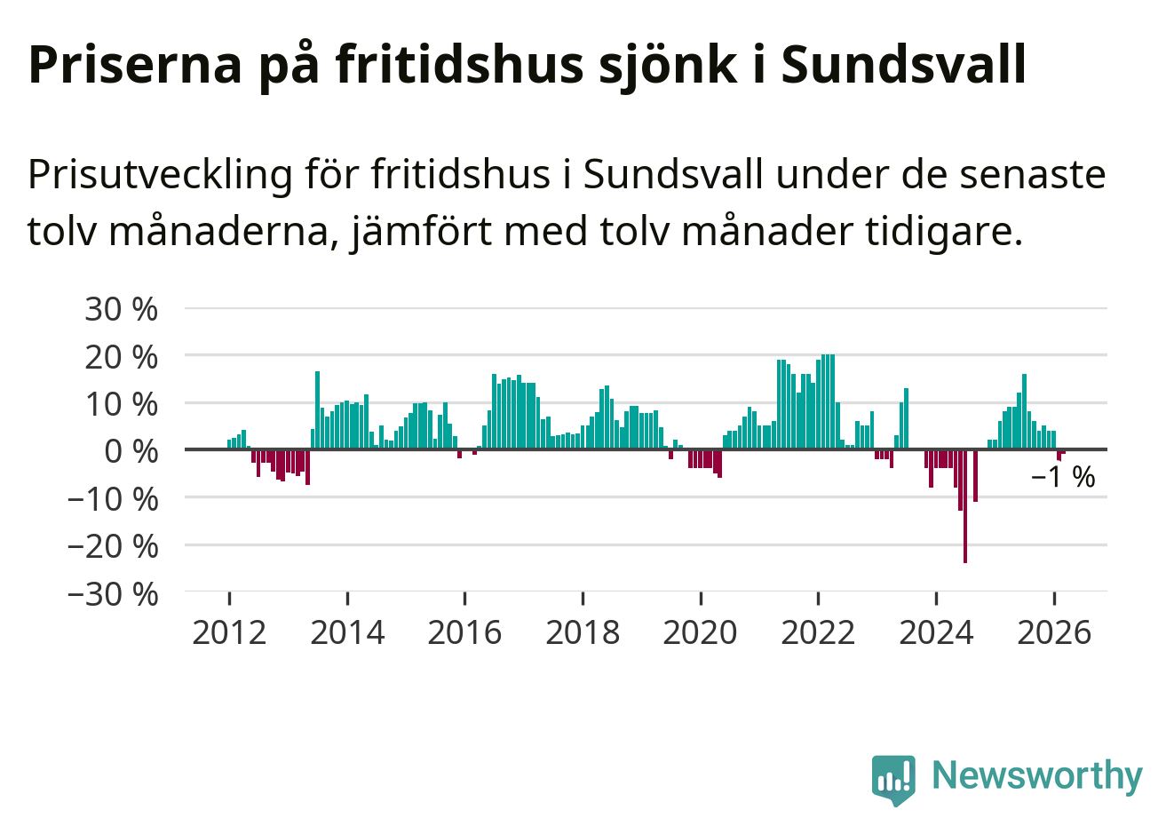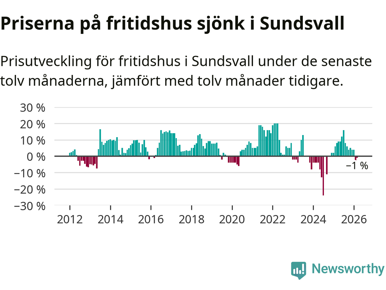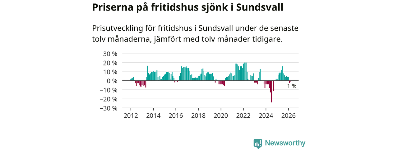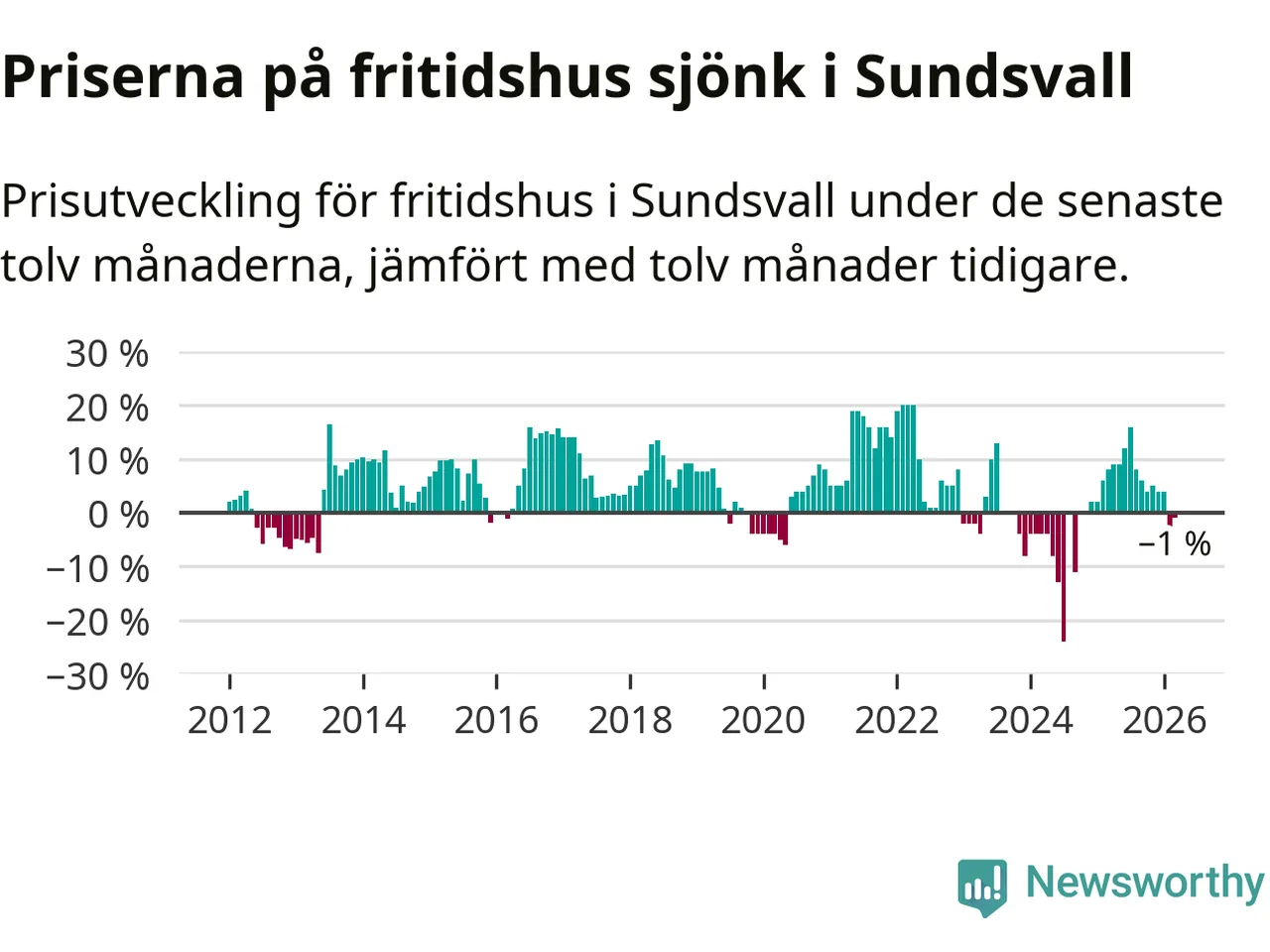Priserna på fritidshus har gått ner i Sundsvalls kommun. Medelpriset på försäljningarna under de senaste tolv månaderna visar på en nedgång med 1 procent.