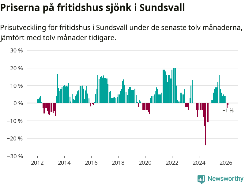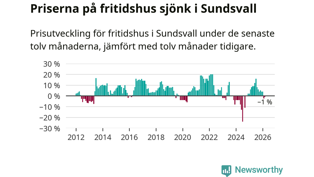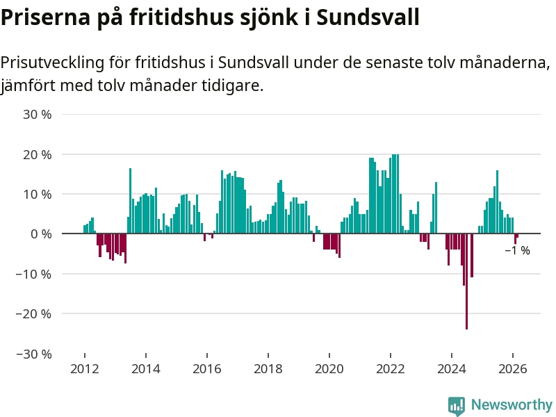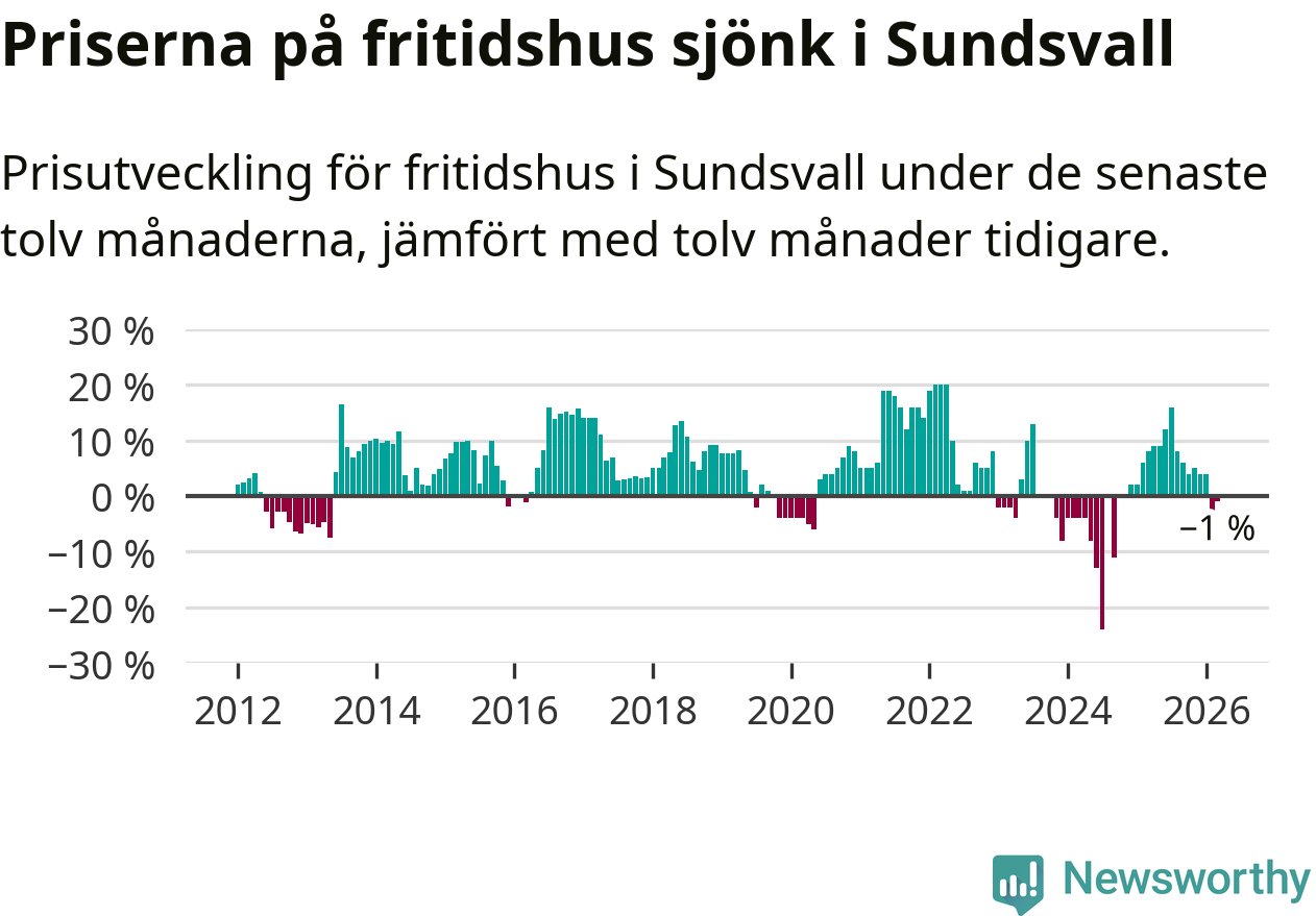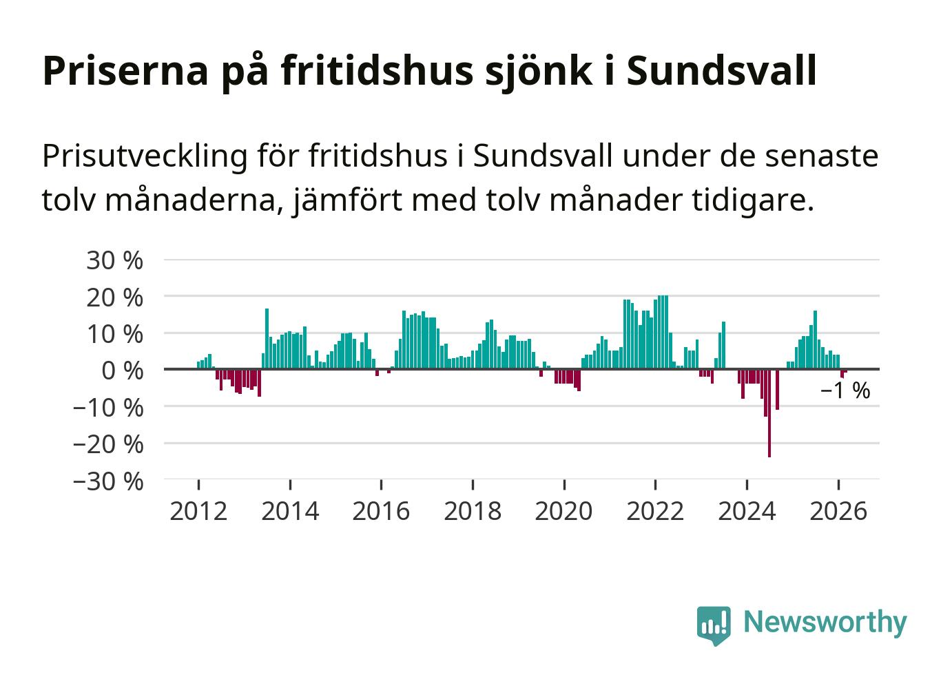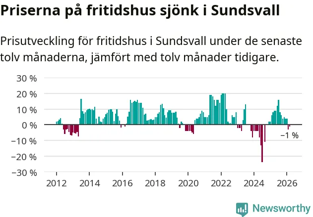 Priserna på fritidshus har gått ner i Sundsvalls kommun. Medelpriset på försäljningarna under de senaste tolv månaderna visar på en nedgång med 1 procent.
