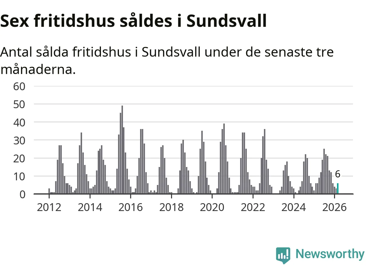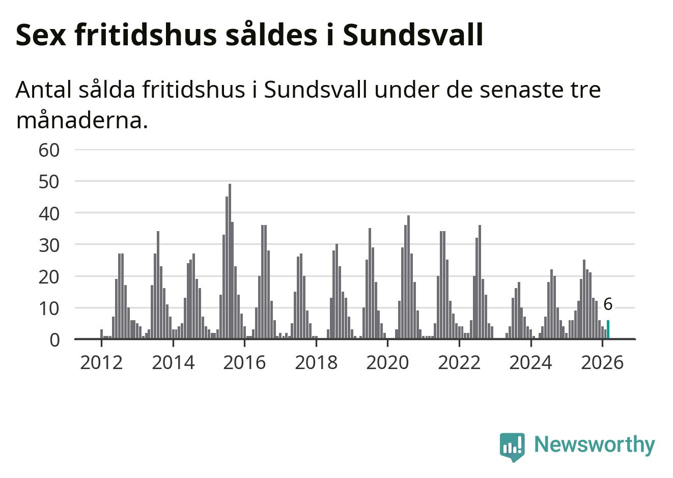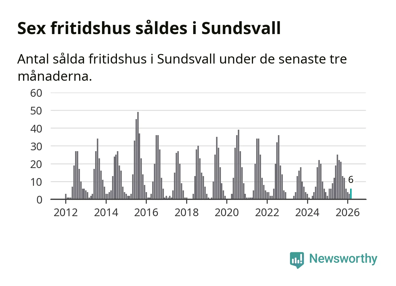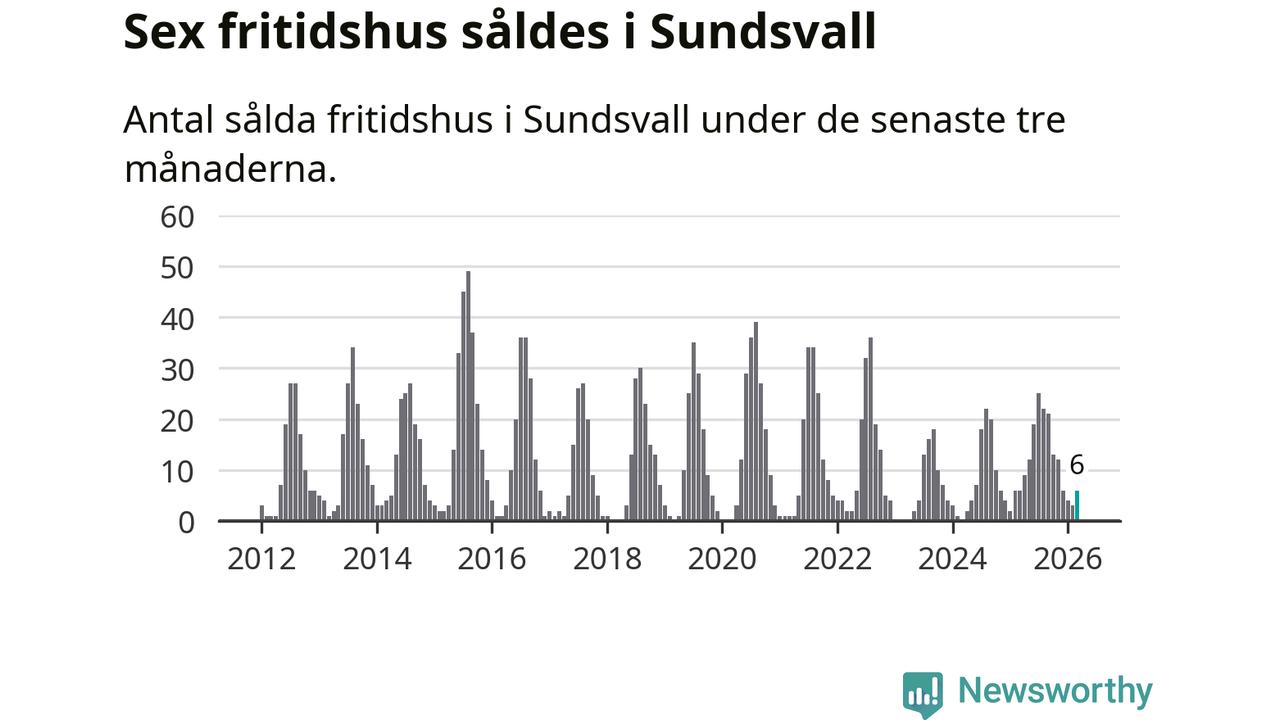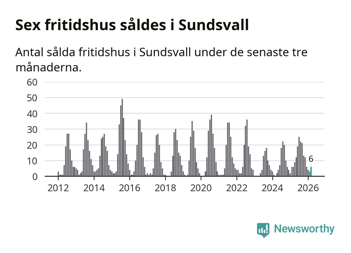Sammanlagt såldes sex fritidshus i Sundsvalls kommun mellan januari och mars till ett genomsnittligt pris på 1,8 miljoner kronor. I fjol gjordes sex affärer vid den här tiden på året.